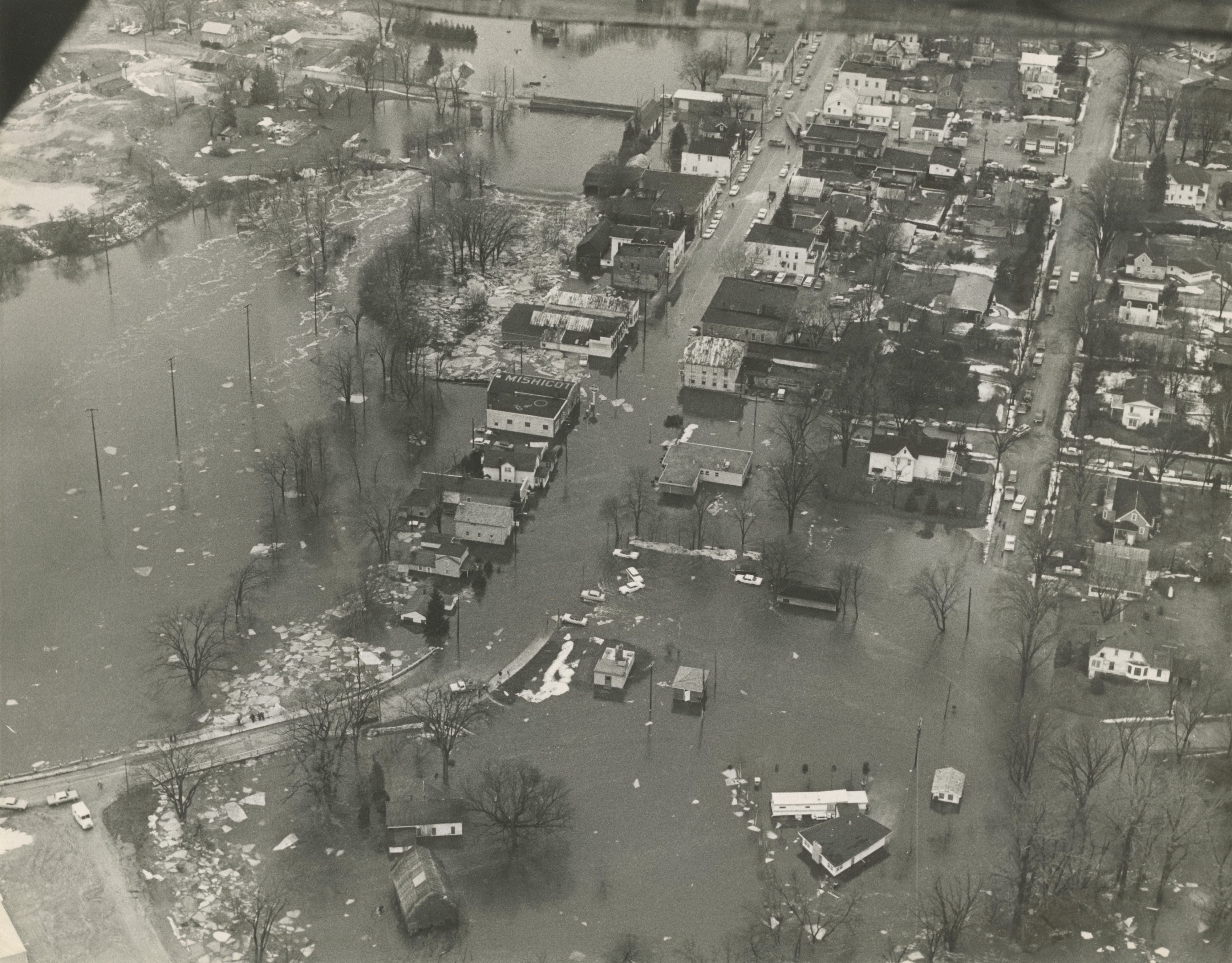 An aerial photo of Mishicot, Wisconsin taken one day after severe flooding on February 9, 1966.