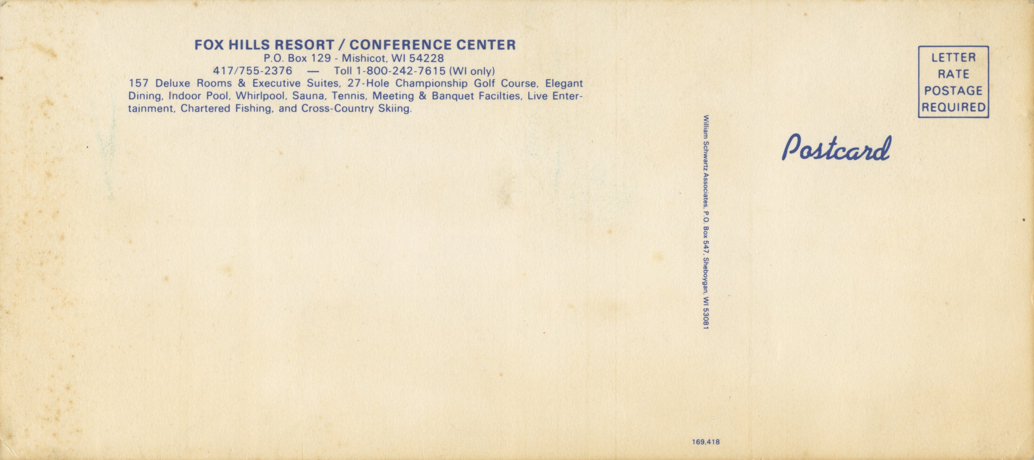 A postcard advertising Fox Hills Resort and Conference Center in Mishicot, Wisconsin.