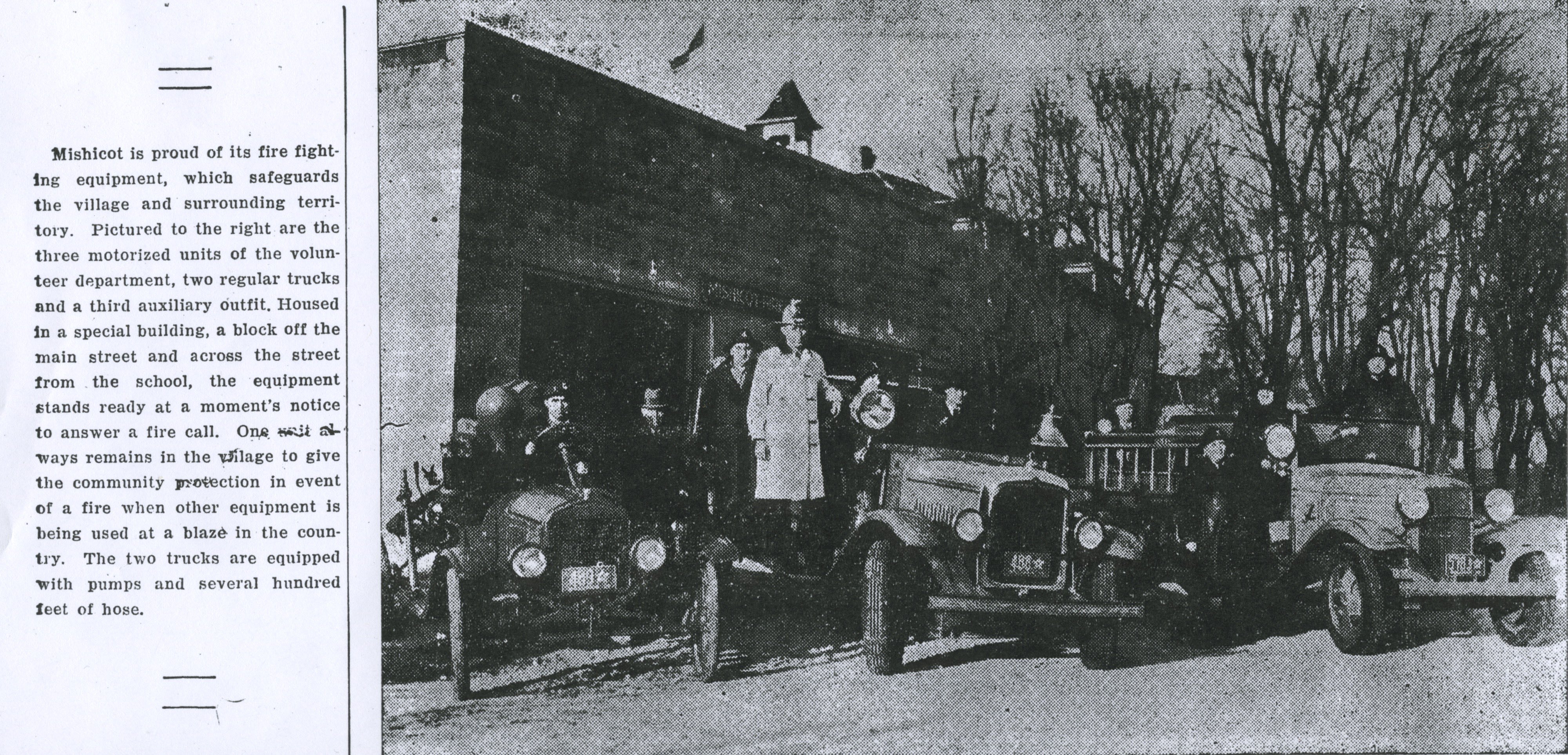 Mishicot is proud of its fire fighting equipment, which safeguards the village and surrounding territory. Pictured to the right are the three motorized units of the volunteer department, two regular trucks and a third auxiliary outfit. Housed in a special building, a block off the main street and across the street from the school, the equipment stands ready at a moment’s notice to answer a fire call. One will always remains in the village to give the community protection in event of a fire when other equipment is being used at a blaze in the country. The two trucks are equipped with pumps and several hundred feet of hose.