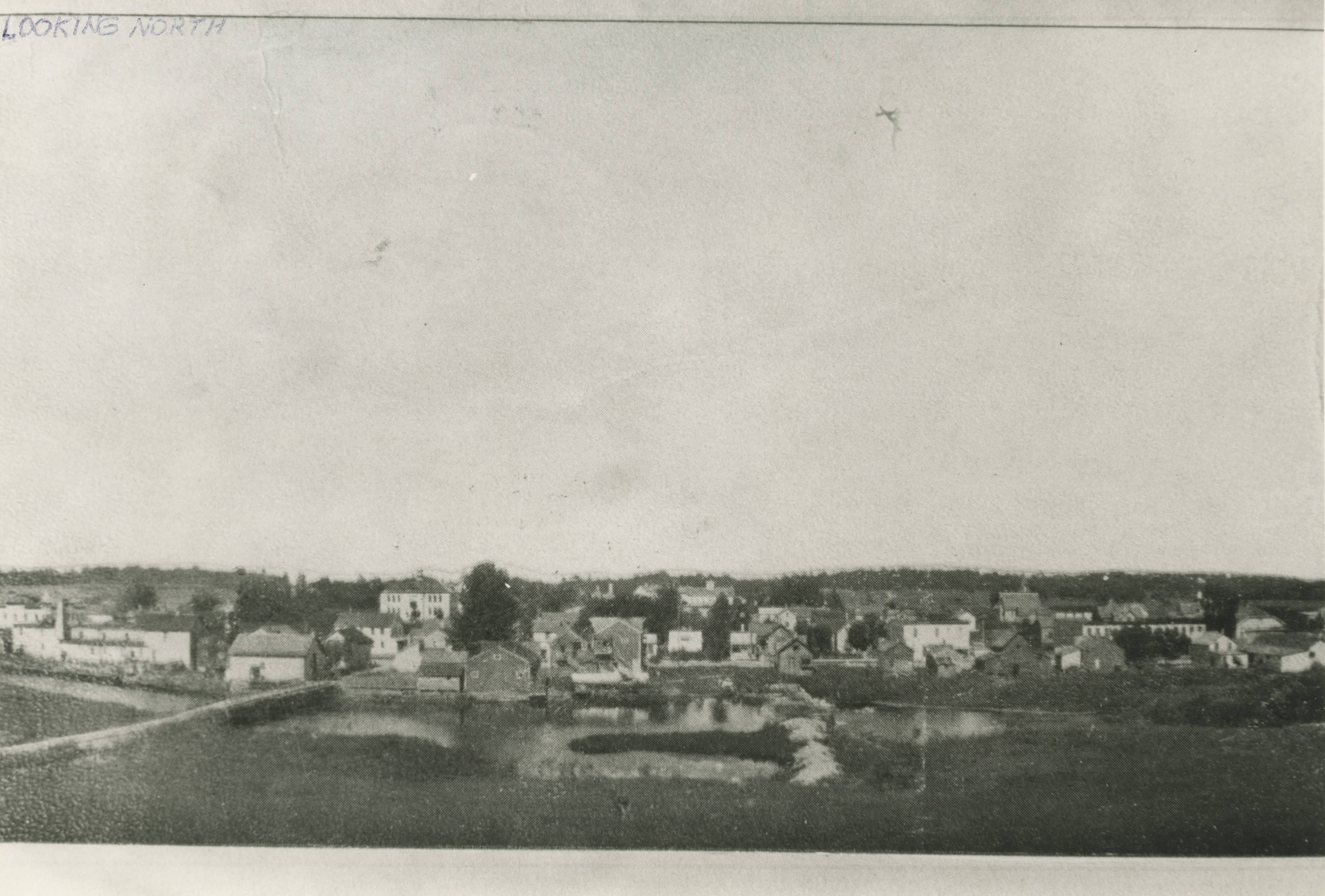 The undated face of a postcard with the handwritten caption “Looking North.” This view shows the East Twin River, Village Park grounds, Main Street, and downtown Mishicot looking north. The Rockway Bridge is visible near the bottom left of the scene, and the Rockway School is visible over the horizon above the bridge.