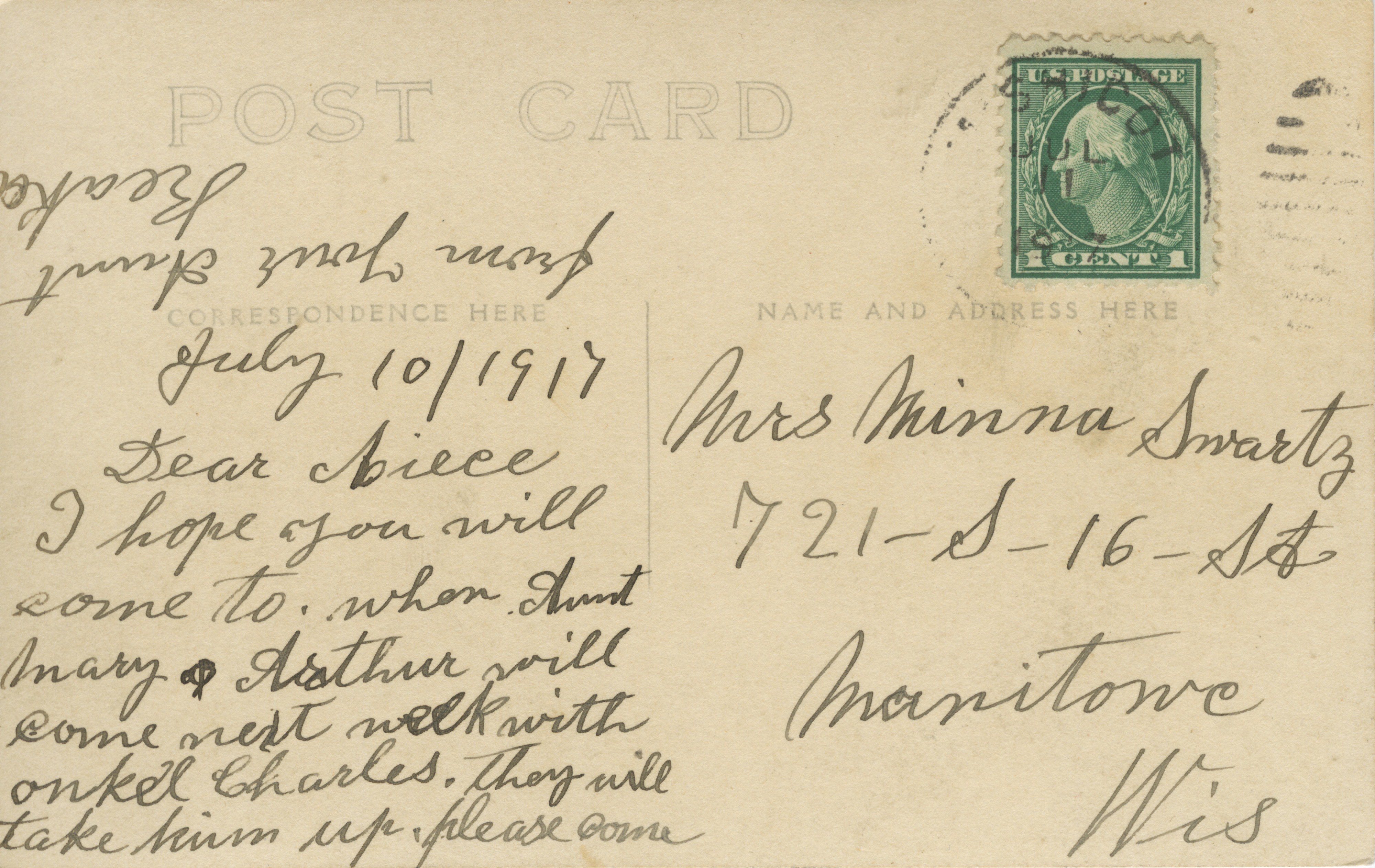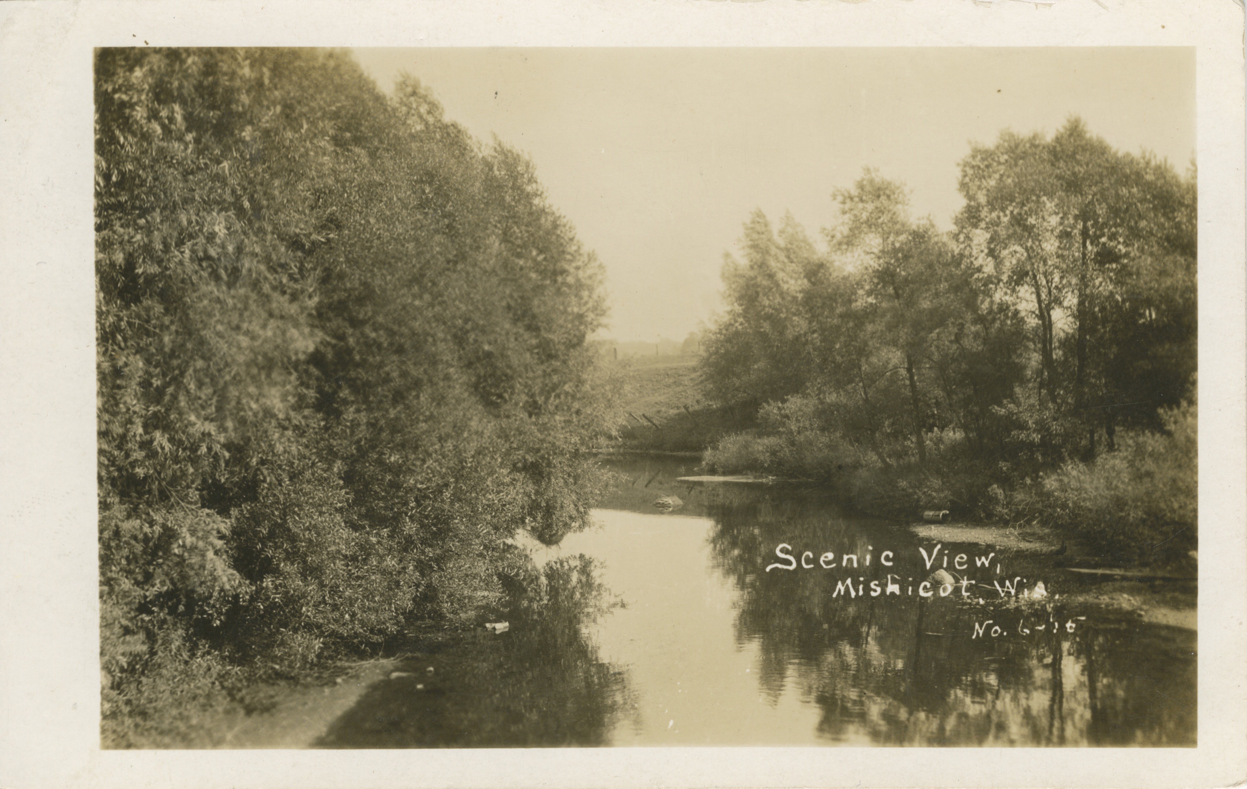Two postcards with identical images labeled “Scenic View, Mishicot, Wis. No. 6- 15′” The image was shot in 1915, and the postcards were sent to Two Rivers and Manitowoc in 1916 and 1917.