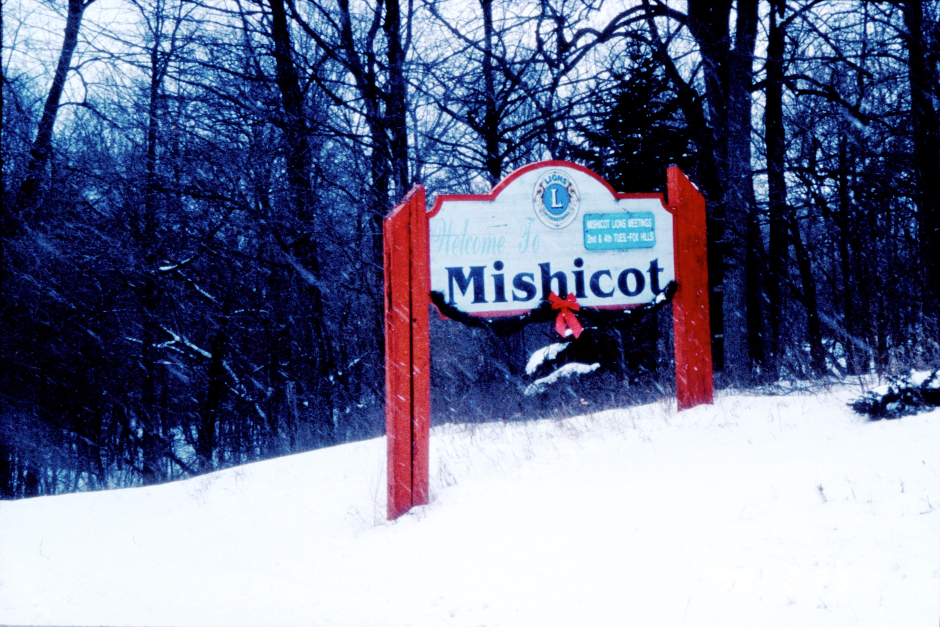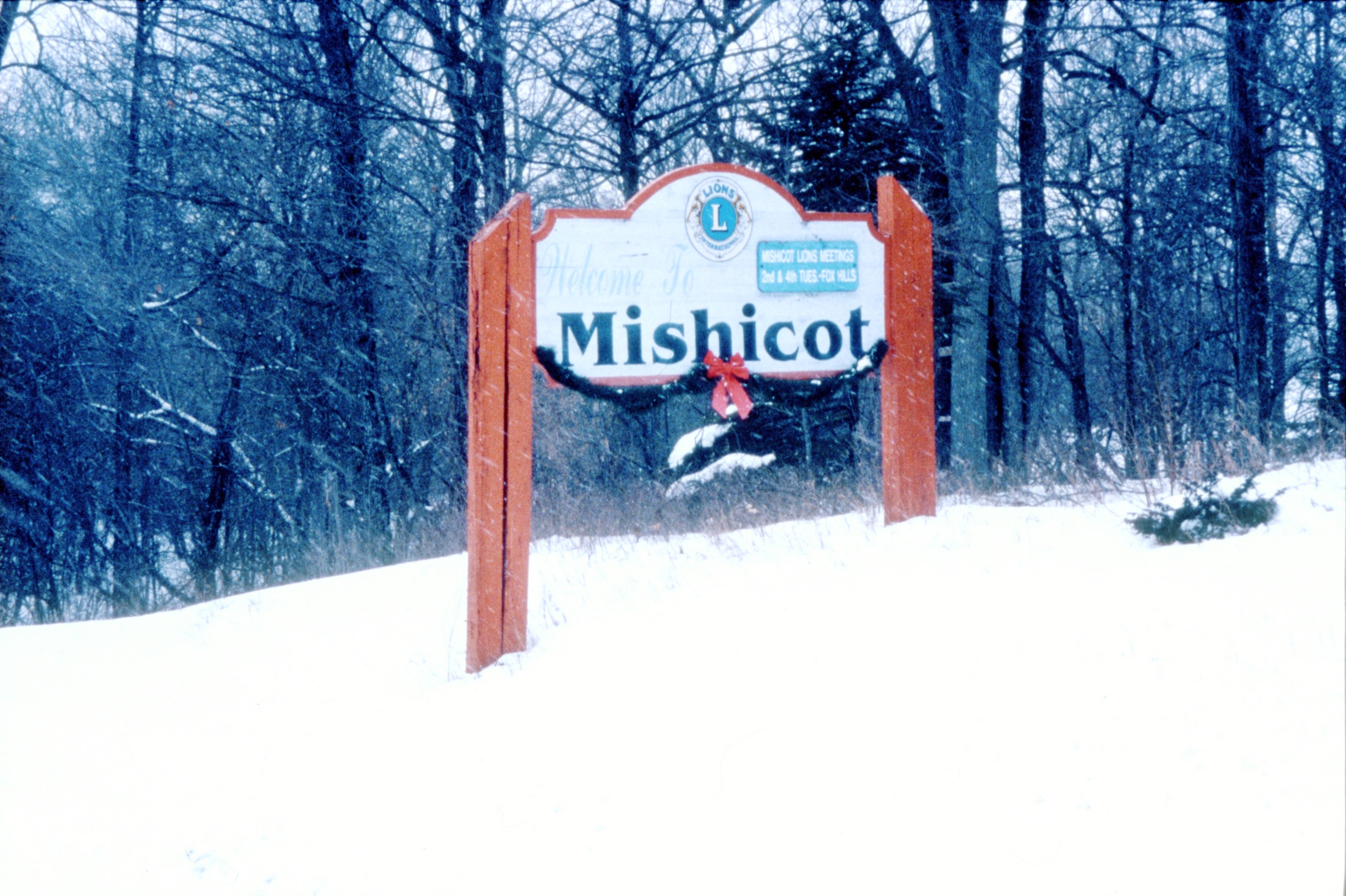 The Mishicot Lions “Welcome To Mishicot” sign on the north side of Randolph Street, shot in winter. These photos are undated.