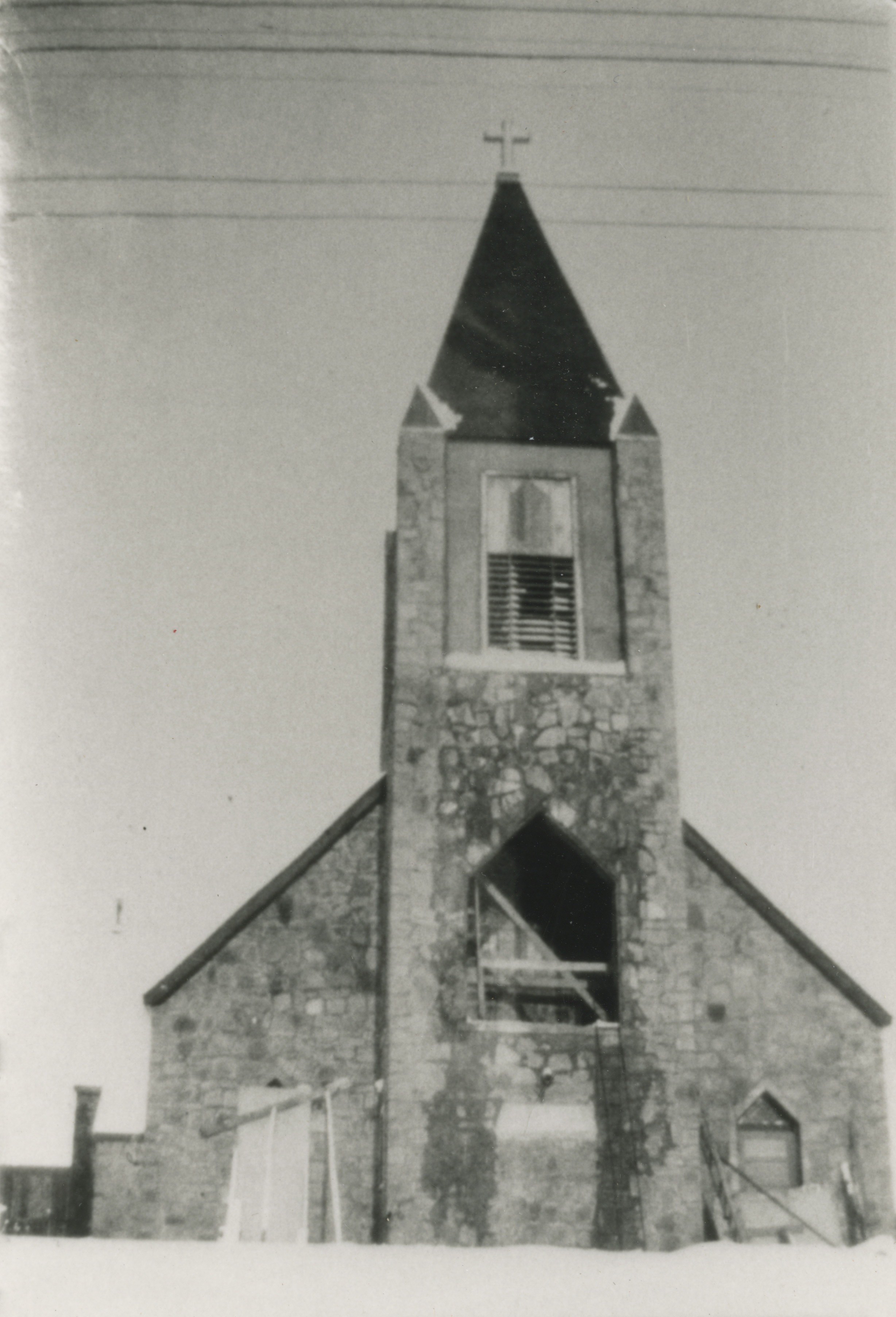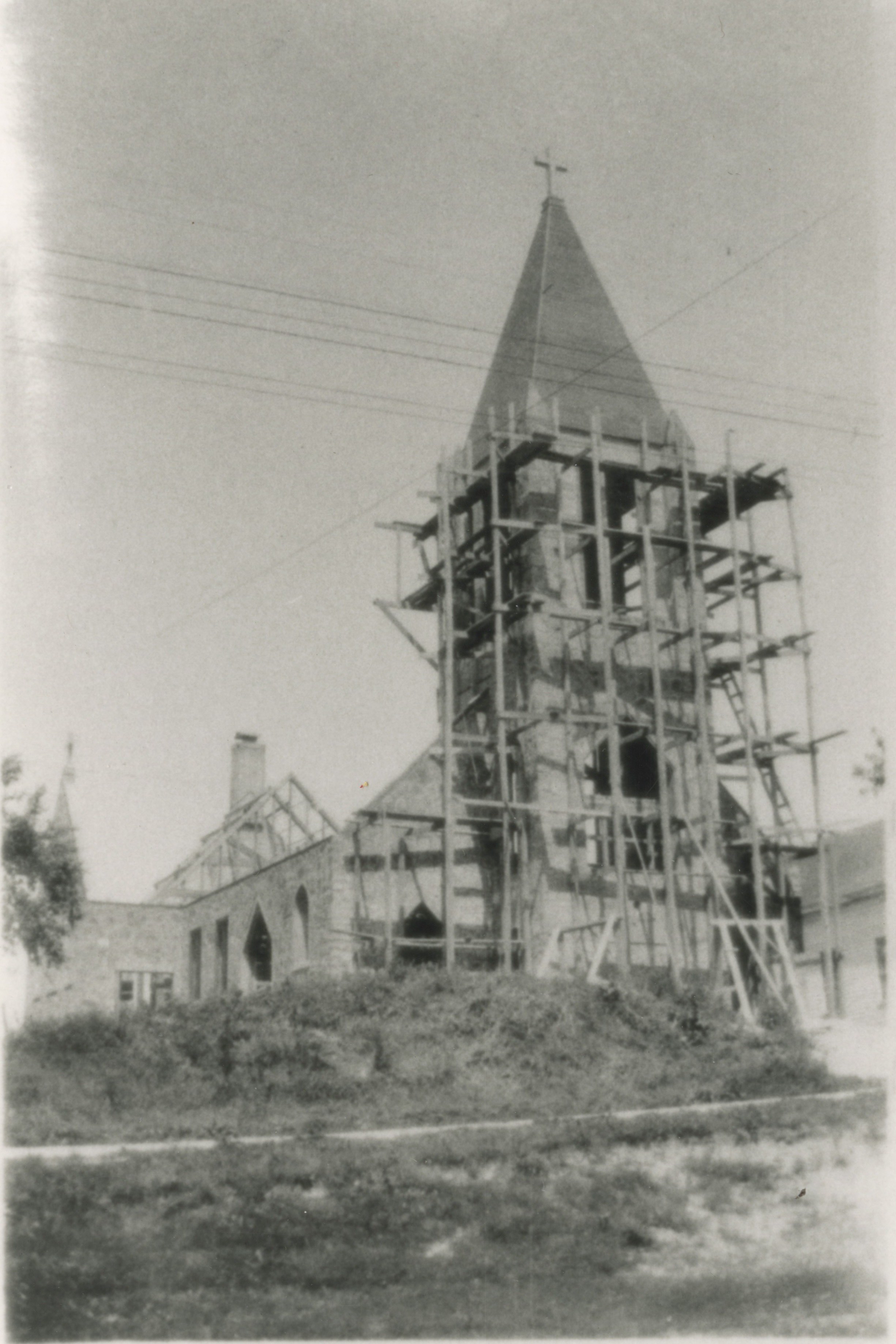 Four photos depicting construction of St Peter’s Lutheran Church on Randolph Street in Mishicot, Wisconsin.