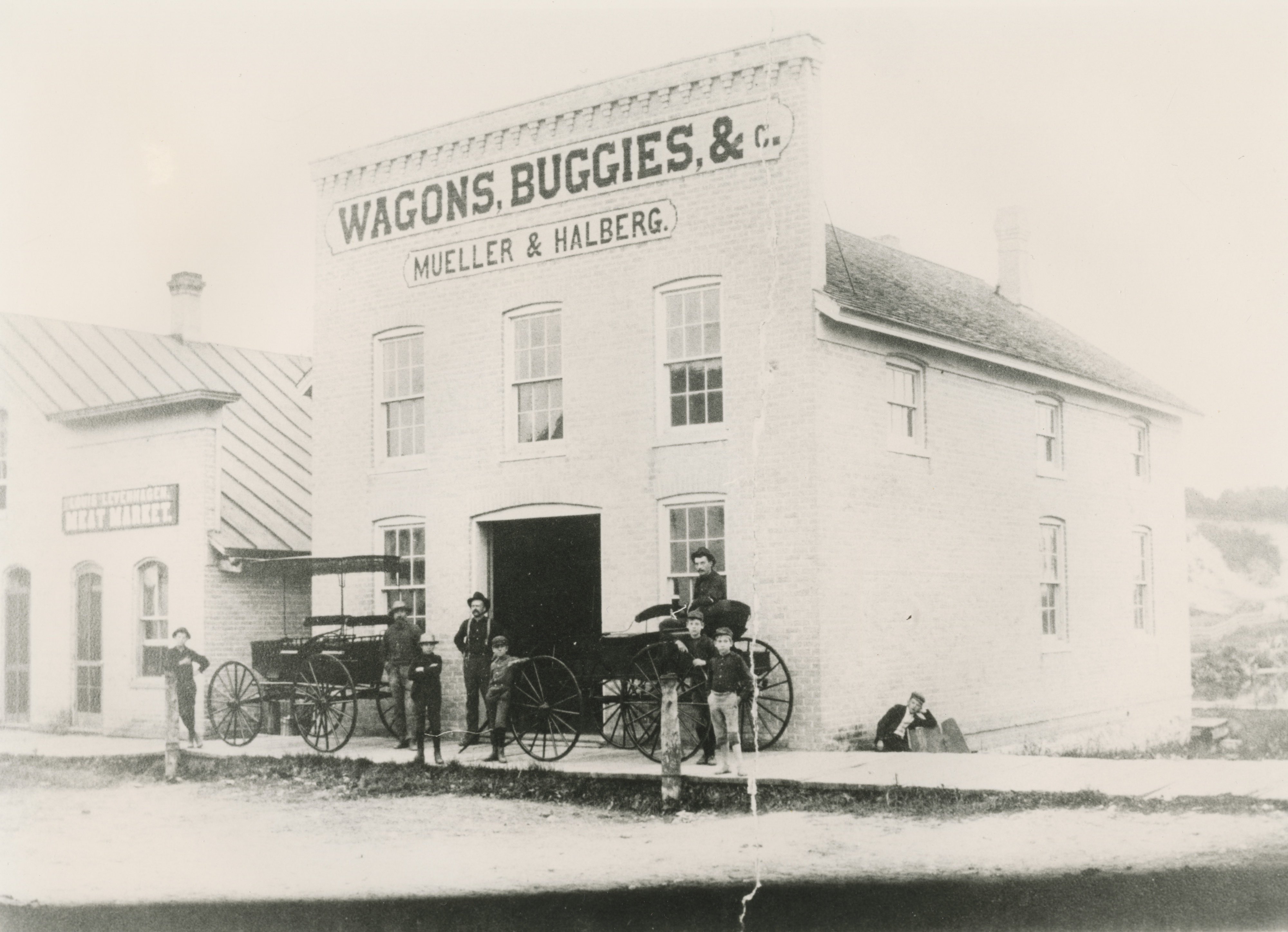 Two versions of the same photo of Mueller & Halberg Wagons, Buggies & C. at 322 E Main Street, Mishicot, Wisconsin.