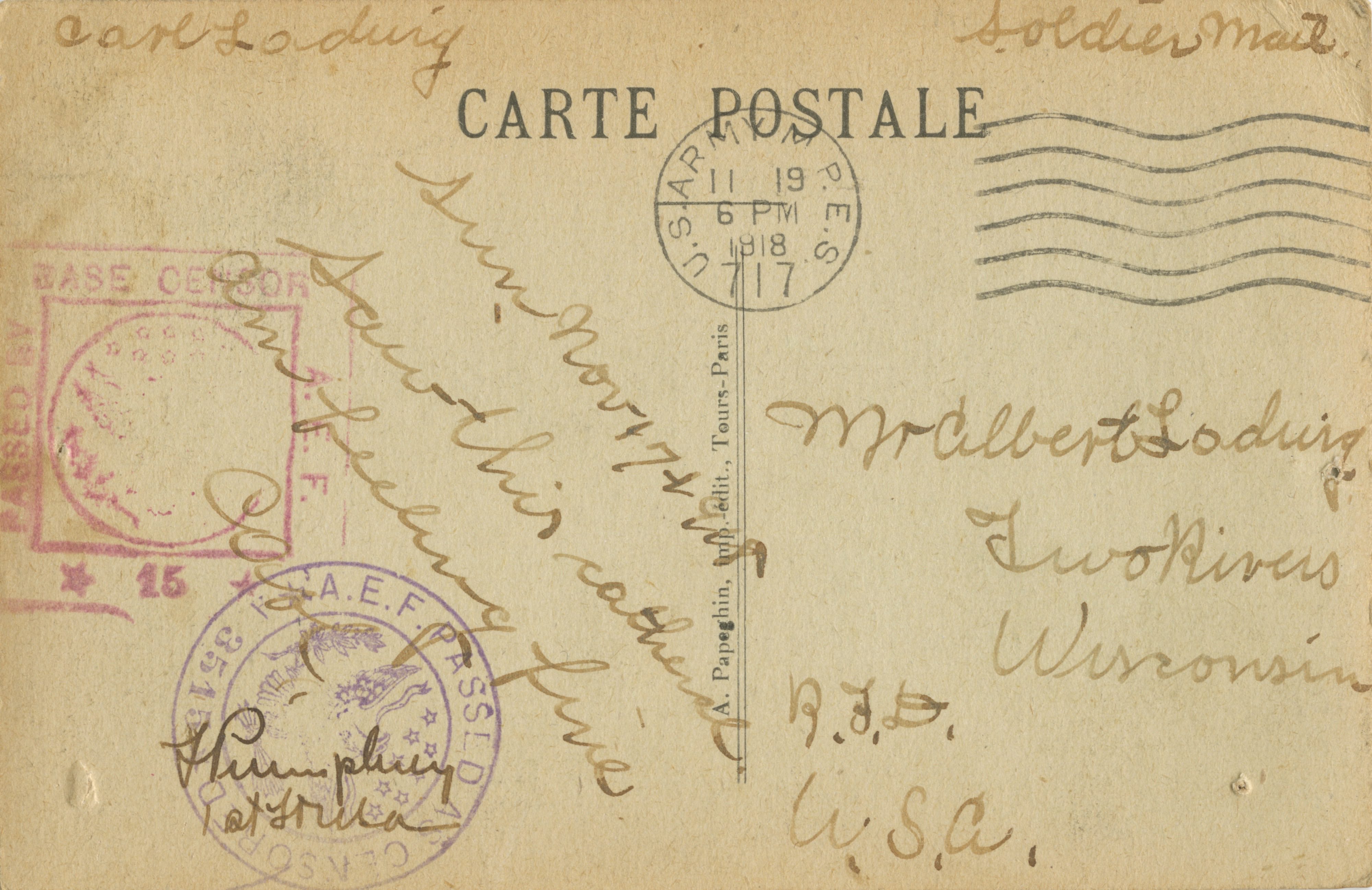 A World War I-era 1918 postcard addressed to Albert Lodwig of Two Rivers, Wisconsin.