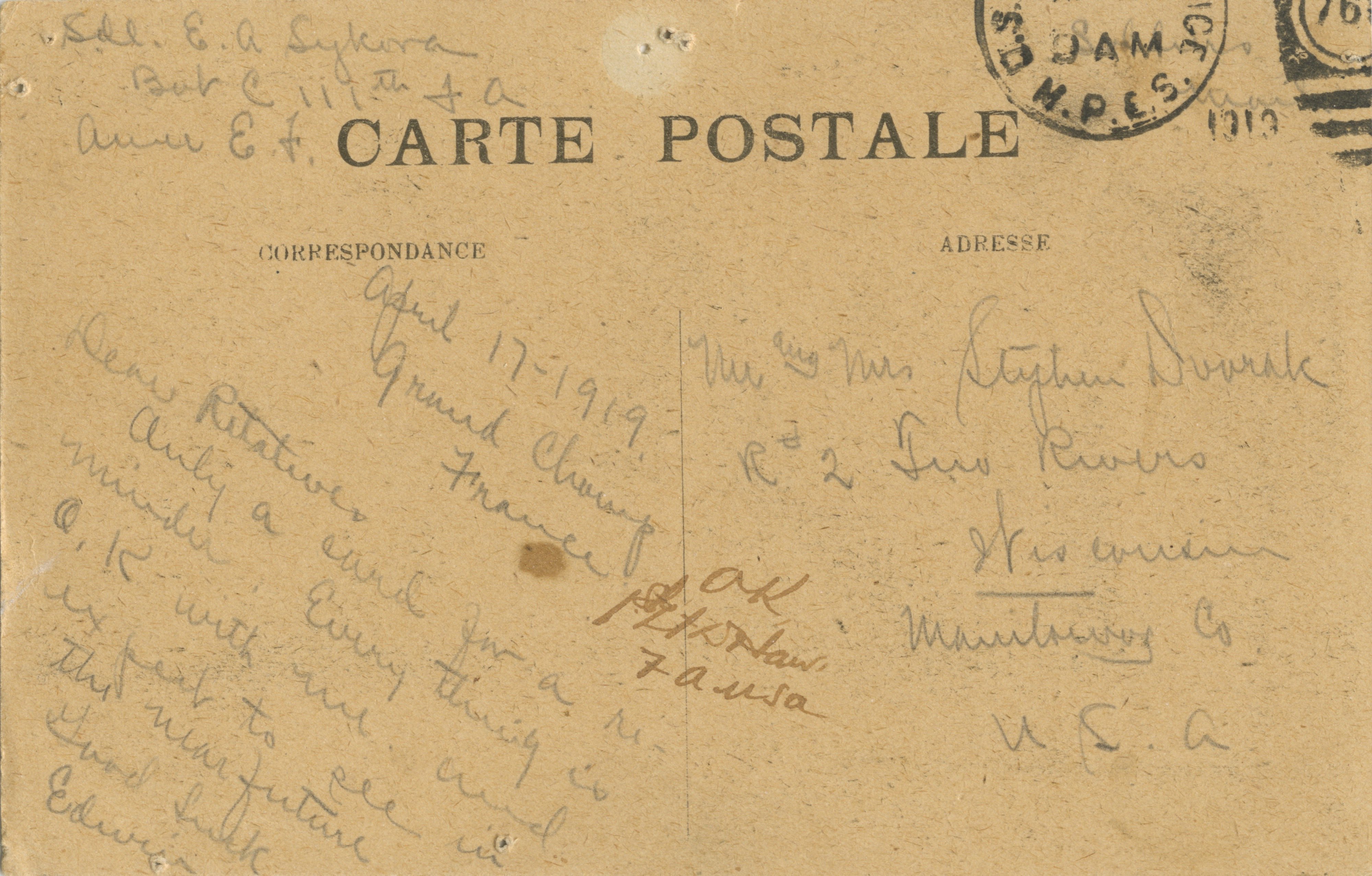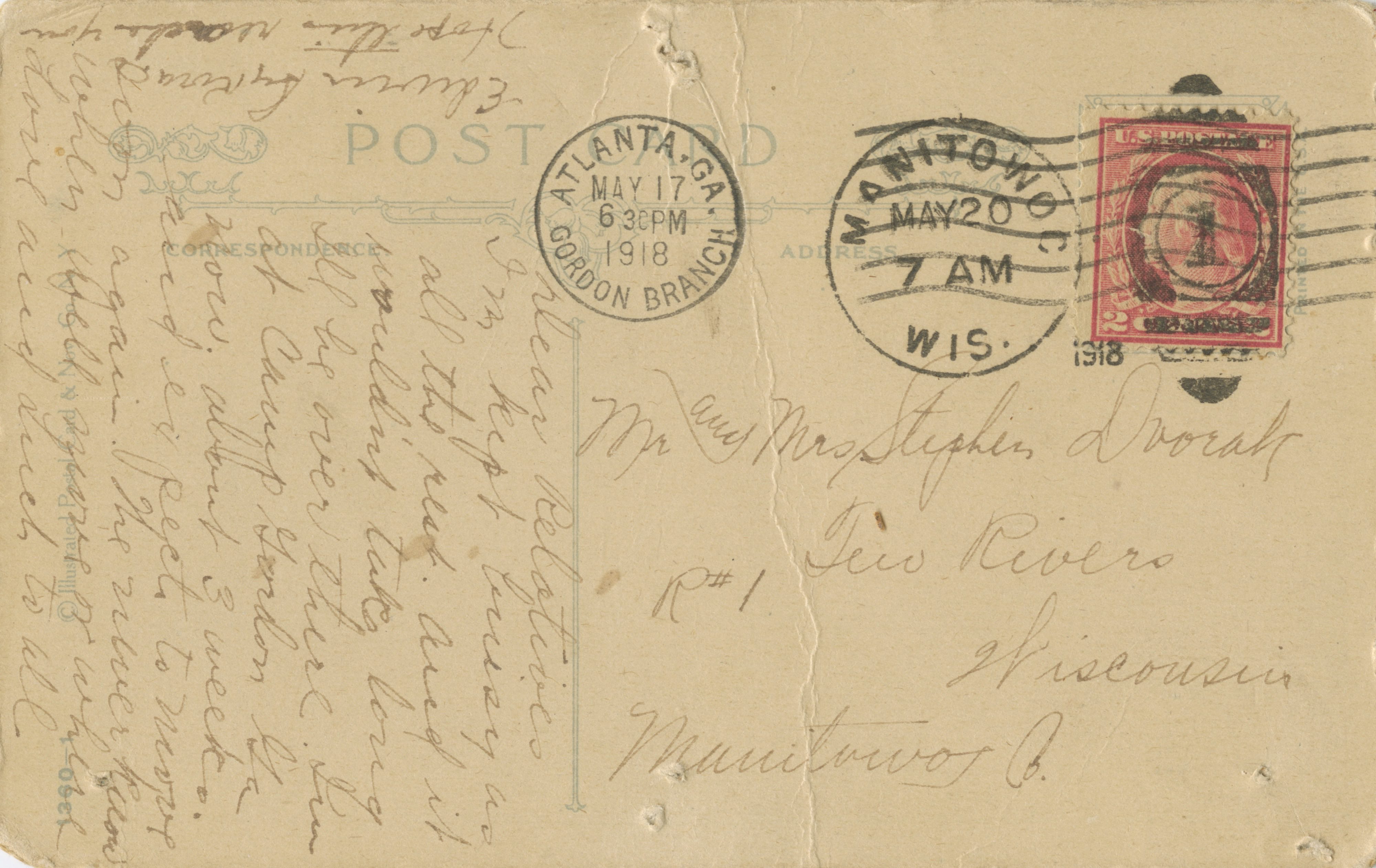 Four World War I-era 1918–1919 postcards addressed to Stephen Dvorak and family of Two Rivers, Wisconsin.