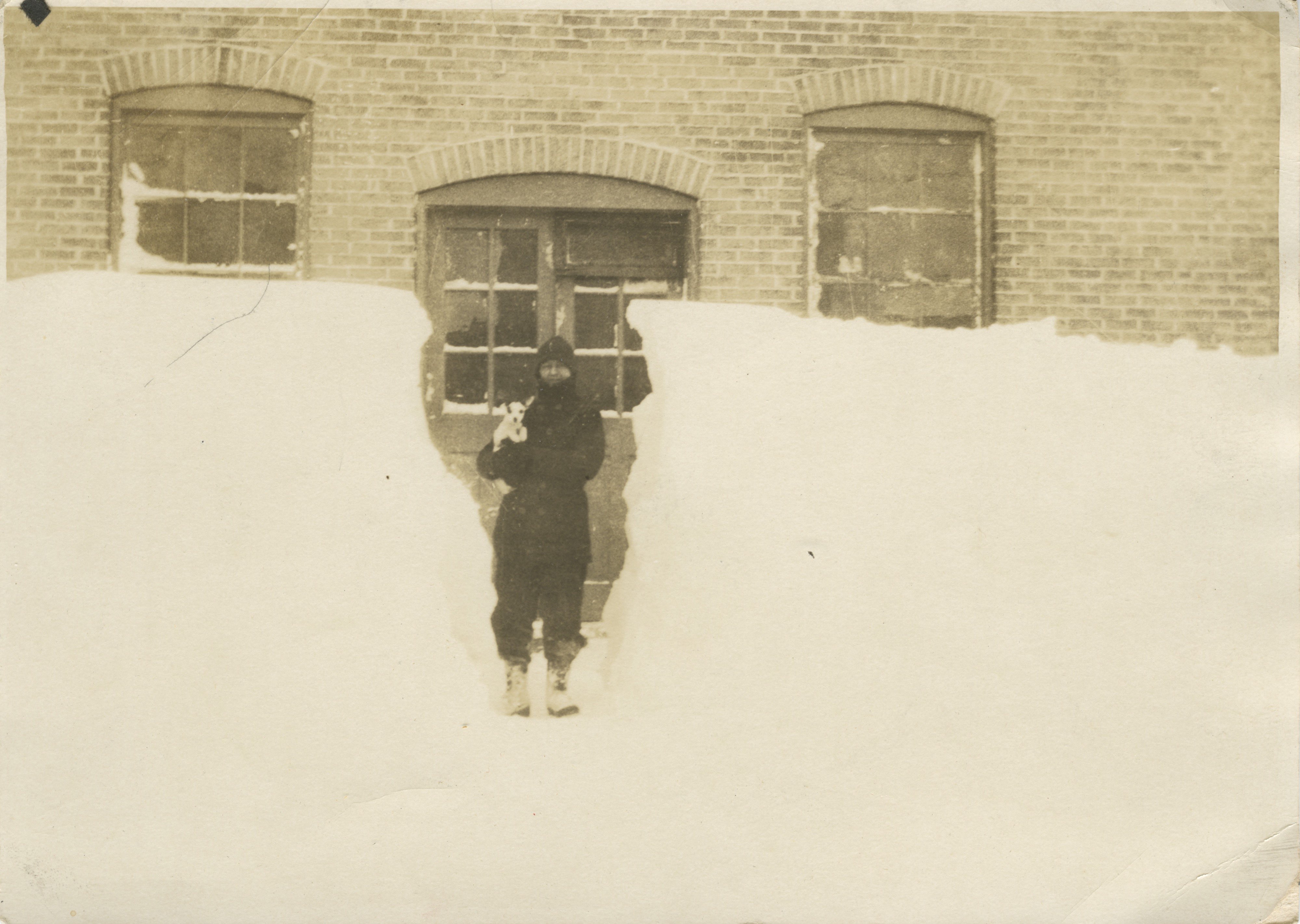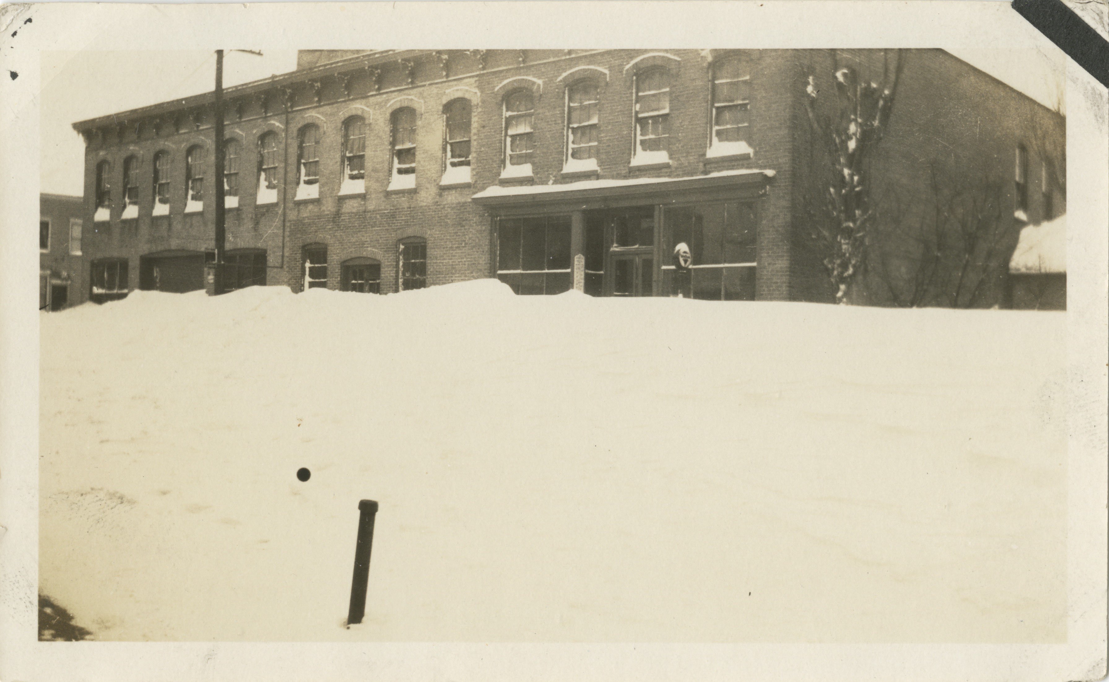 Two undated photos of the Terens Hardware Building, 447 E Main Street, after snow storms. The first photo has a handwritten label on the back that reads “Nora + Skippy.”