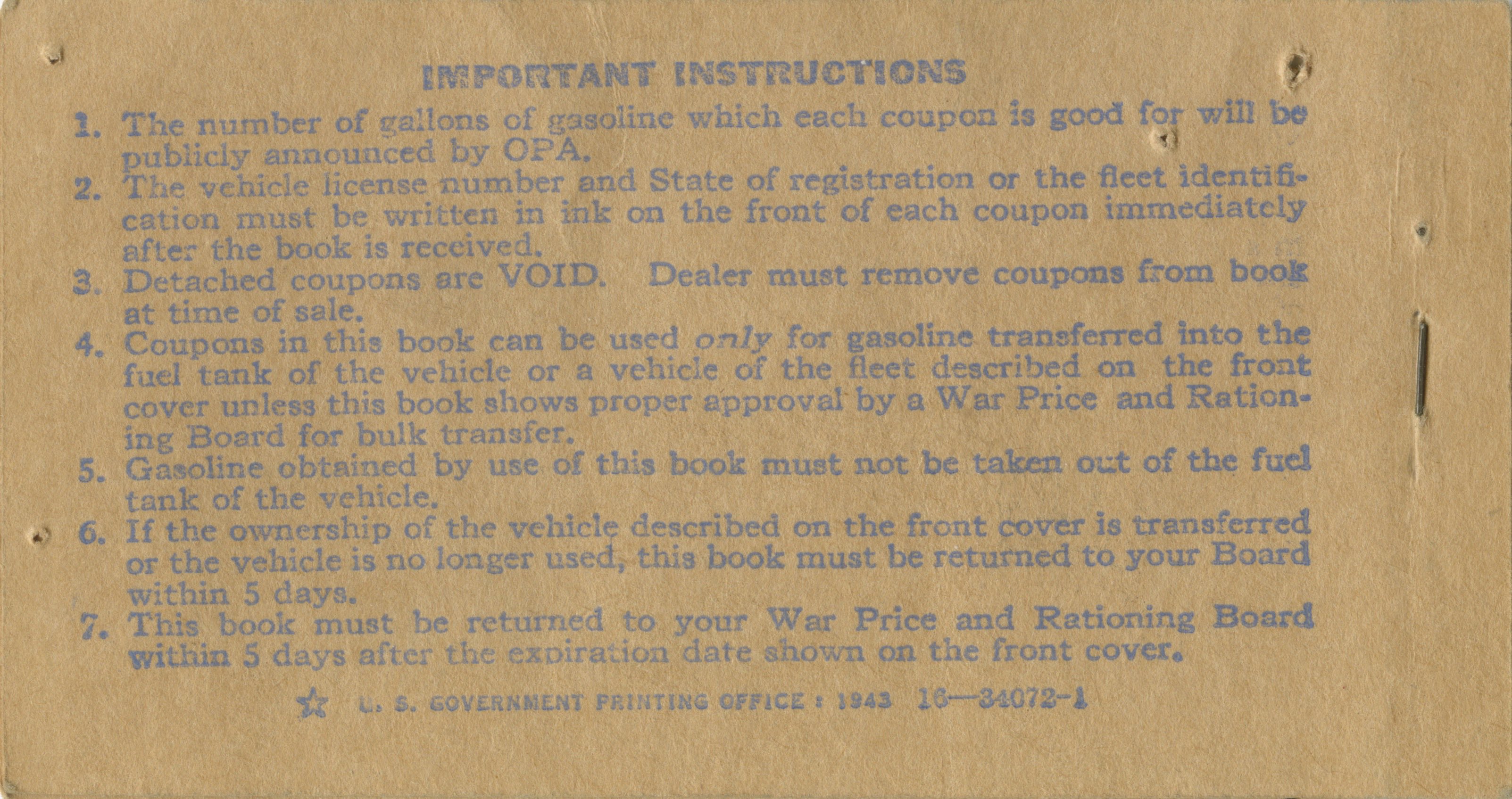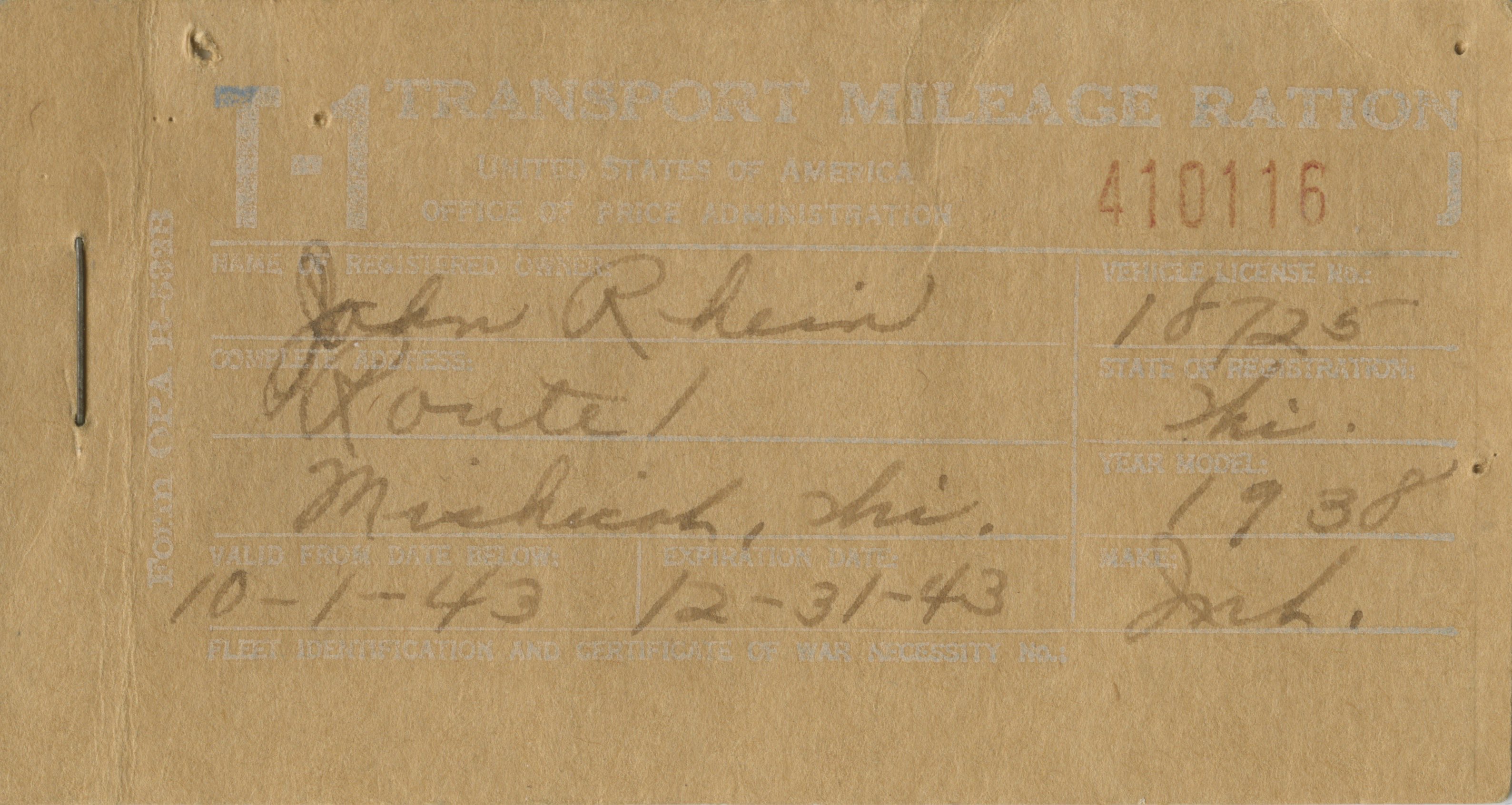 A World War II Transport Mileage Ration Book issued to John Rhein of Mishicot, Wisconsin in 1943.