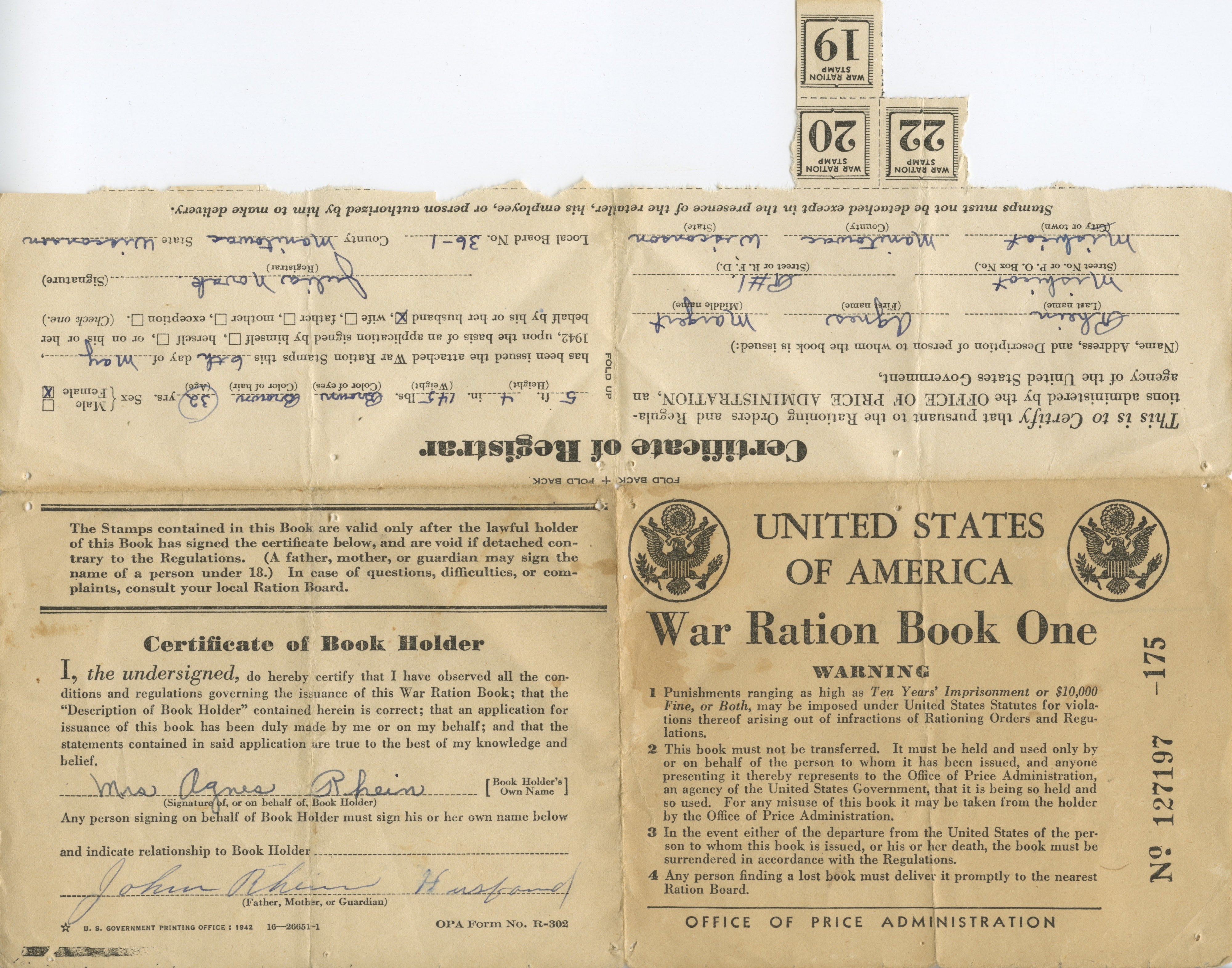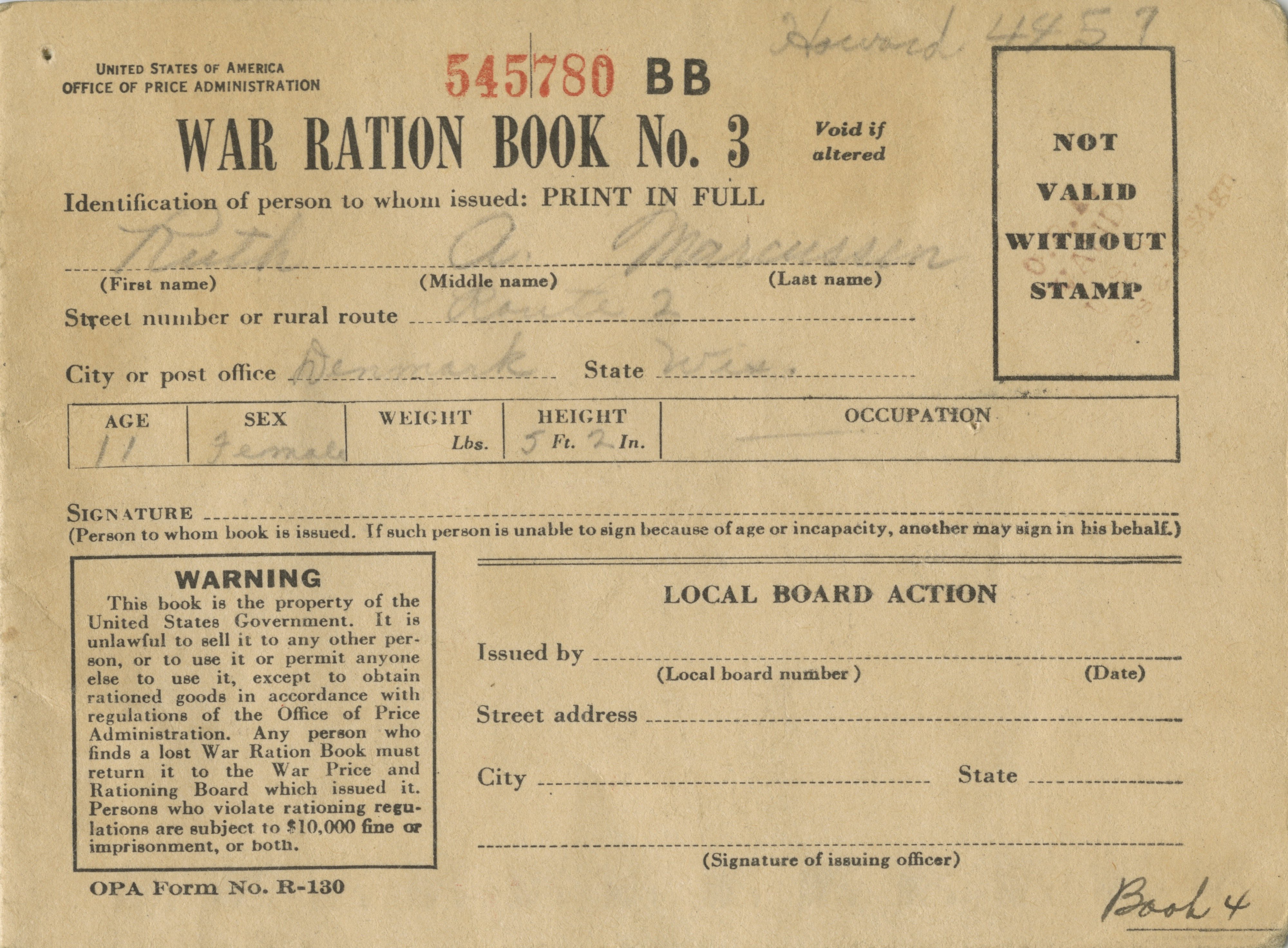 World War II War Ration Books issued to Agnes Rhein of Mishicot, Wisconsin, Ruth Marcussen of Denmark, Wisconsin, and Ida Marcussen of Denmark, Wisconsin.