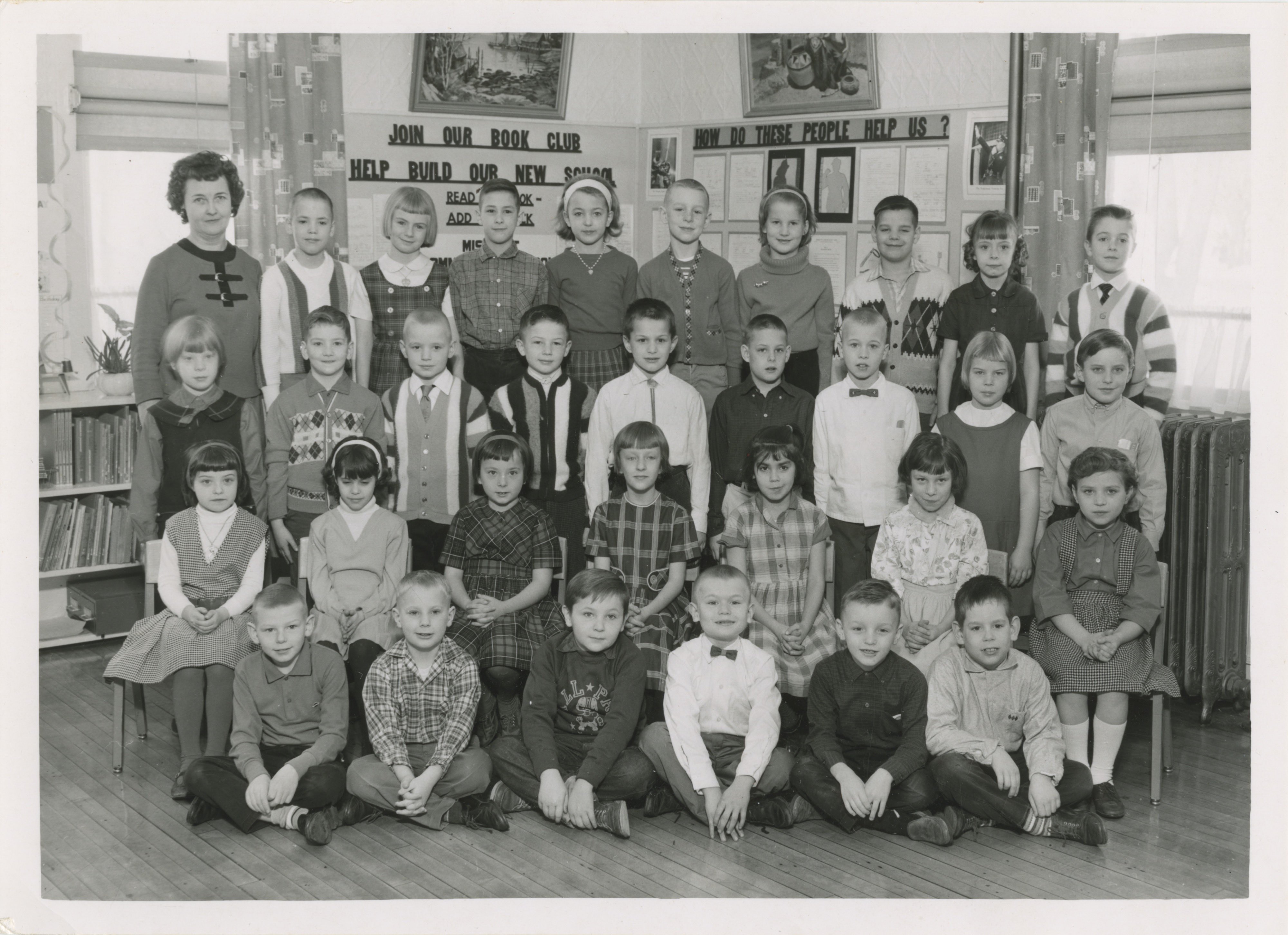 A group photo of a class of 31 students and their teacher, Mrs. Emma Cisler. The photo was taken at the Rockway School on Elizabeth Street in Mishicot, Wisconsin. On the wall behind the students is a bulletin board with the title, “Join Our Book Club. Help Build Our New School.”