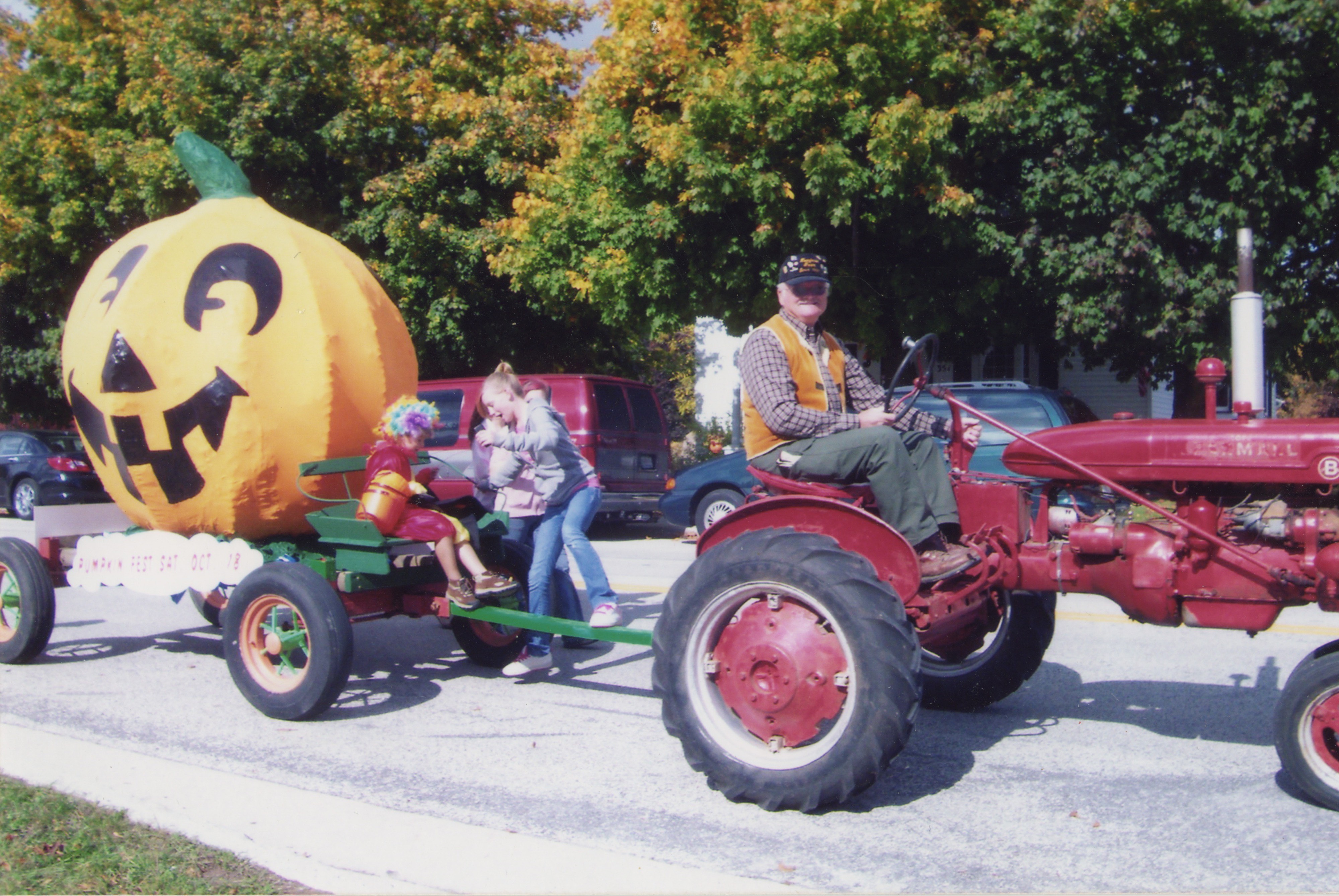A photo of Gale Kronforst driving a tractor carrying a giant pumpkin in the 2008 Mishicot Pumpkinfest parade.