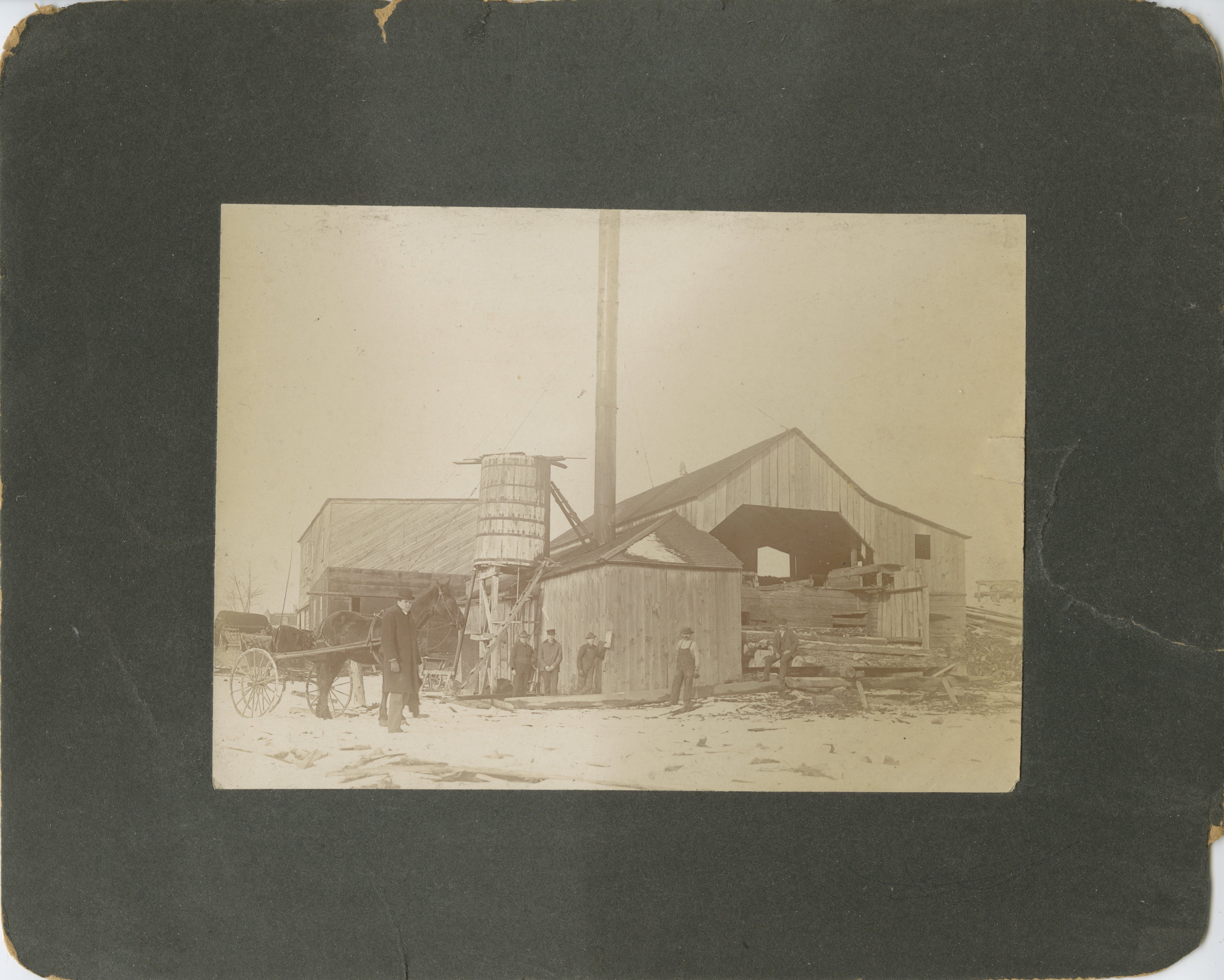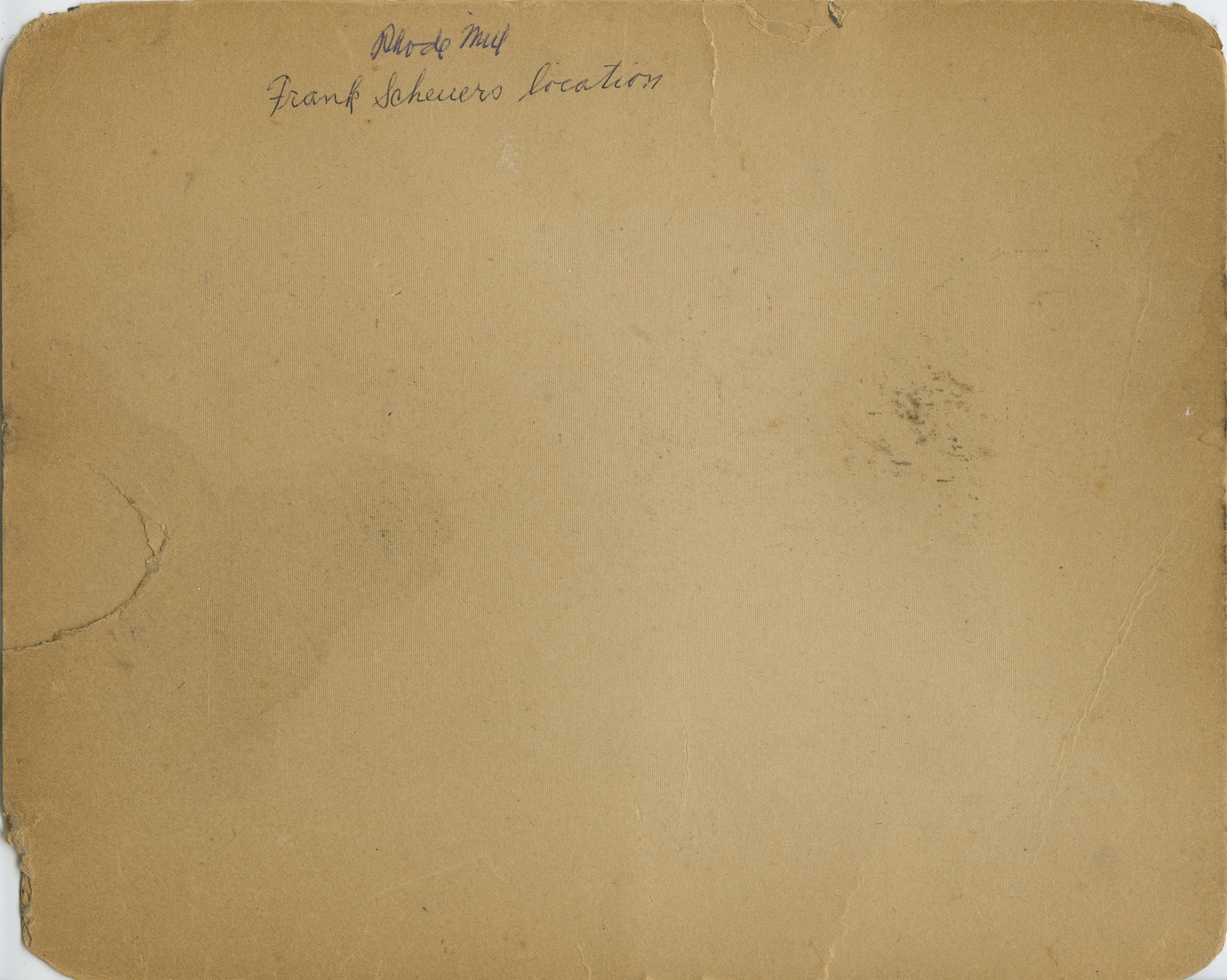 An undated photo of the Rhode Mill near the intersection of Elizabeth and Washington Streets in Mishicot, Wisconsin. On the back is a handwritten caption that reads, “Rhode Mill Frank Scheuer’s Location” (approximately 527 Elizabeth Street). This image comes from the estate of Michael Scheuer.