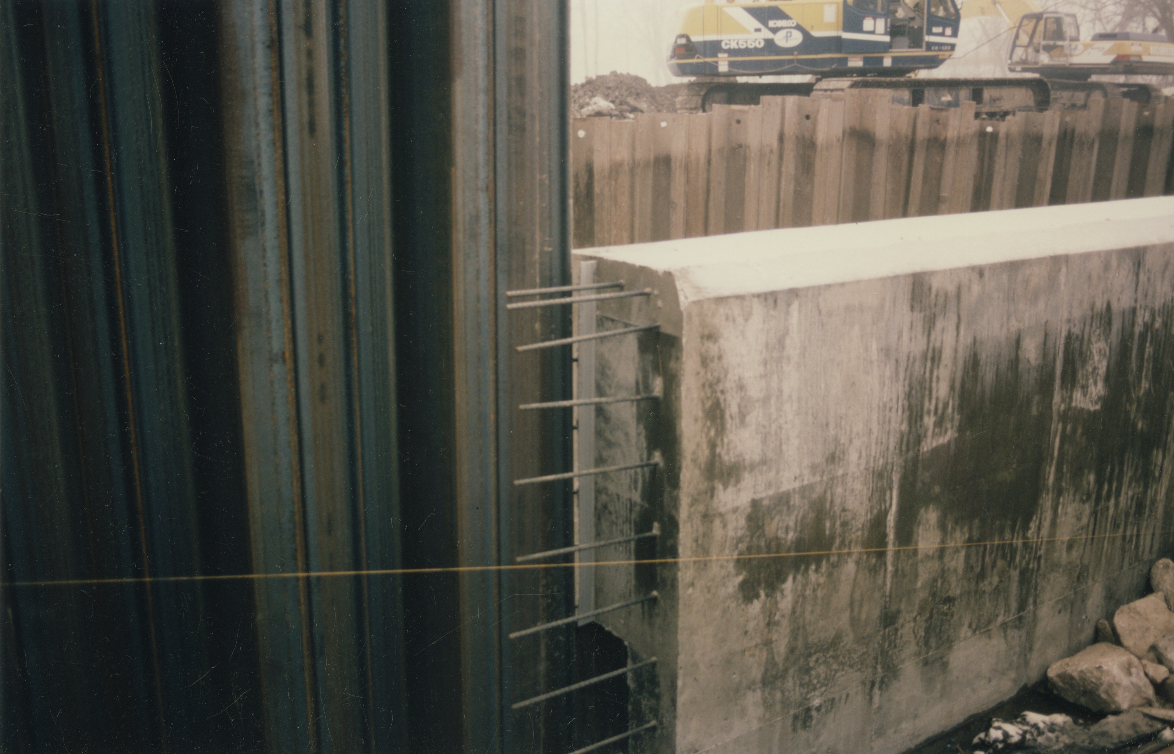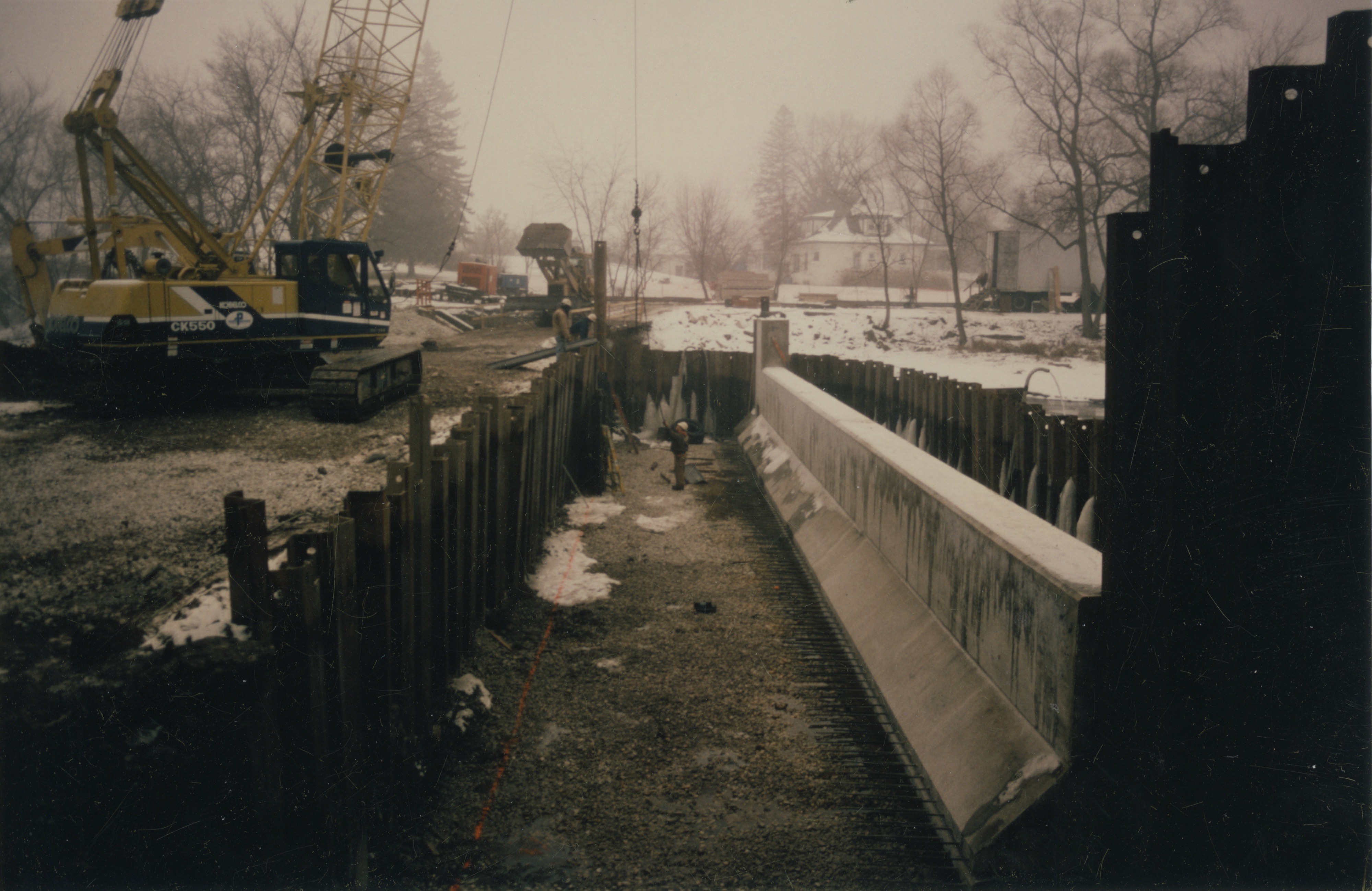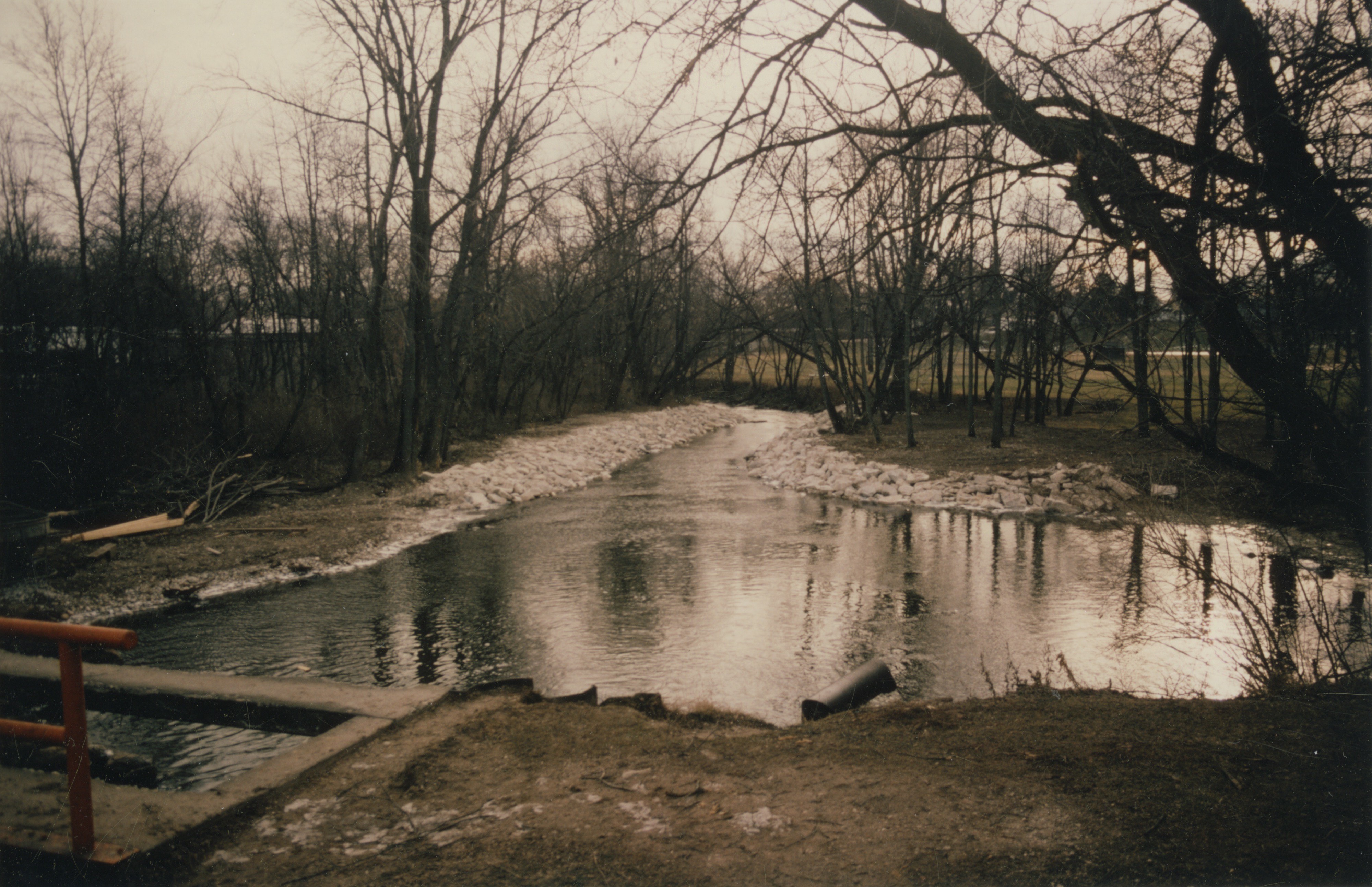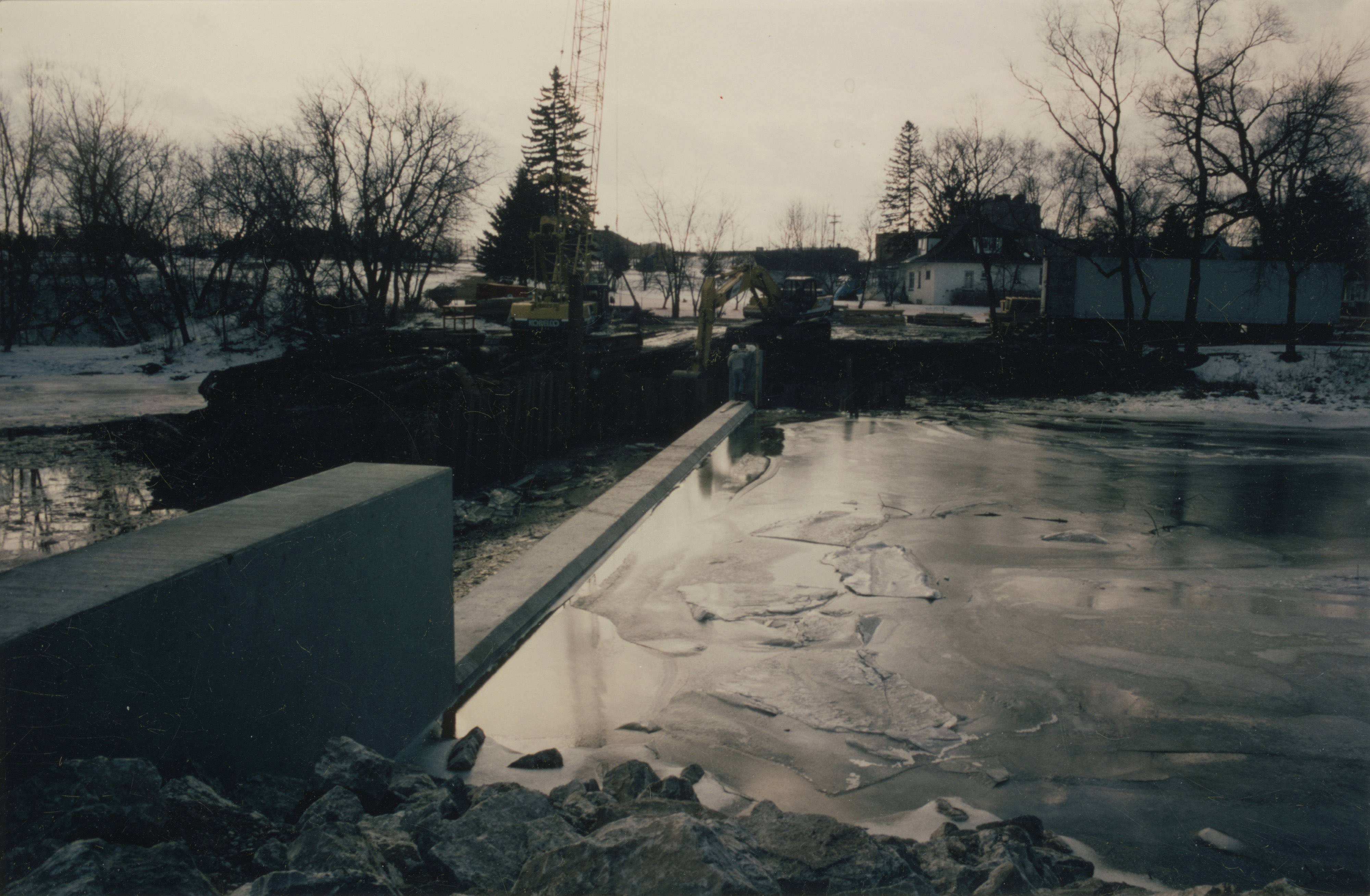 Construction of a new dam over the East Twin River in Mishicot, Wisconsin in 1995. Three photos depict the dam after construction was completed.