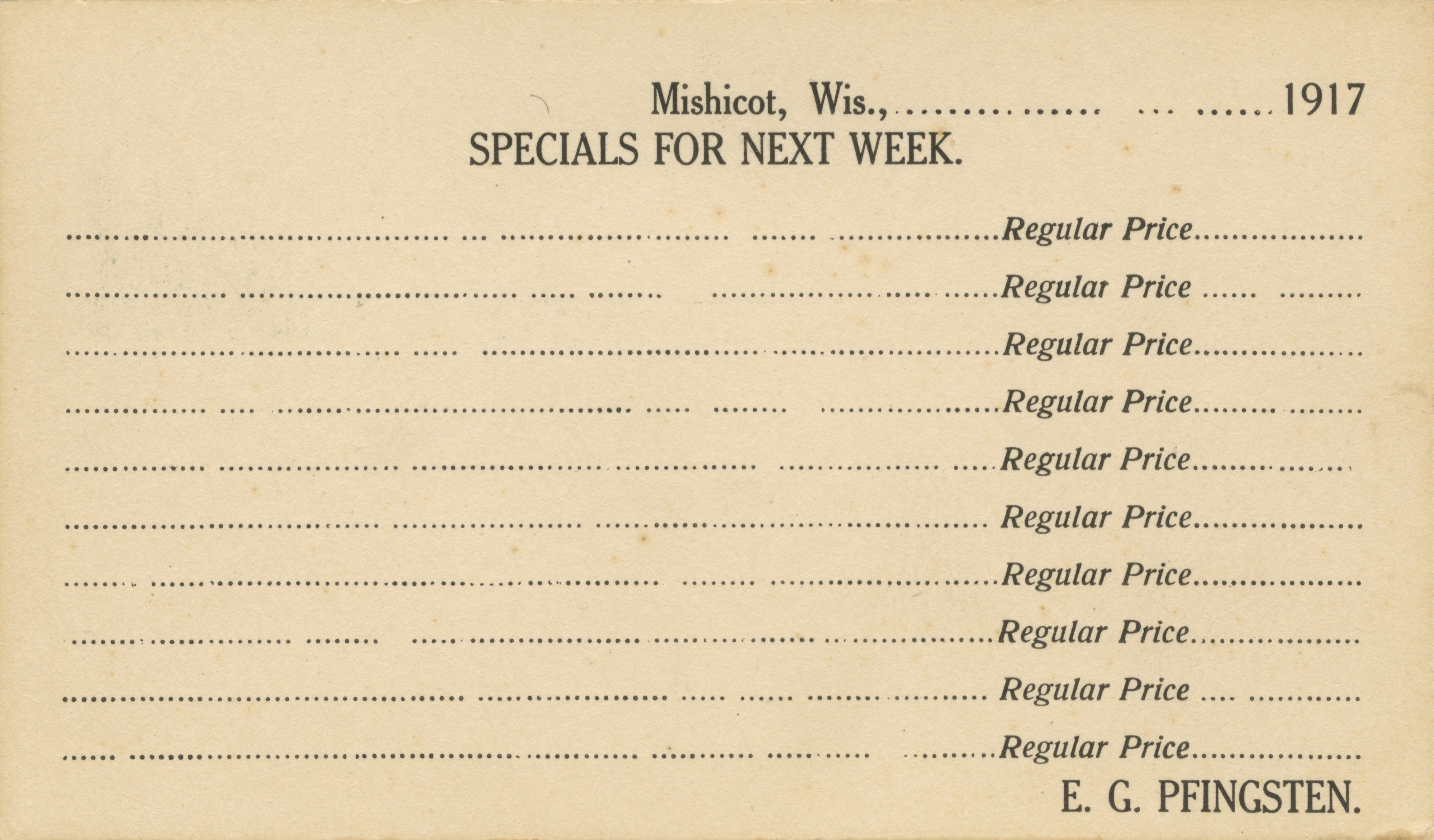 An unused, double-sided postcard for advertising store specials at the Pfingsten Bros. Grocery Store in Mishicot, Wisconsin. The card is dated 1917 and the text “E.G. Pfingsten” appears at the bottom.