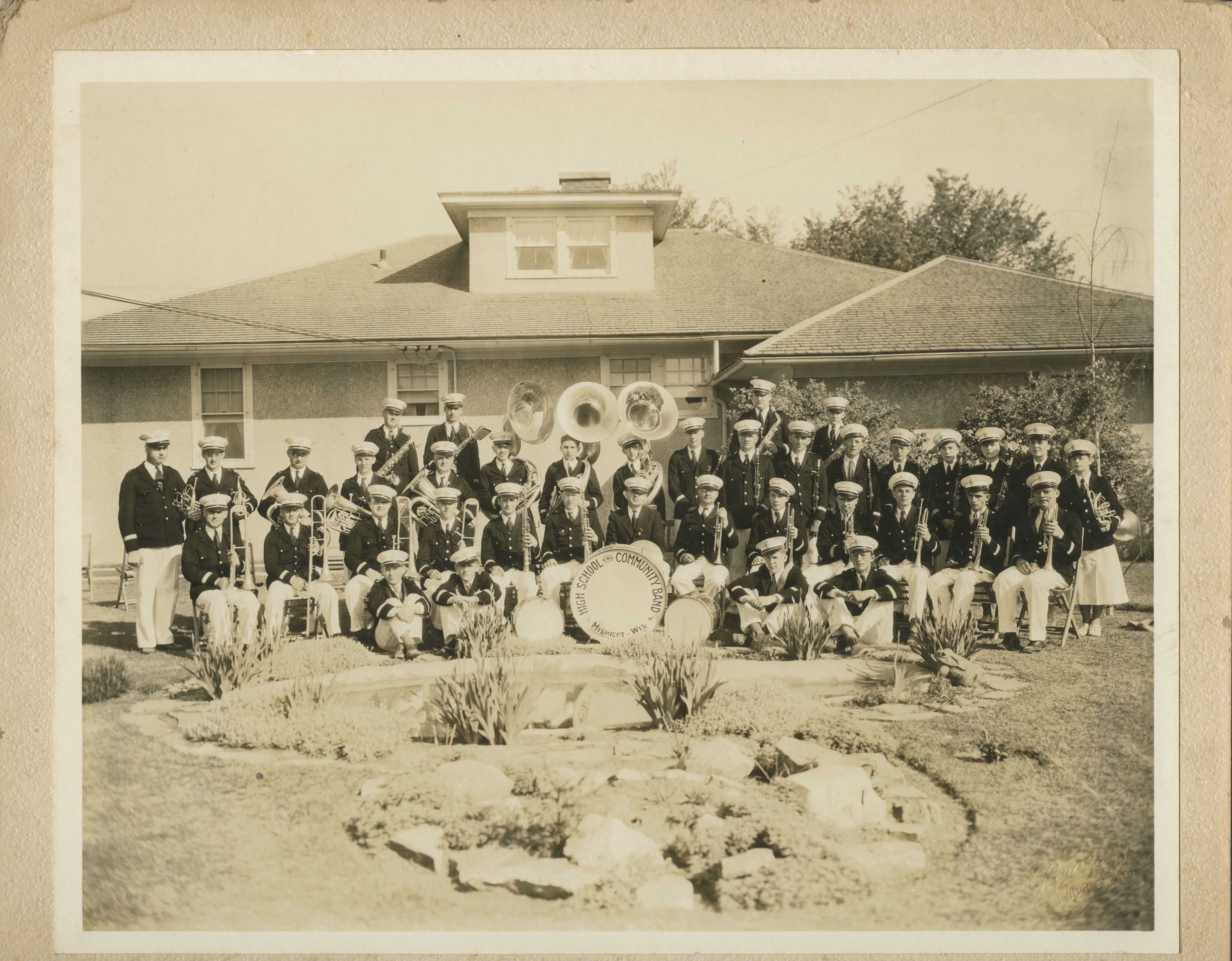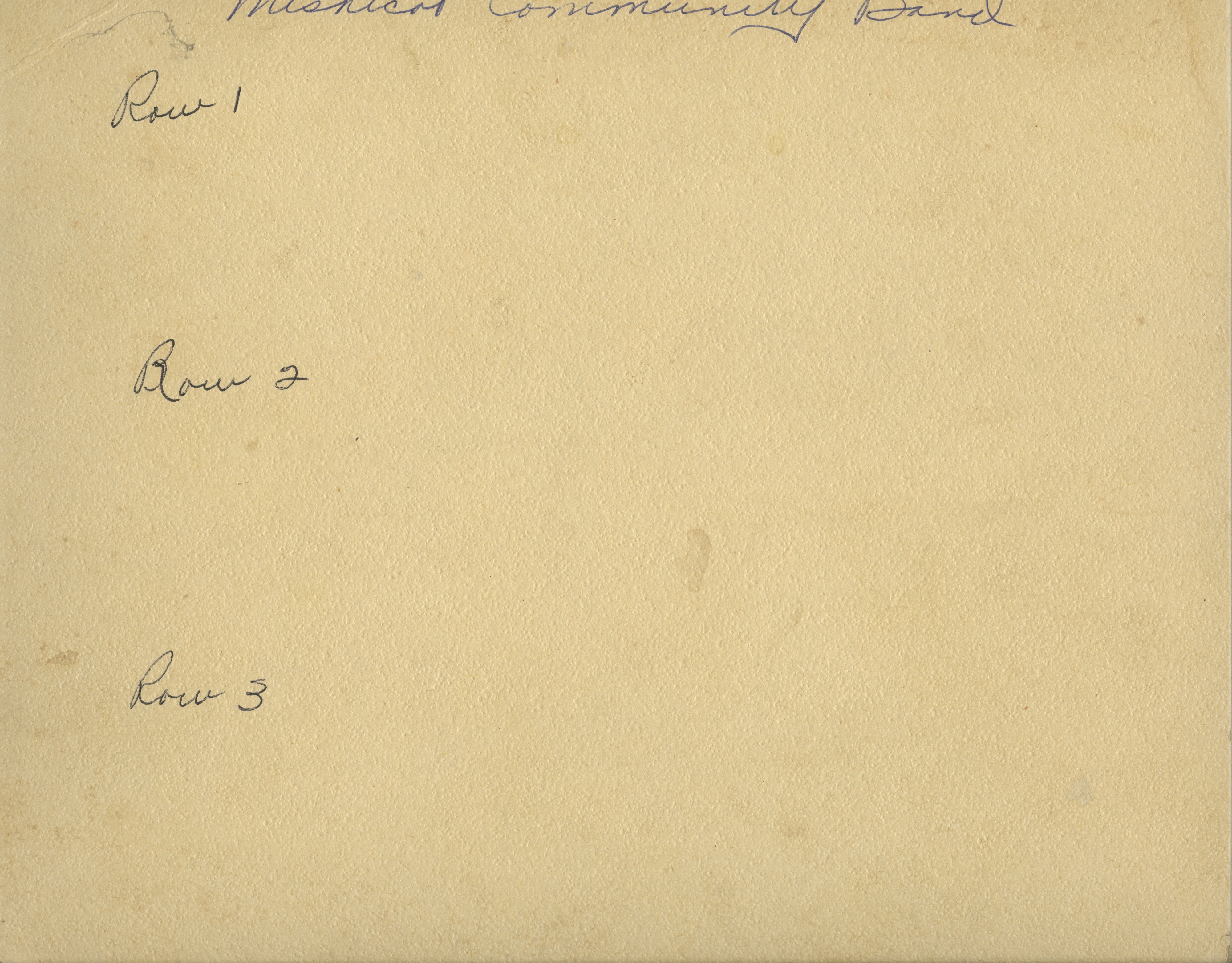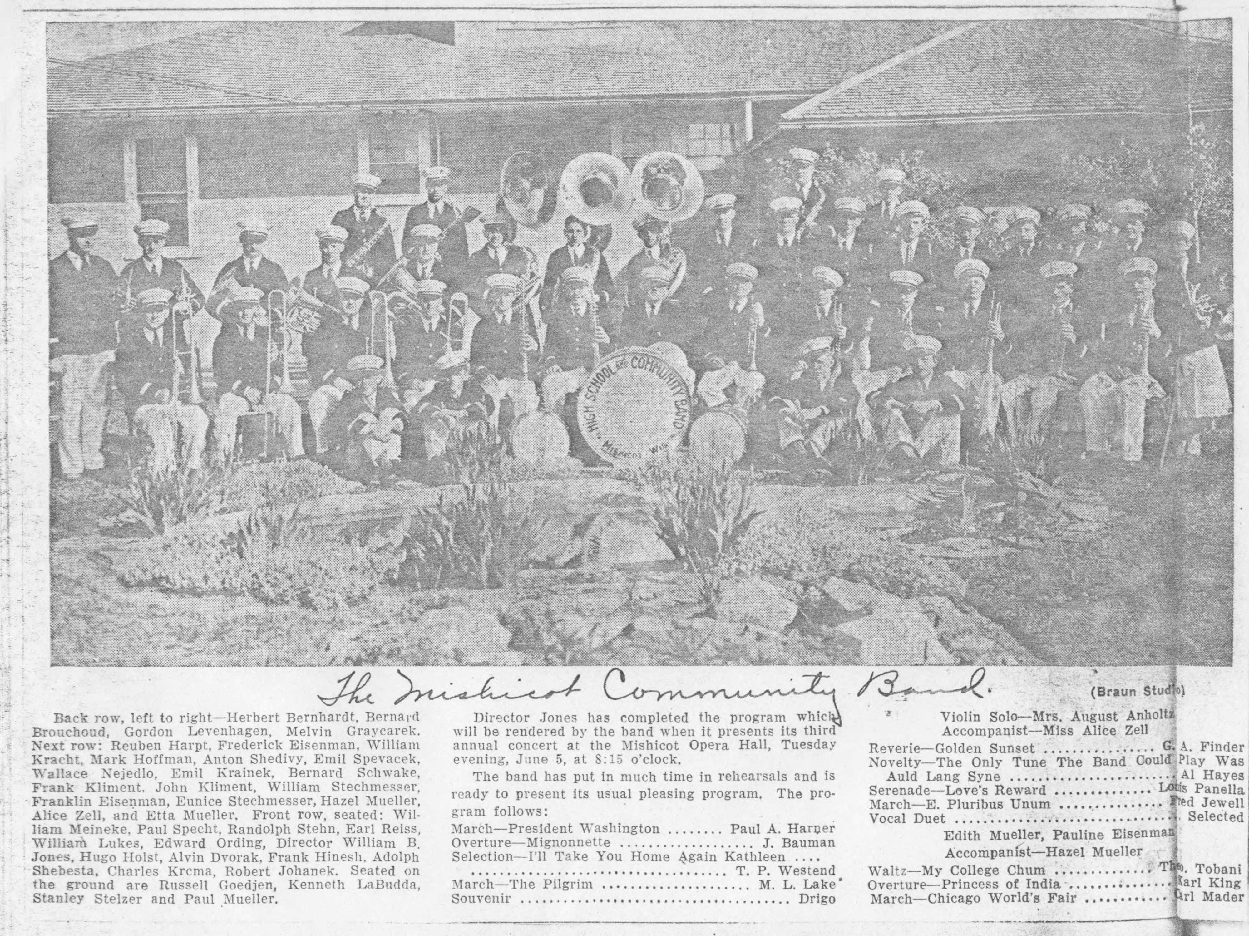 An undated group photo (and captioned copy) of the Mishicot High School Band. The photo was captured by Braun Studio on the Elizabeth Street side of 314 Jackson Street in Mishicot, Wisconsin.