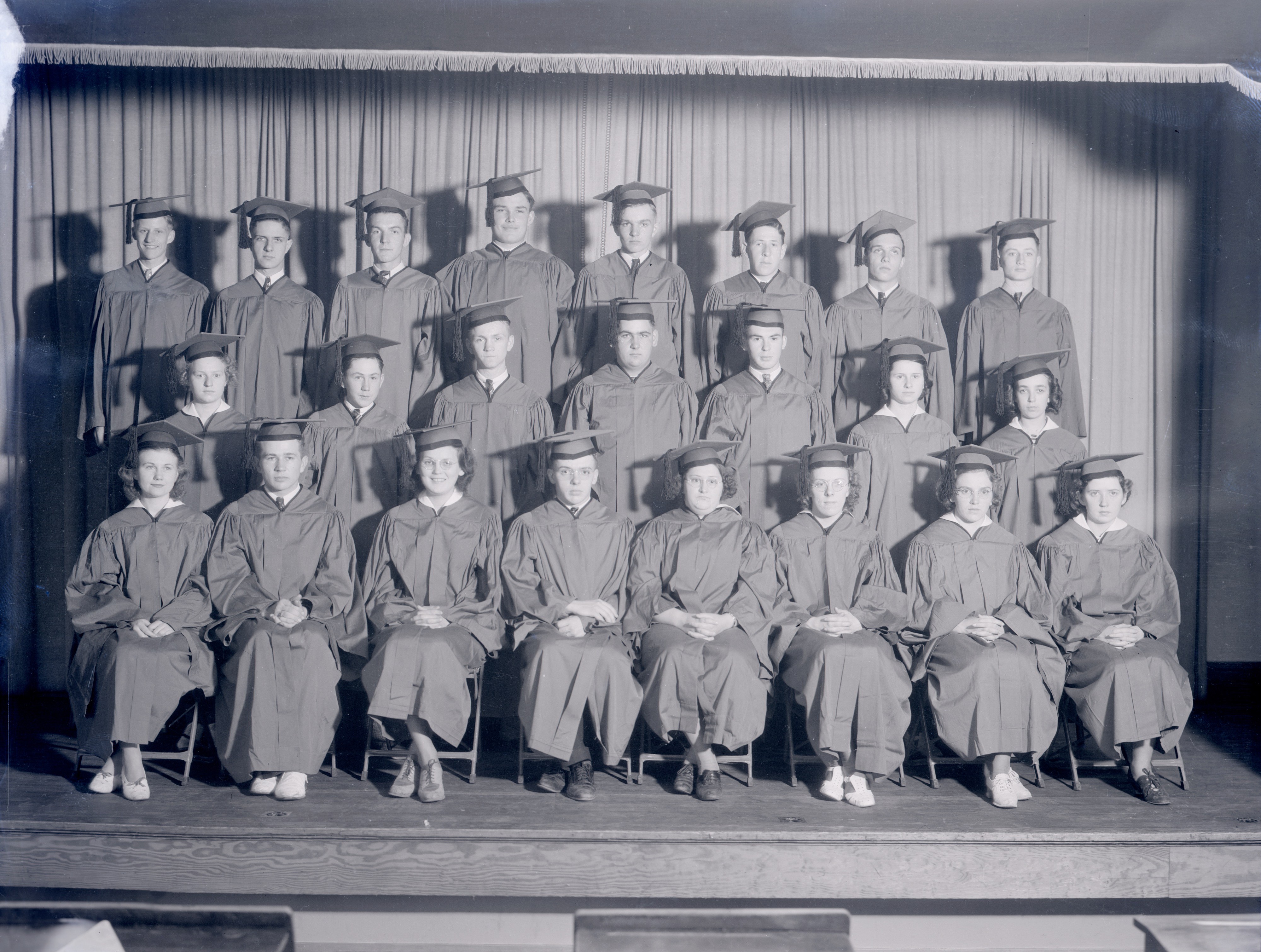 An undated photo, possibly from 1938, (print, negative, and envelope) of a Mishicot High School graduating class. The envelope is marked “T.R. Reporter.”