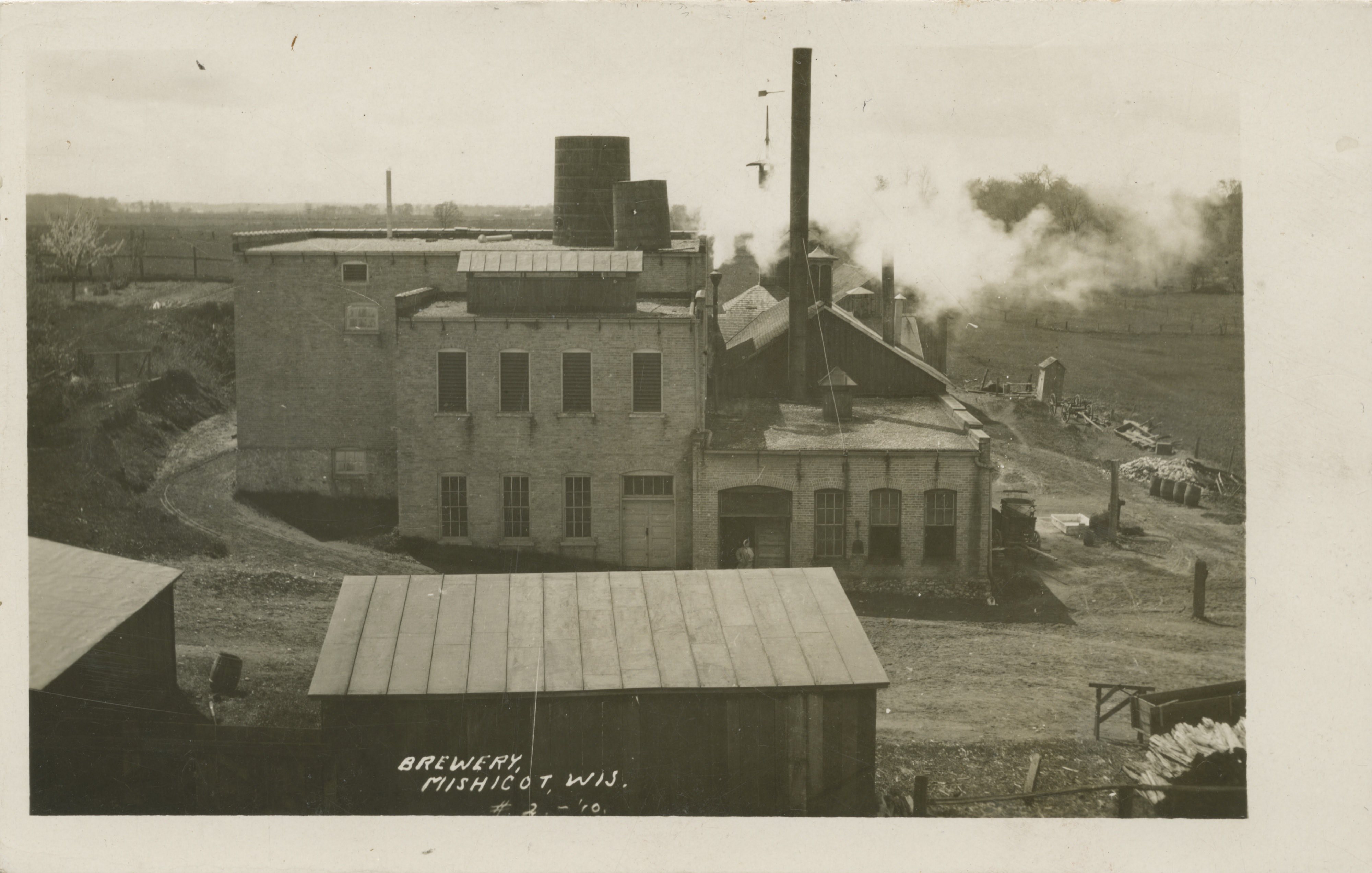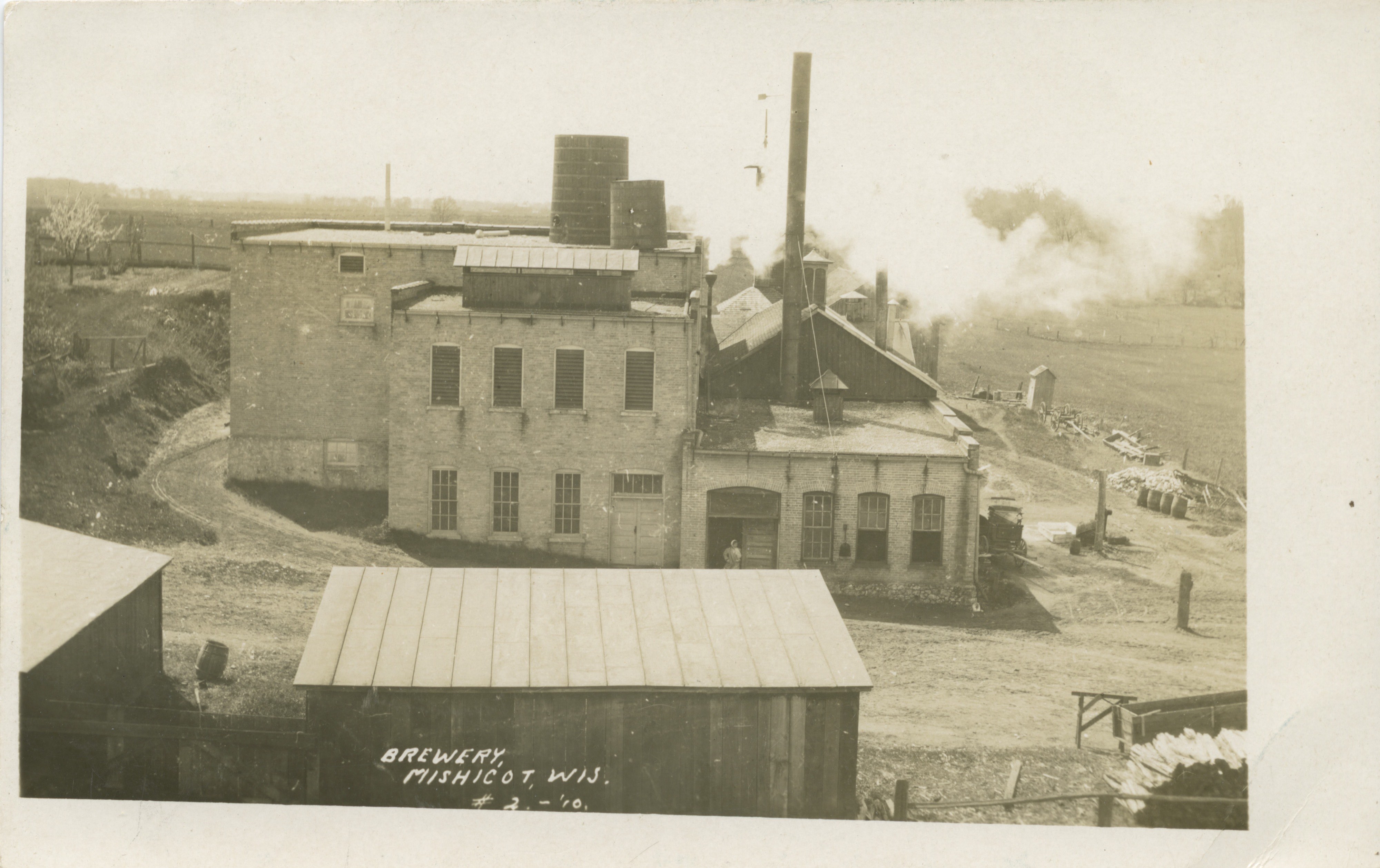 Photo and postcard views, one from 1910, of the Mishicot Brewing Company and its adjacent bottling works in Mishicot, Wisconsin. The brewery was located on S. Rockway Street, north of Salvage Road. One later photo, featuring vehicles and a large smokestack, depicts the brewery building after beer brewing operations had ended.