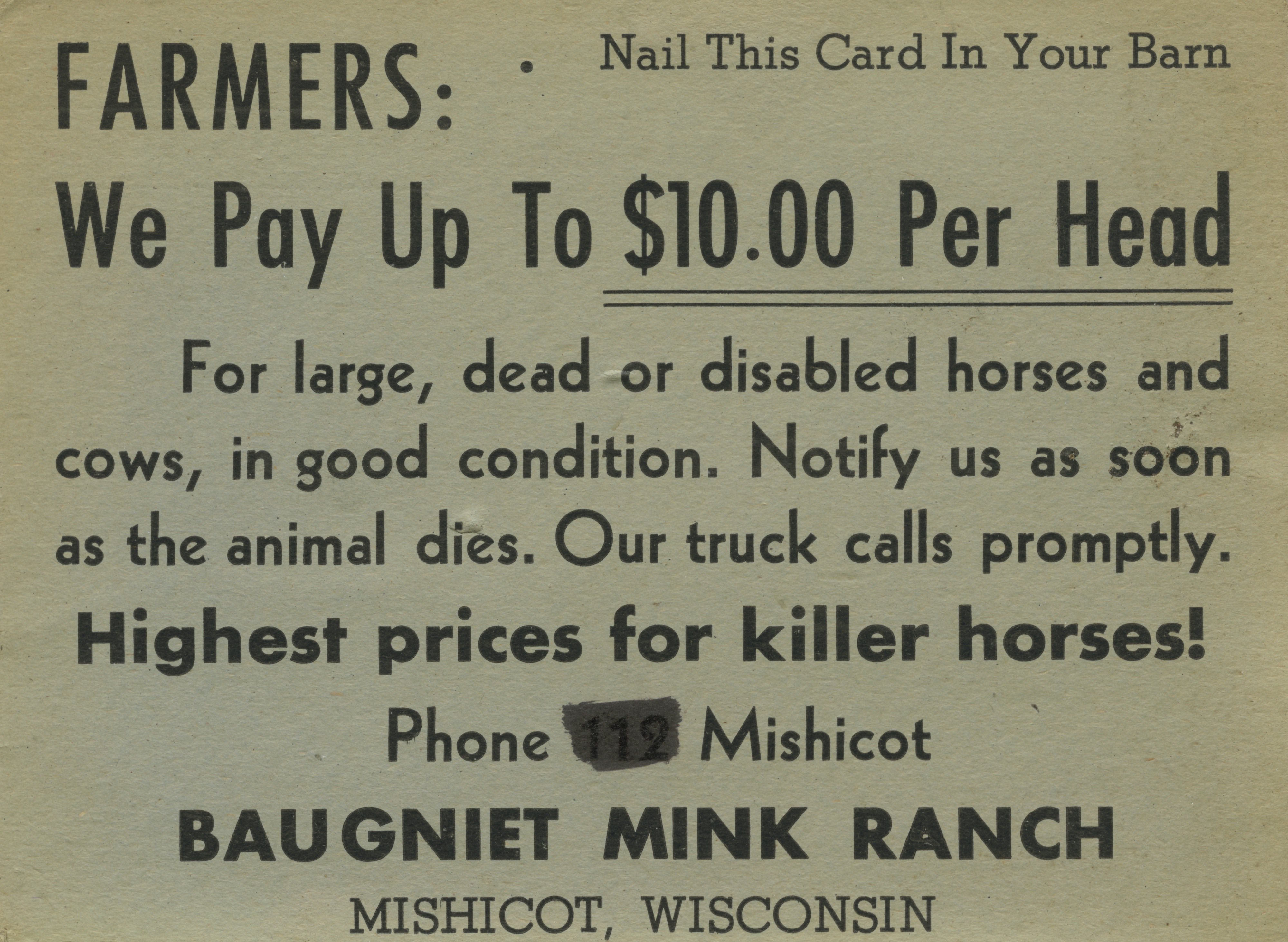 An undated postcard from the Baugniet Mink Ranch in Mishicot, Wisconsin, that offers to buy horses from farmers.