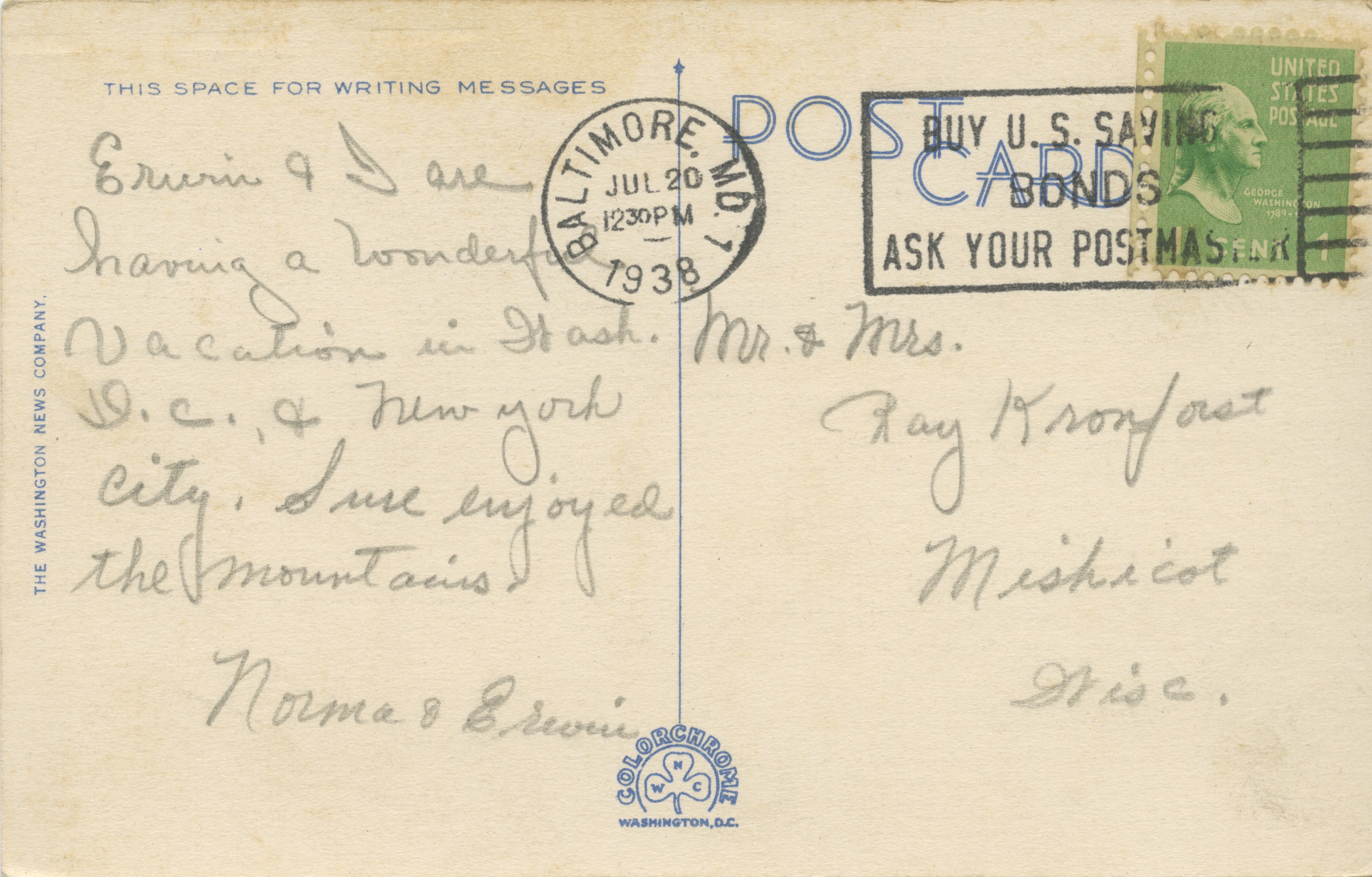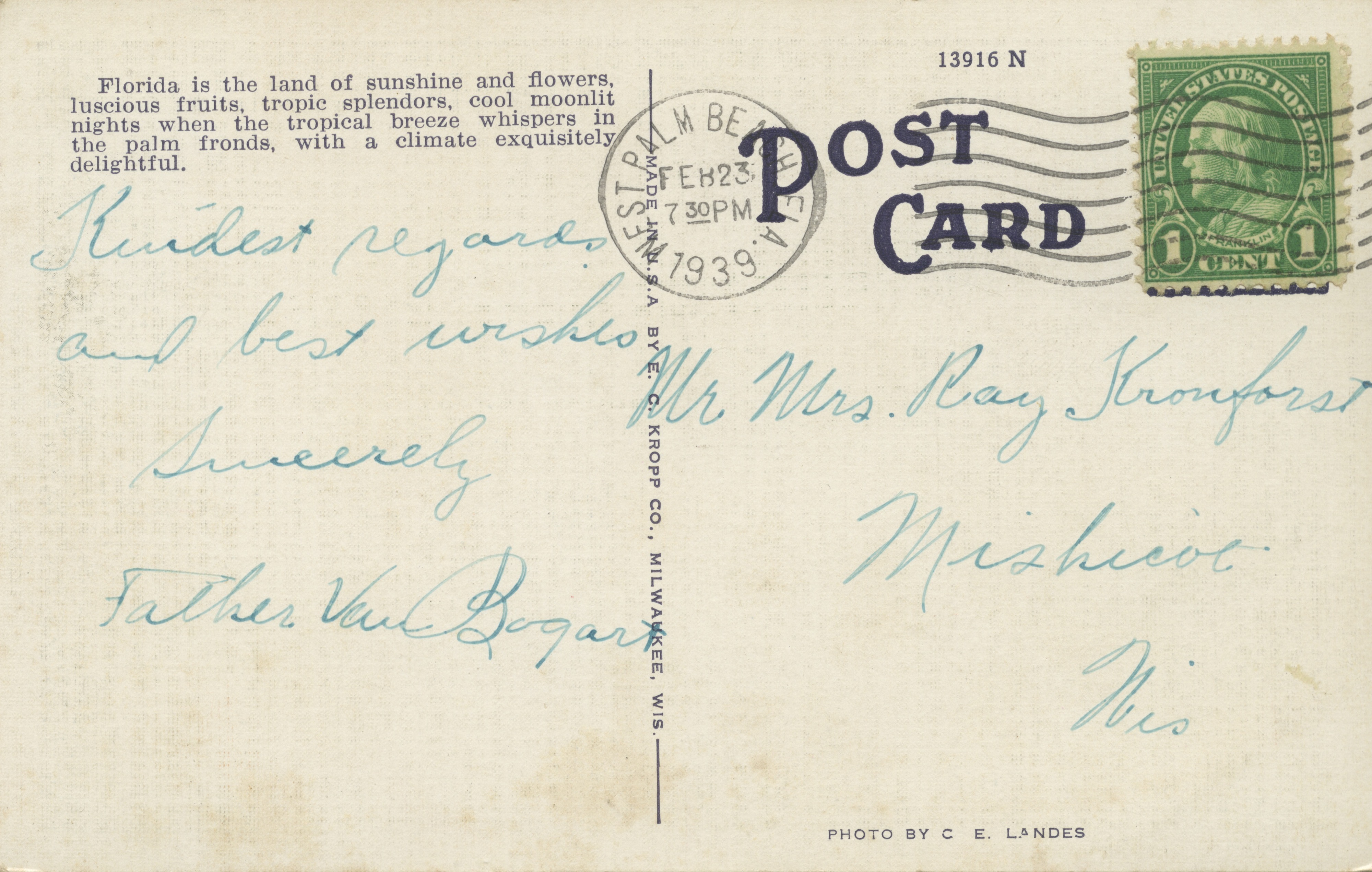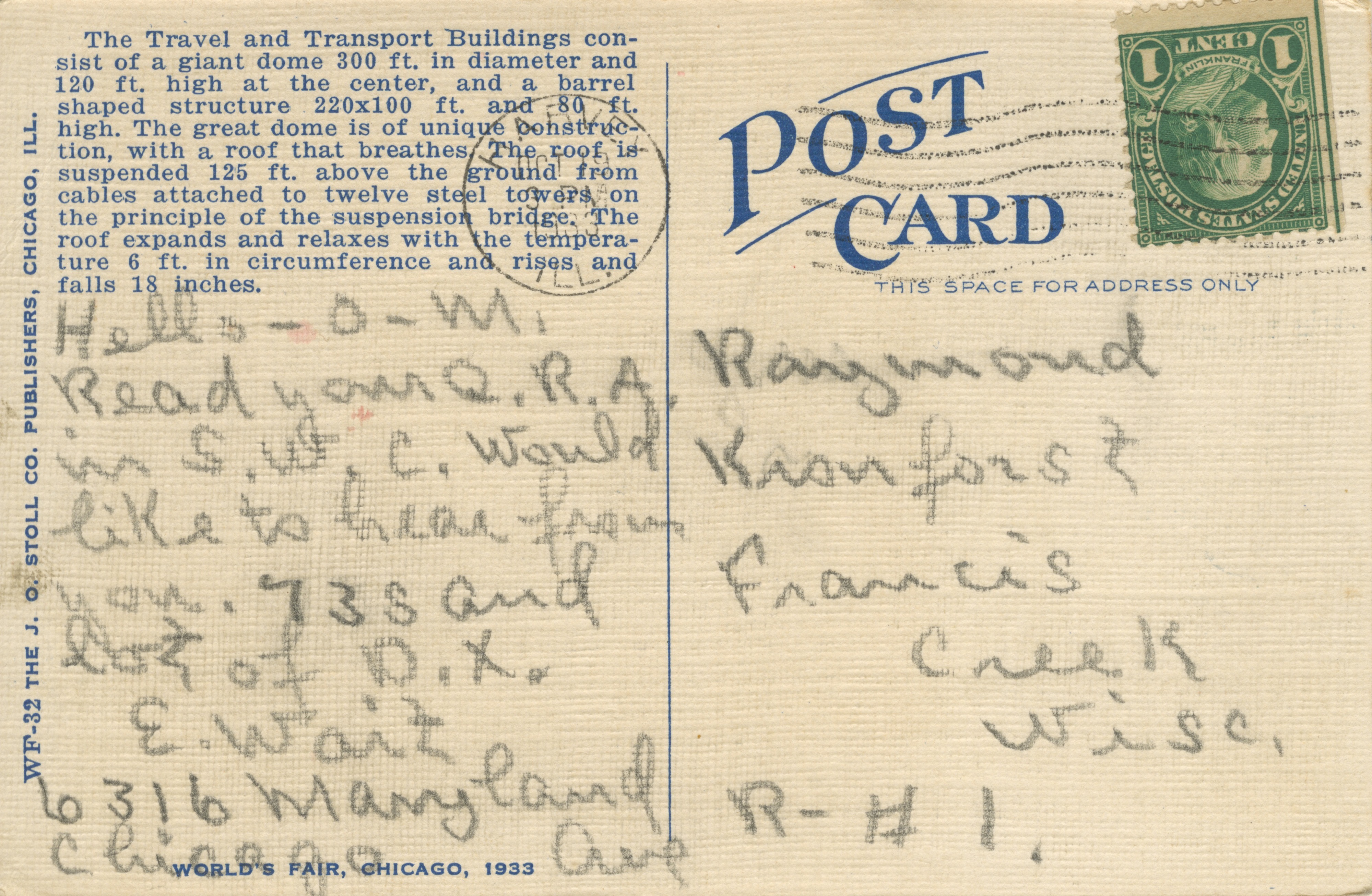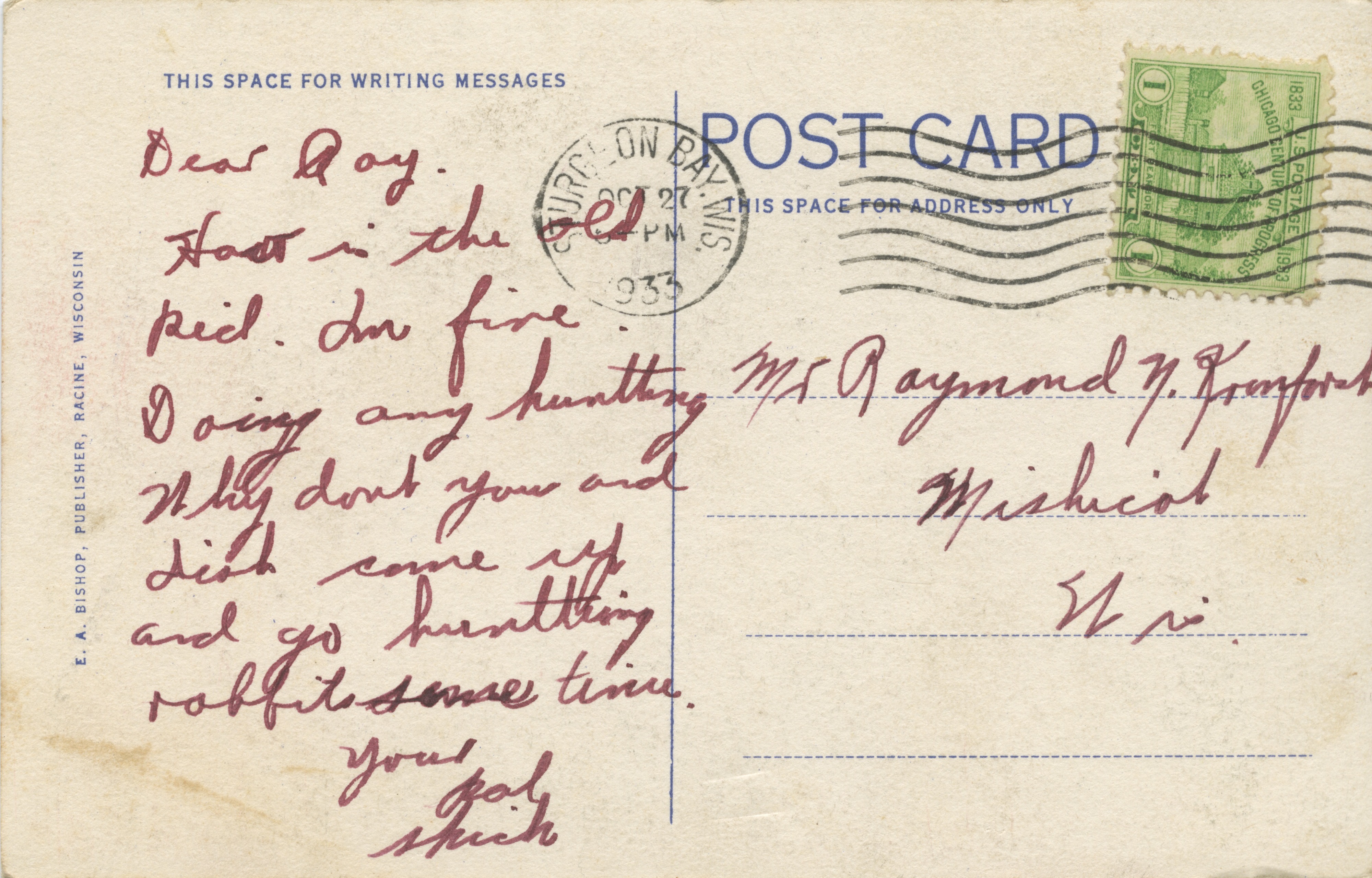 A collection of themed postcards with correspondence to Raymond N. and Angeline Kronforst.