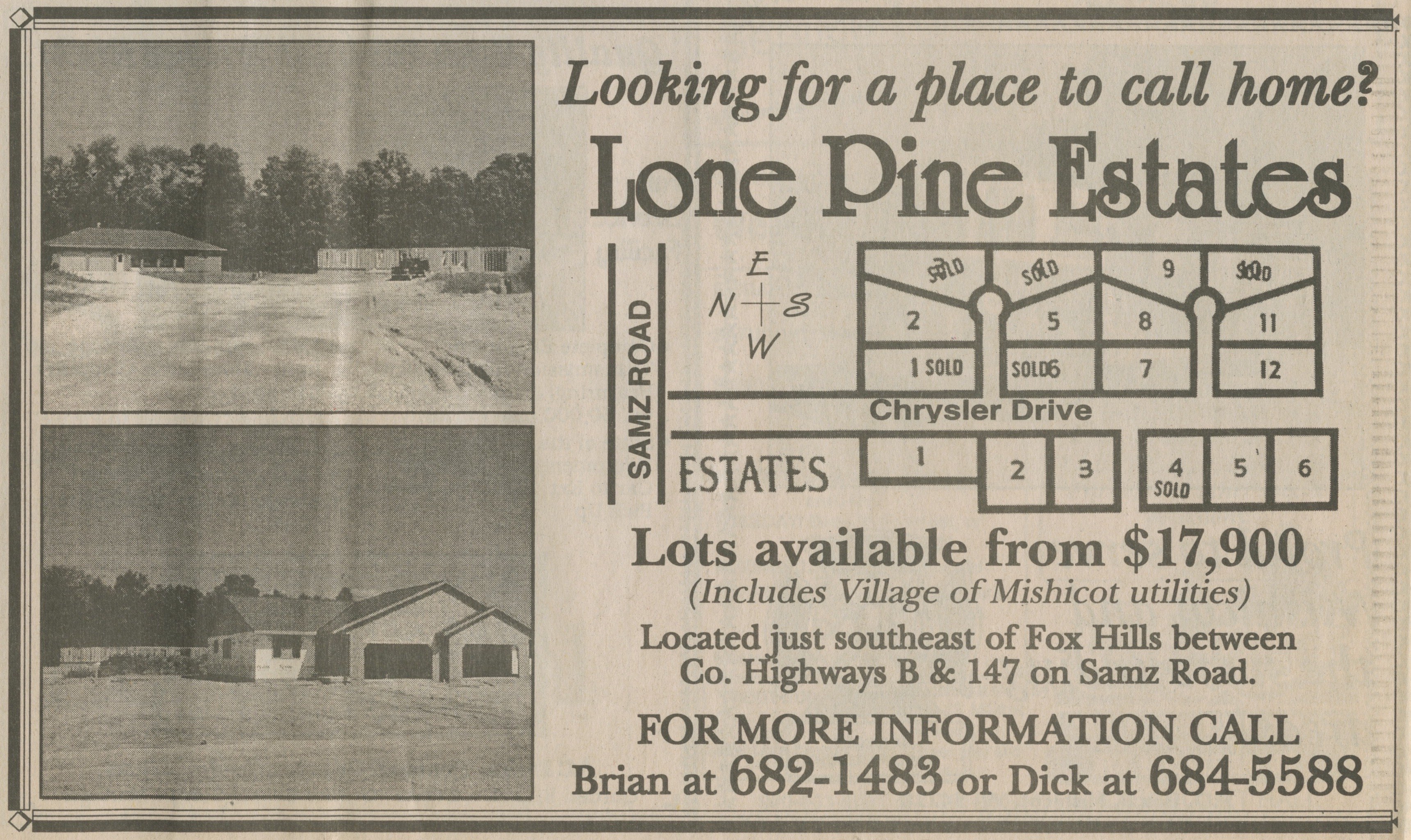 A newspaper article for the Lone Pine Estates subdivision in Mishicot, Wisconsin. The subdivision is located off of Samz Road.