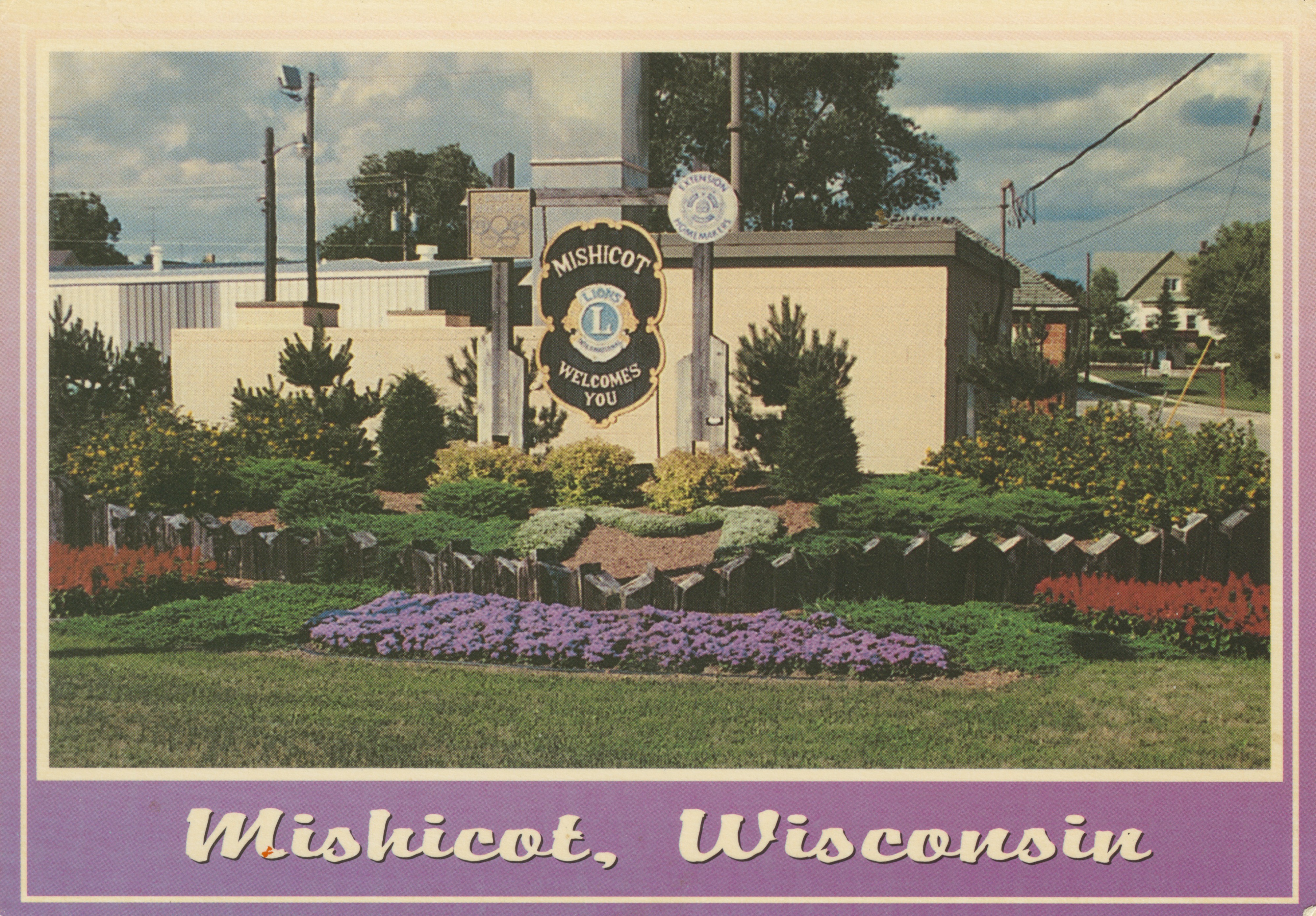 A postcard featuring the “Mishicot Welcomes You” sign at the intersection of Main and Washington Streets in Mishicot, Wisconsin.