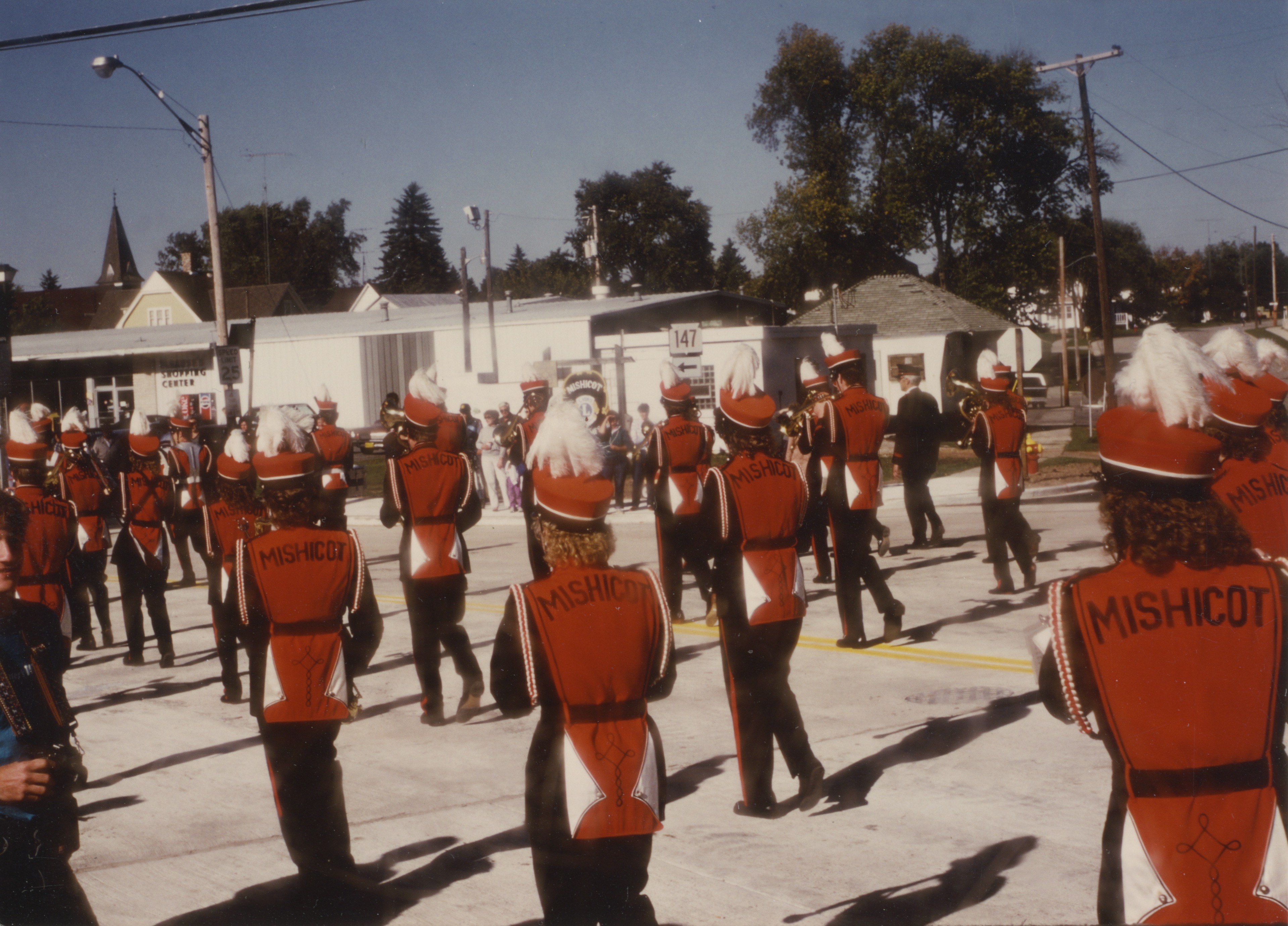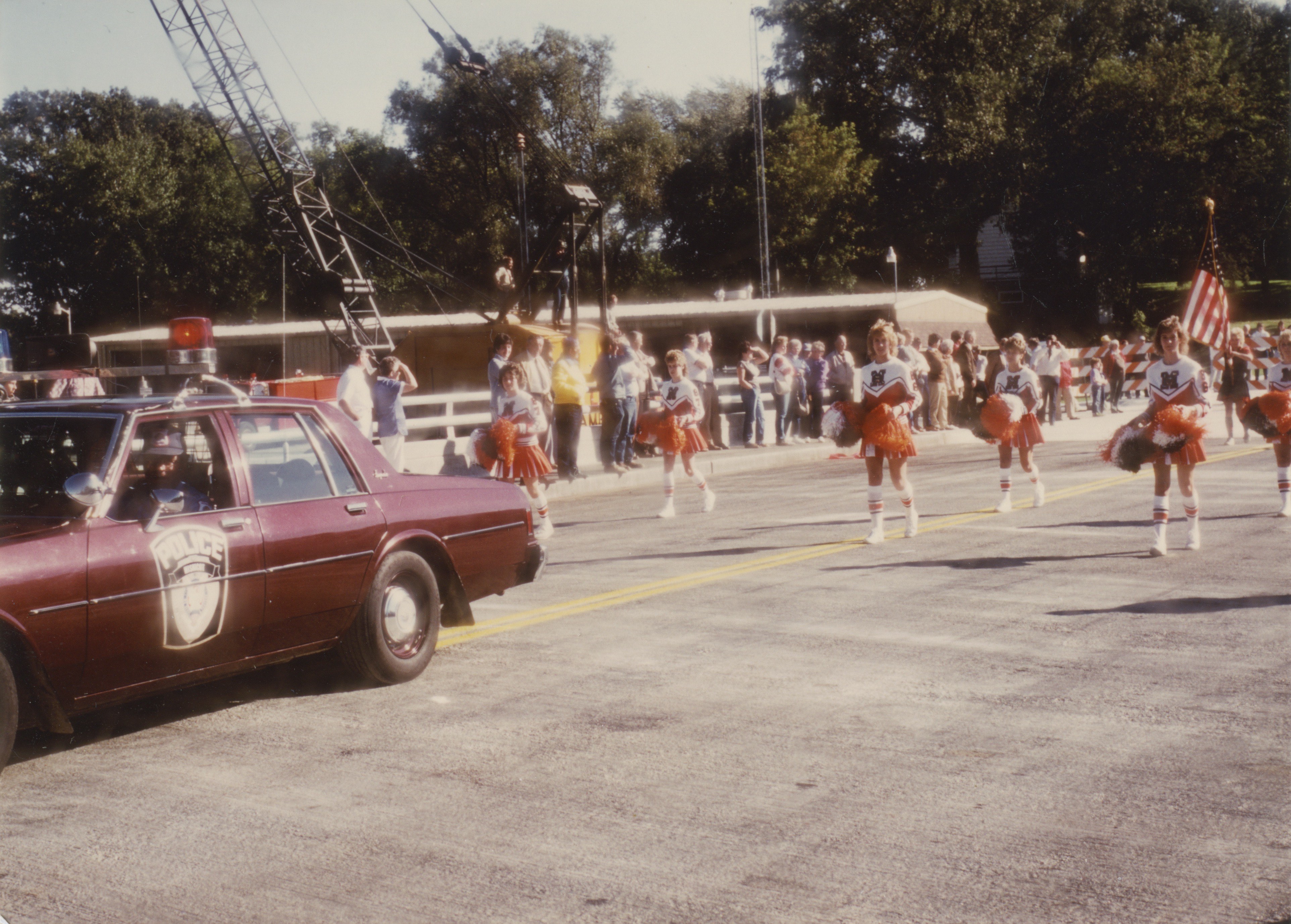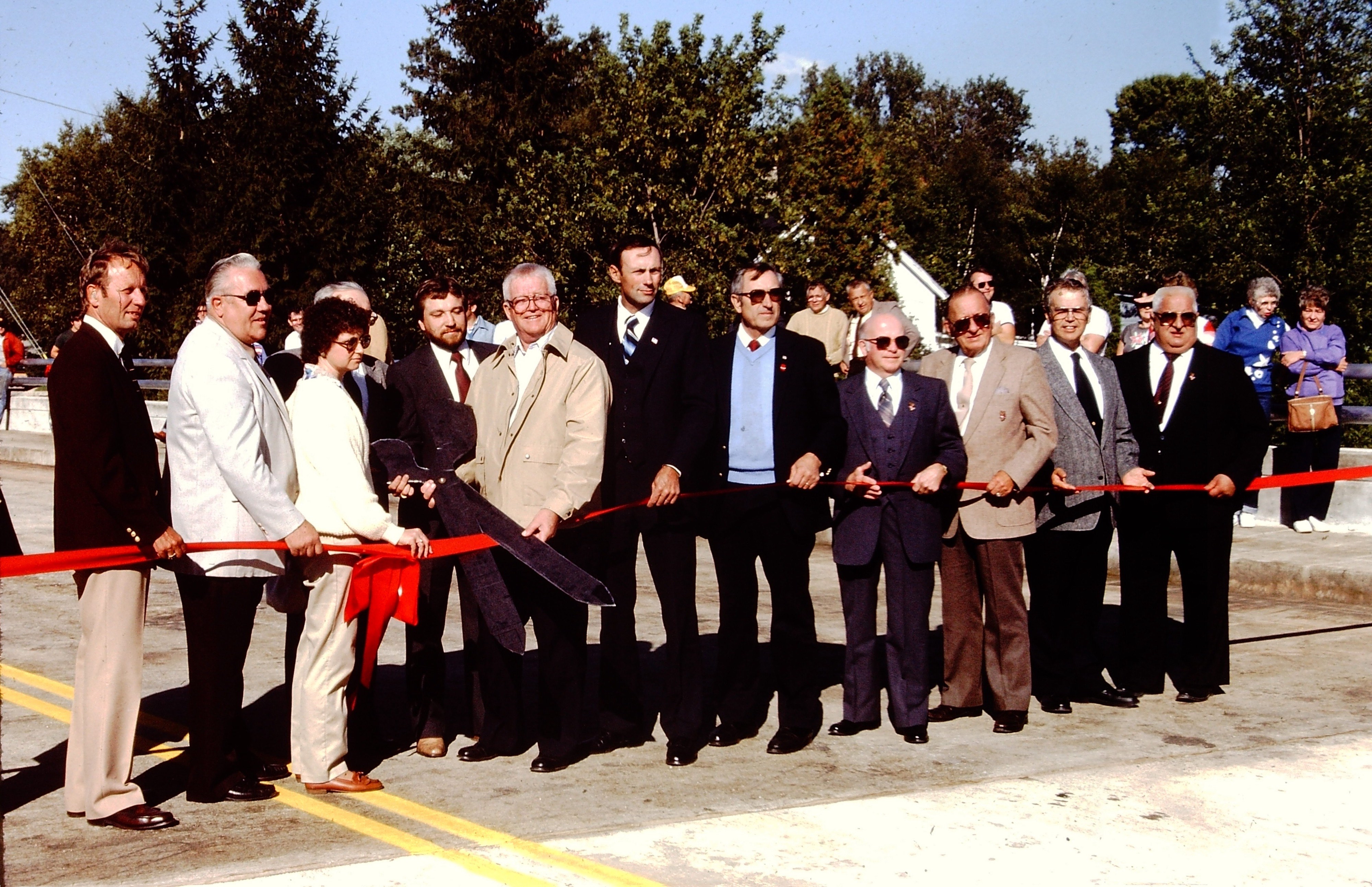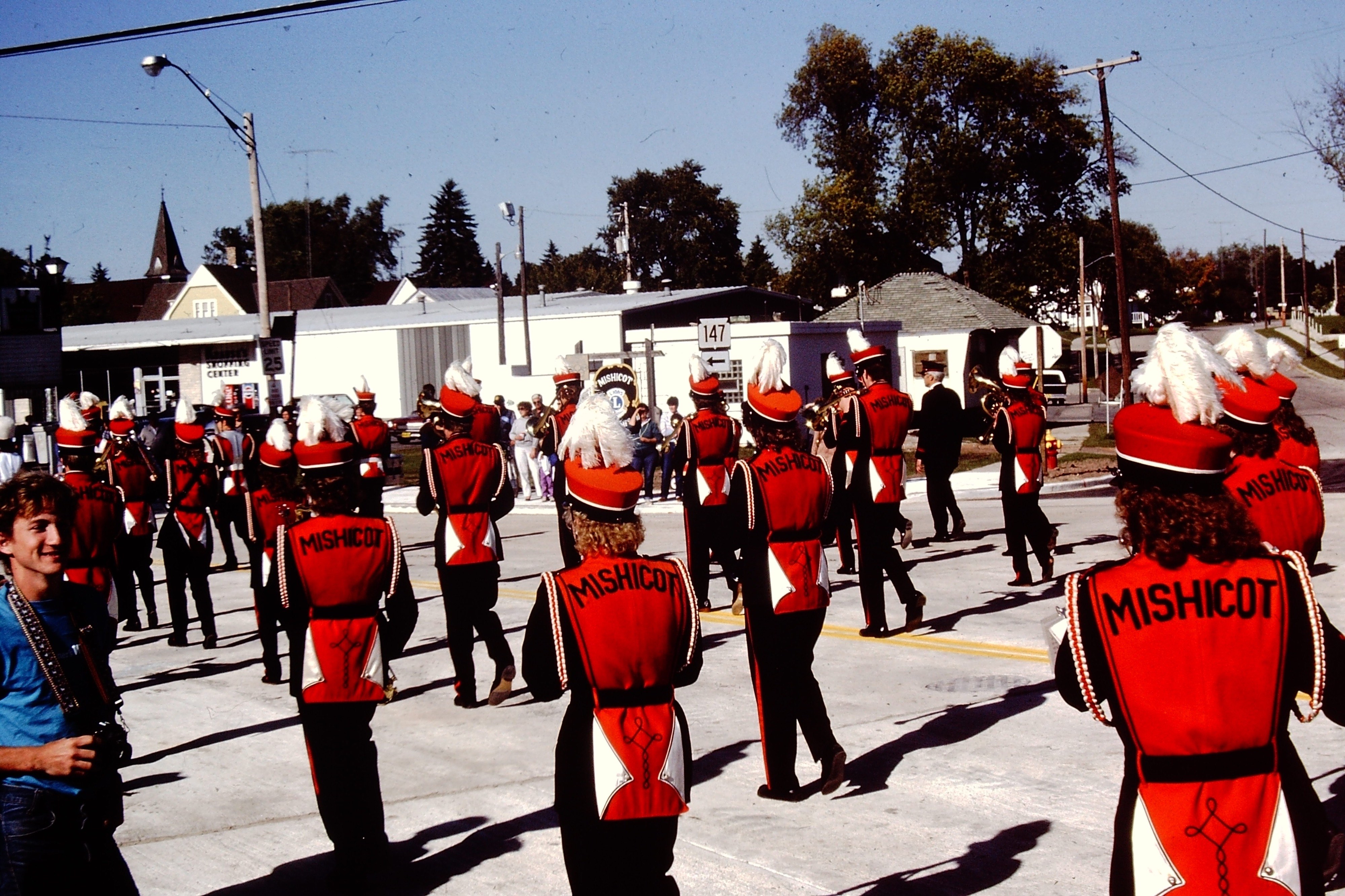 Photos from the dedication ceremony for a new Main Street (Highway 147) bridge in Mishicot, Wisconsin. The ribbon cutting was held on September 27, 1985 and featured Wisconsin DOT officials, local government members, and the Mishicot High School band.