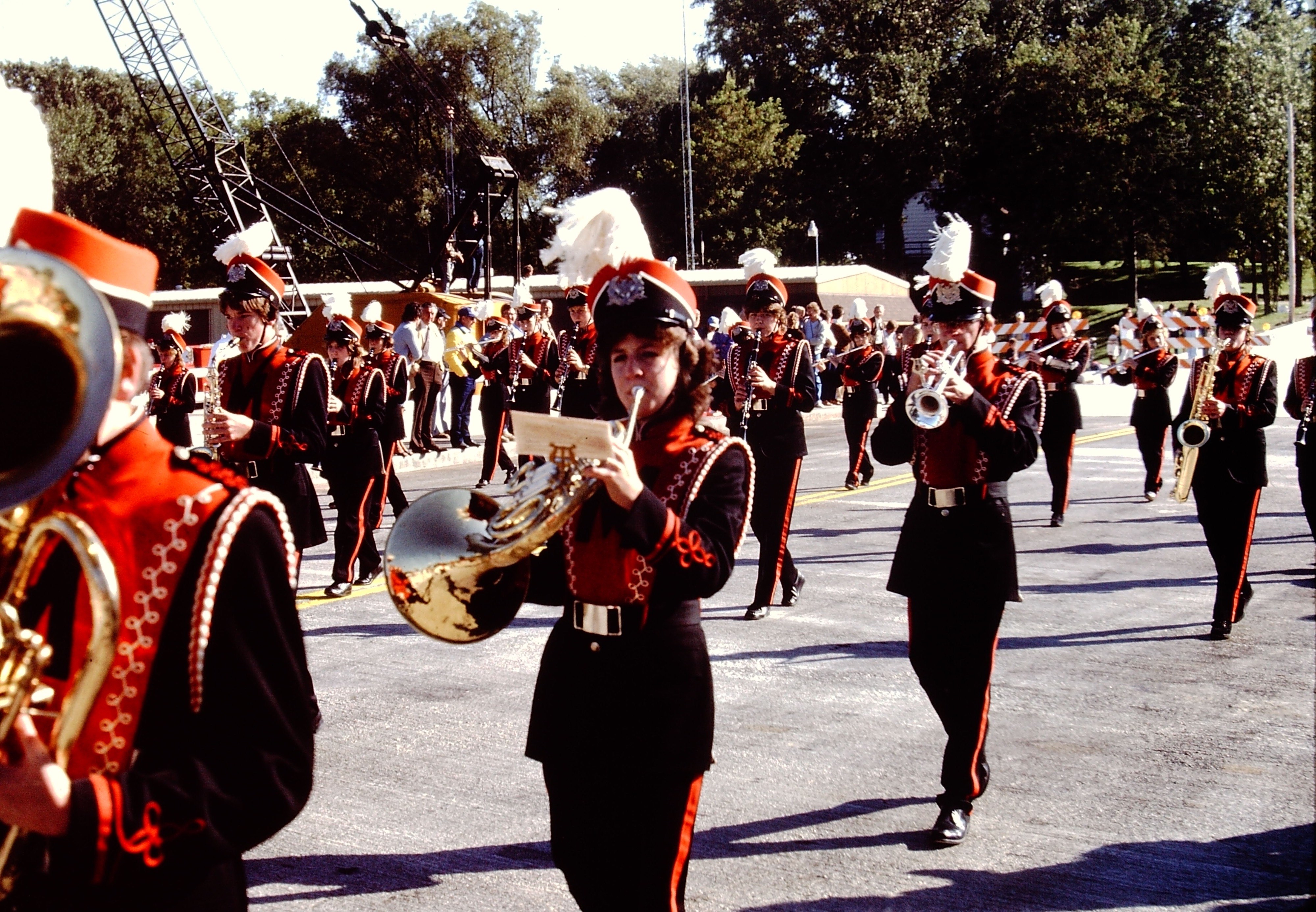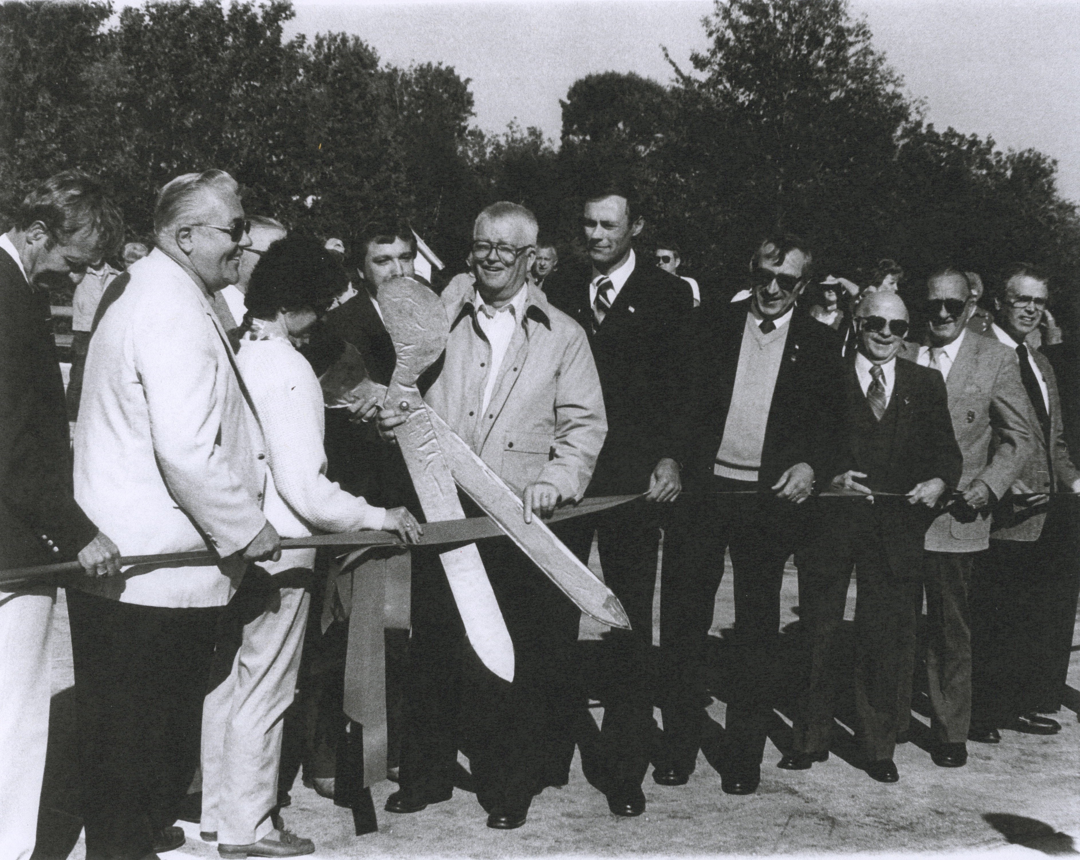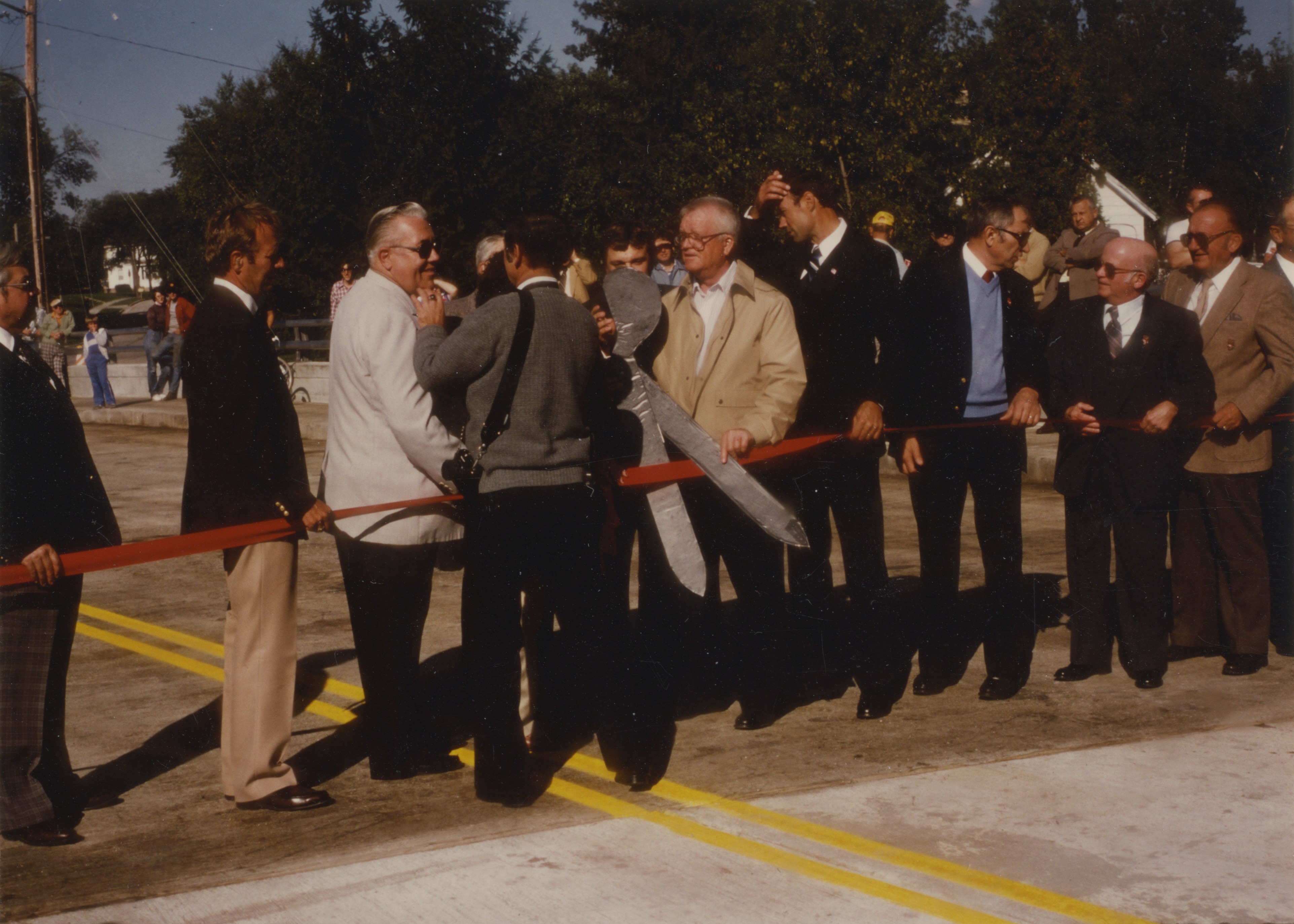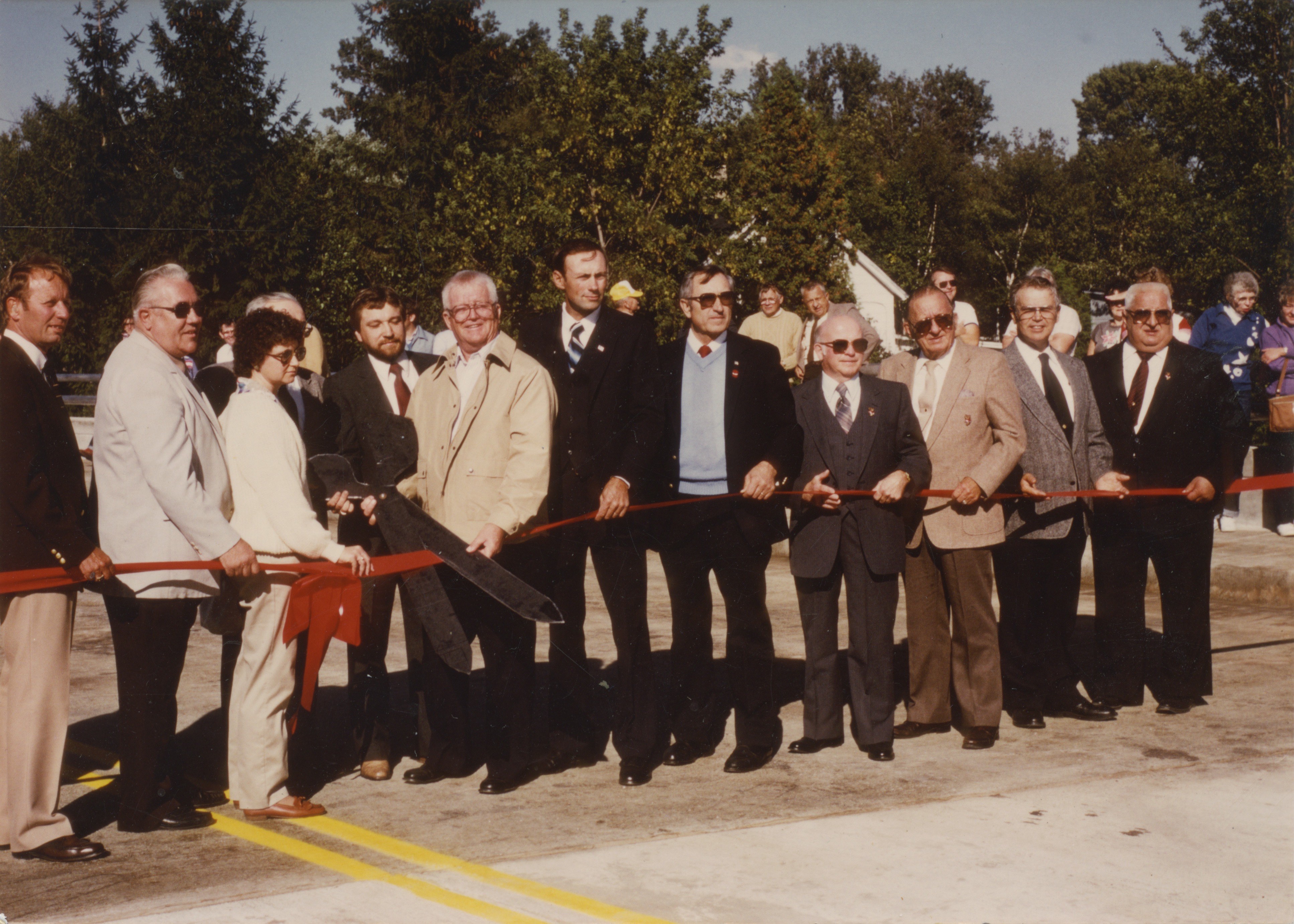 Photos from the dedication ceremony for a new Main Street (Highway 147) bridge in Mishicot, Wisconsin. The ribbon cutting was held on September 27, 1985 and featured Wisconsin DOT officials, local government members, and the Mishicot High School band.
