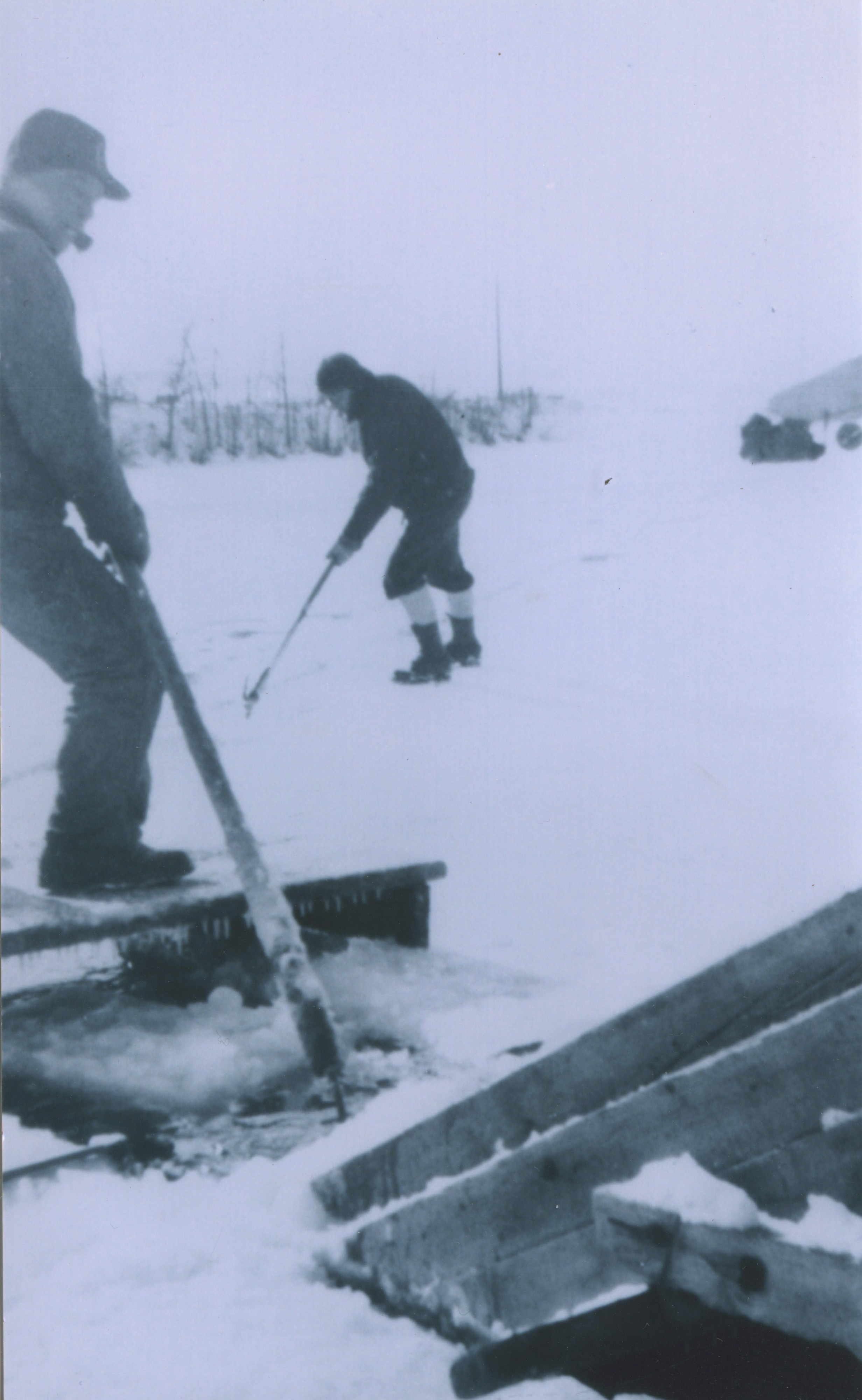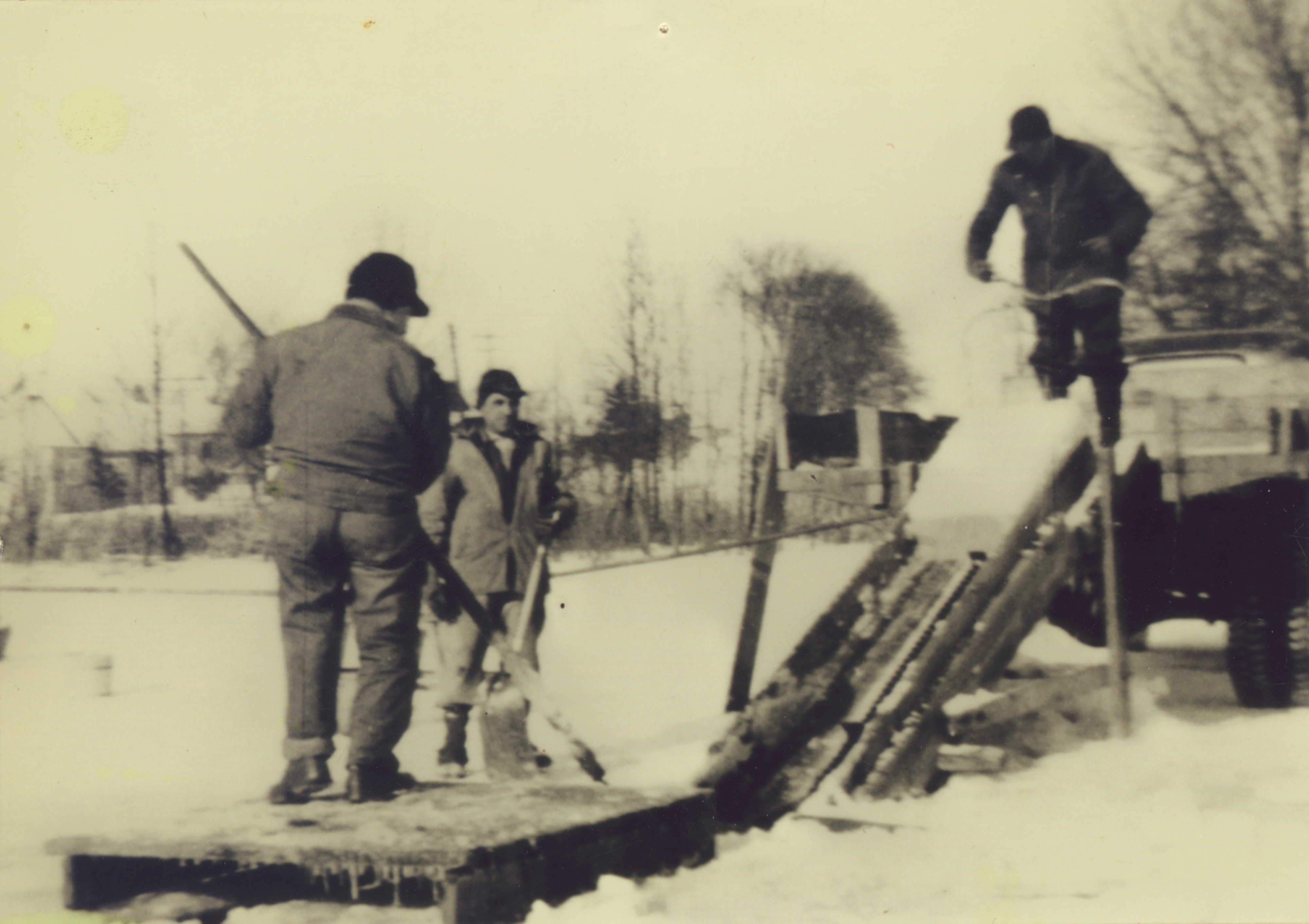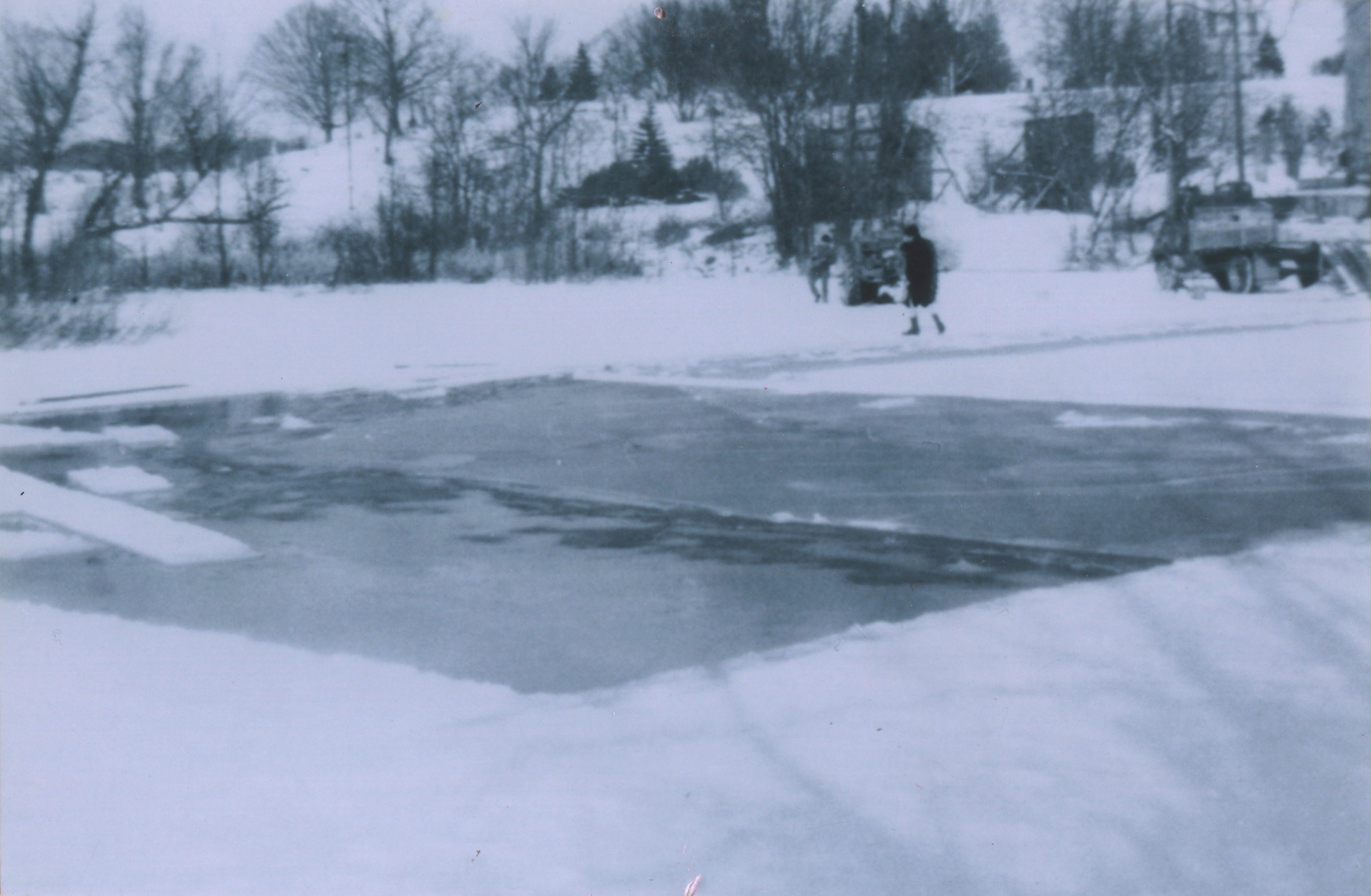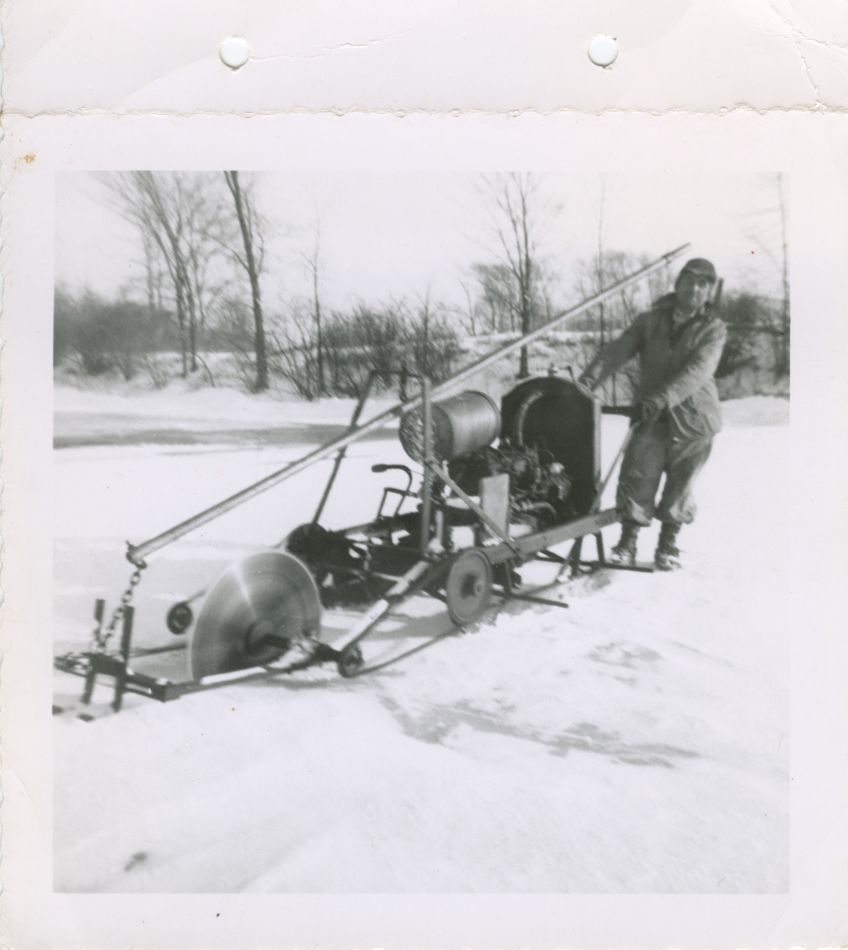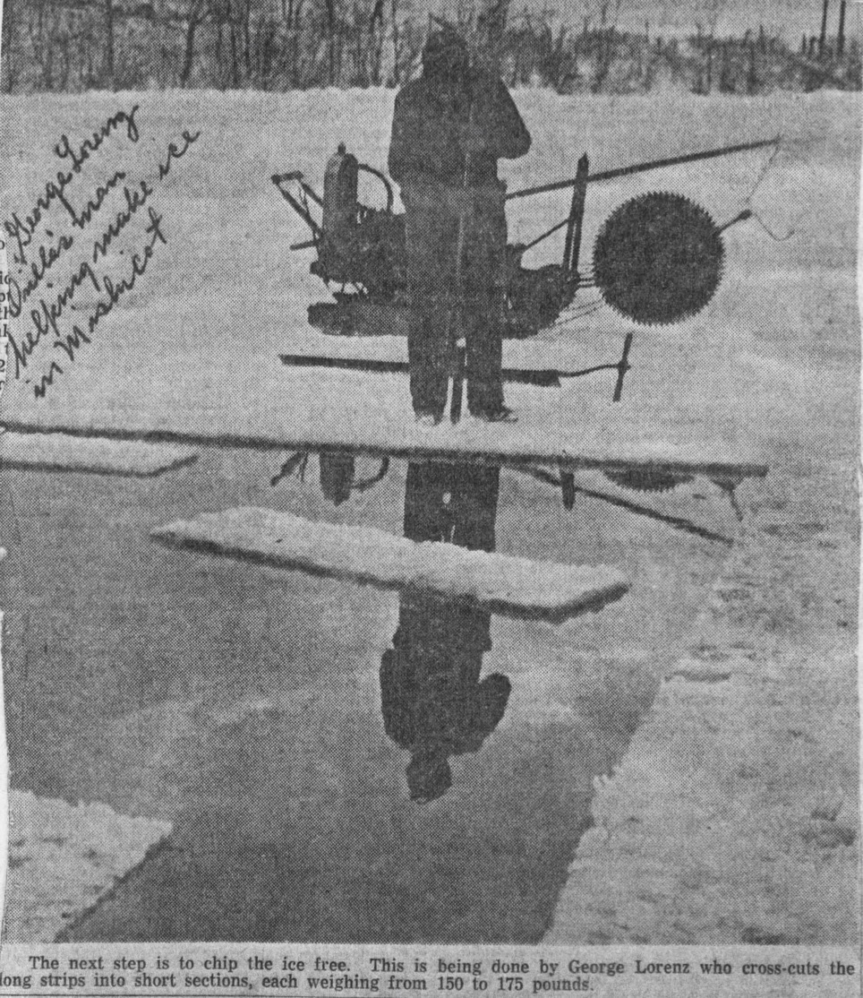 Ice Cutting scenes presumed to be photographed on the East Twin River in Mishicot, Wisconsin. One photo was provided by Chris Baugniet. Another, originally clipped from a newspaper article, has this caption: “The next step is to chip the ice free. This is being done by George Lorenz who cross-cuts long strips into short sections, each weighing from 150 to 175 pounds.”