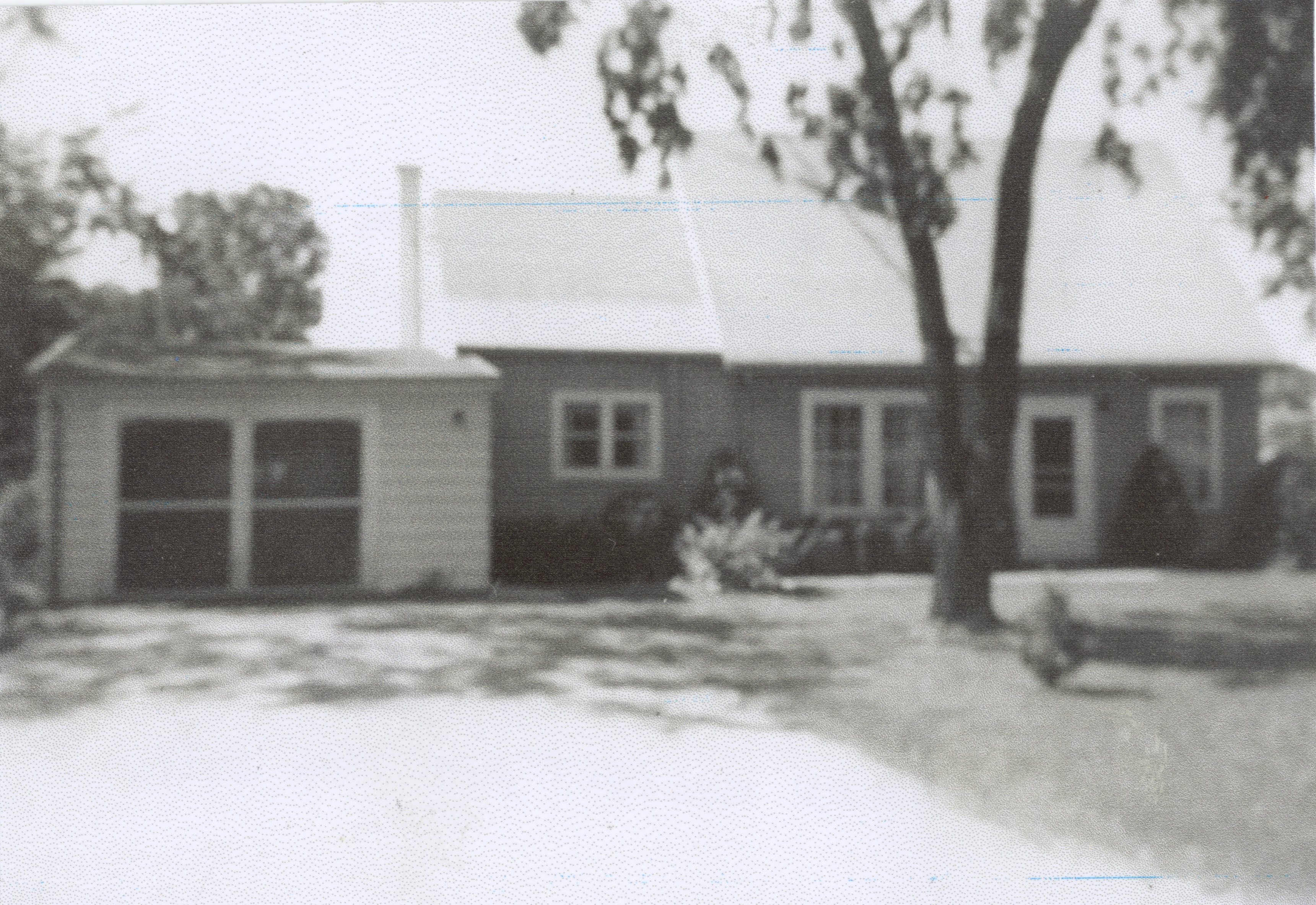 “Old Irvin Scheuer house by Co-Op. 122 Main St Mishicot. Built about 1930. House originally had no garage. Irvin and his mother were last Scheuers to operate brewery. Was closed because of prohibition. Also creditors couldn’t pay the bills.”