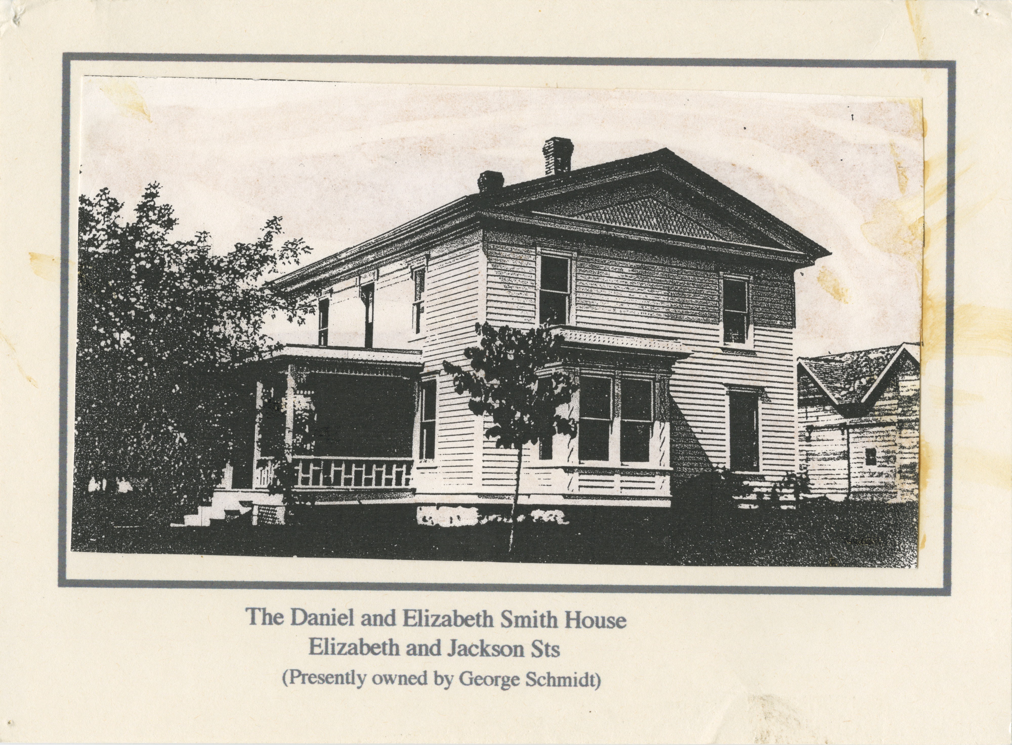 If you drive around the village of Mishicot, chances are you know of this house at the corner of Elizabeth and Jackson Sts. But what you may not know is how significant it is to the history of the village. According to our research, we believe this to be the original house of the founders of Mishicot, Daniel and Elizabeth Smith, who came here in 1844 to build a saw mill. The house was probably built around 1845 on a site along the river near the laundromat on Main St. A newspaper photo of the house in 1947 for the centennial of the village states it was moved “a block north”. That move was probably done following the death of Elizabeth in 1883.