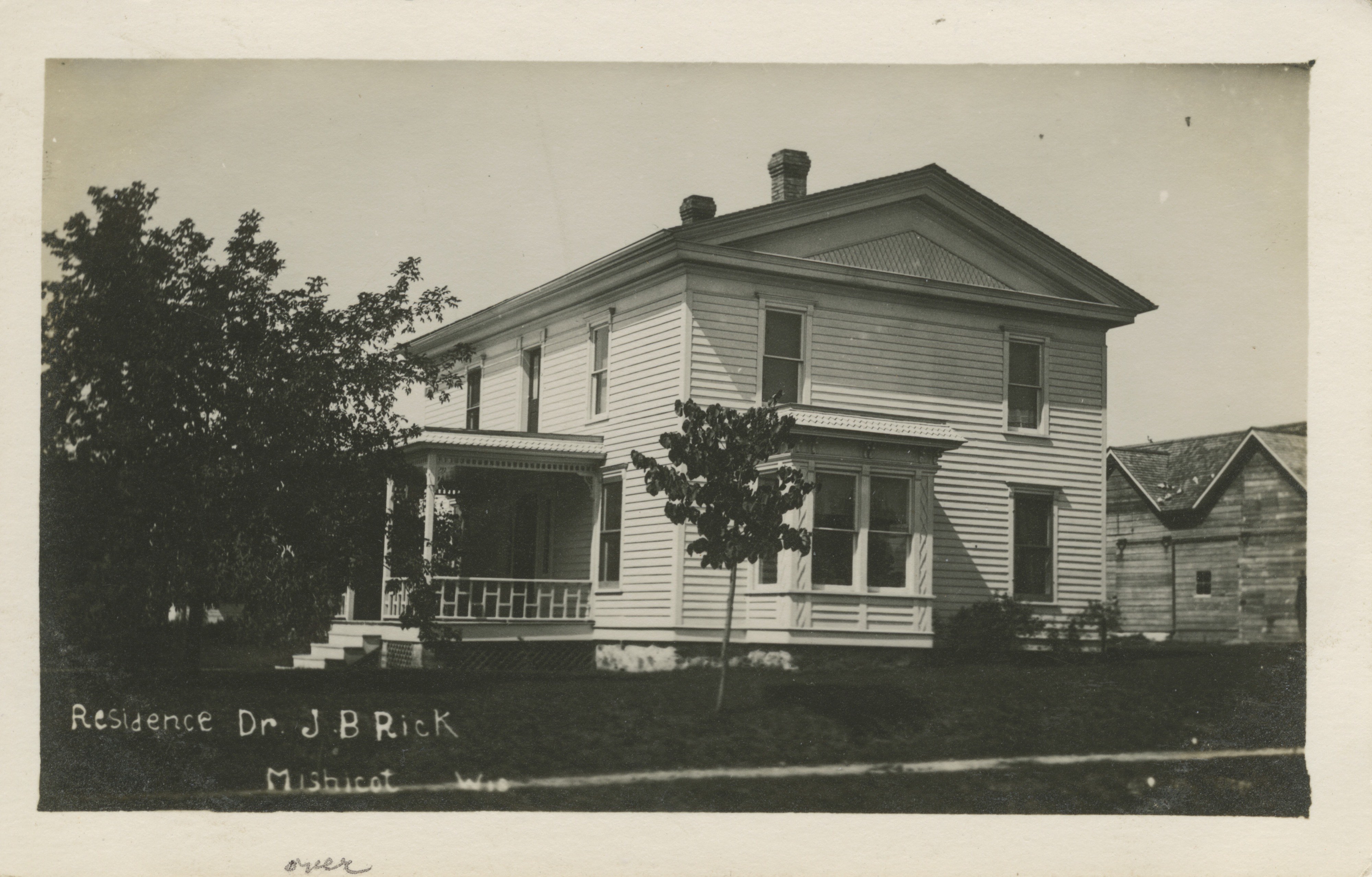 Elsie Rick (1886-1965) stated in a 1958 Green Bay Press Gazette article about Mishicot, that her parents purchased the house from the Smith family. Her father was Dr. Joseph B. Rick, ( 1857-1929), a physician who established a practice in the house. He continued his practice in the home until his death. Elsie, his daughter who was a nurse, continued to live in the house until she sold it in 1964. In the same Green Bay newspaper article, Elsie stated she remembered the house as being the site of many social gatherings. Dr. Rick had also been president of the local school board. The Rick family are buried in Evergreen Cemetery in Manitowoc.