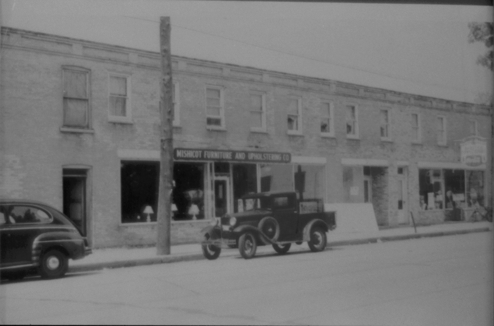 Two copies of an undated photo of Mishicot Furniture And Upholstering Co., which was located at 310 E Main Street in Mishicot, Wisconsin.