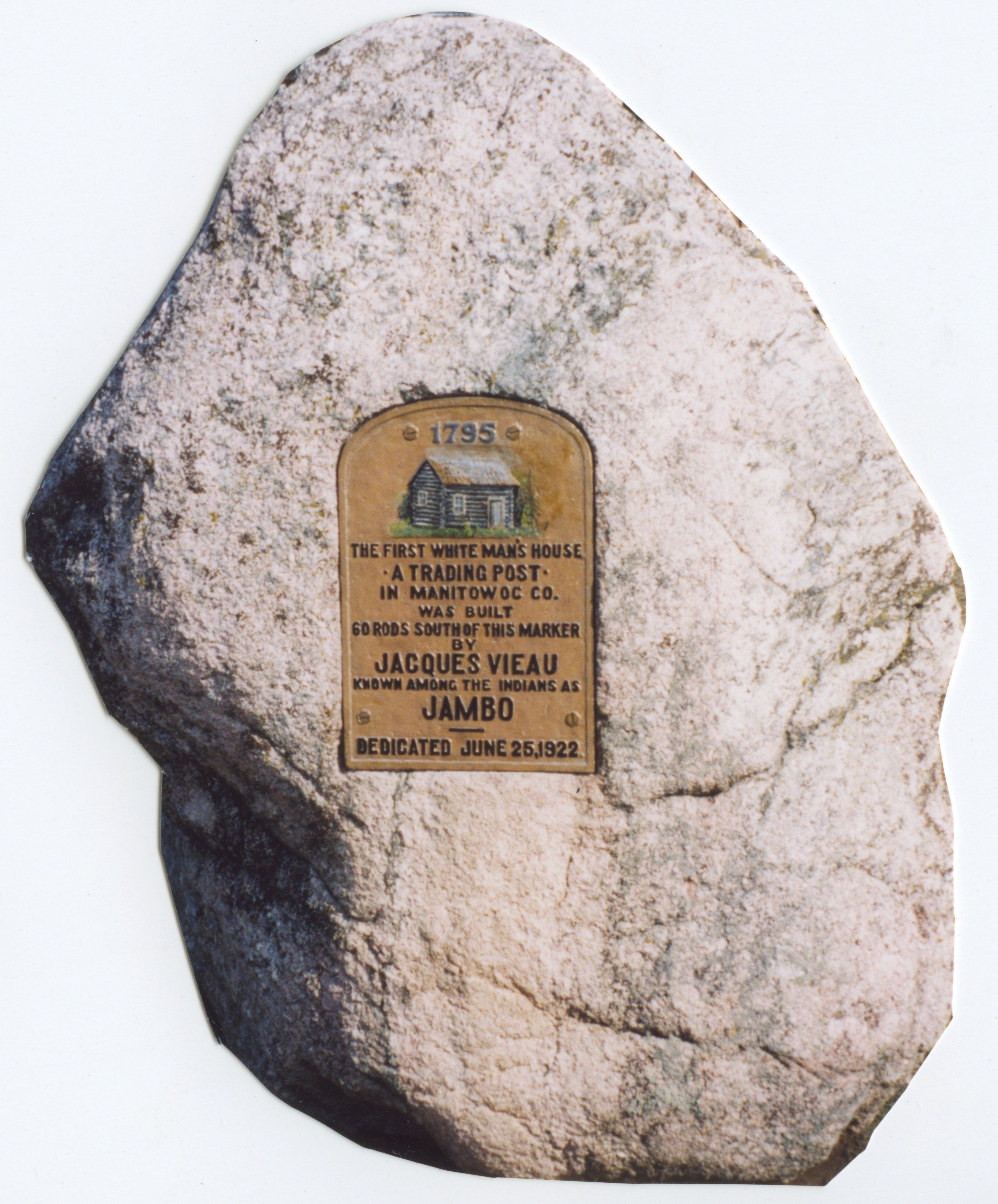 The first white man’s house – a trading post – in Manitowoc Co. was built 60 rods south of this marker by Jacques Vieau known among the Indians as Jambo.