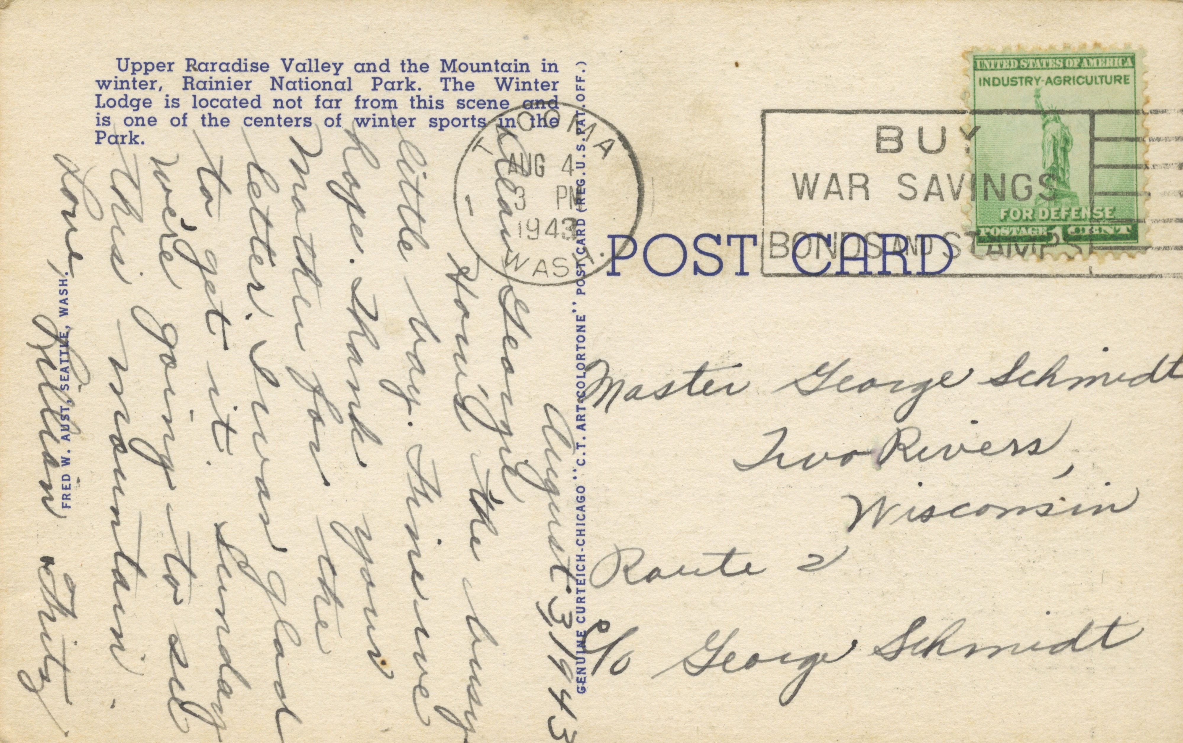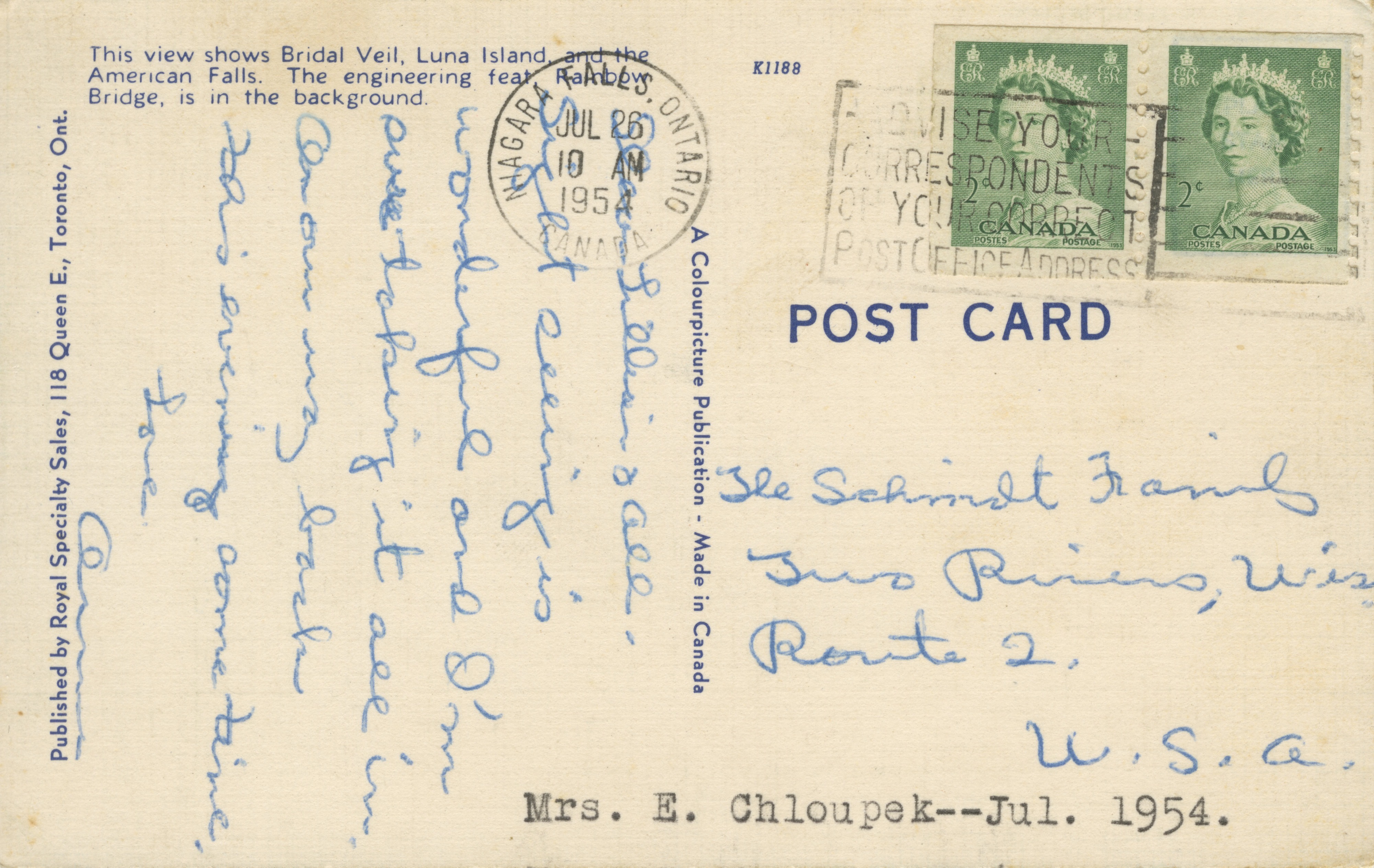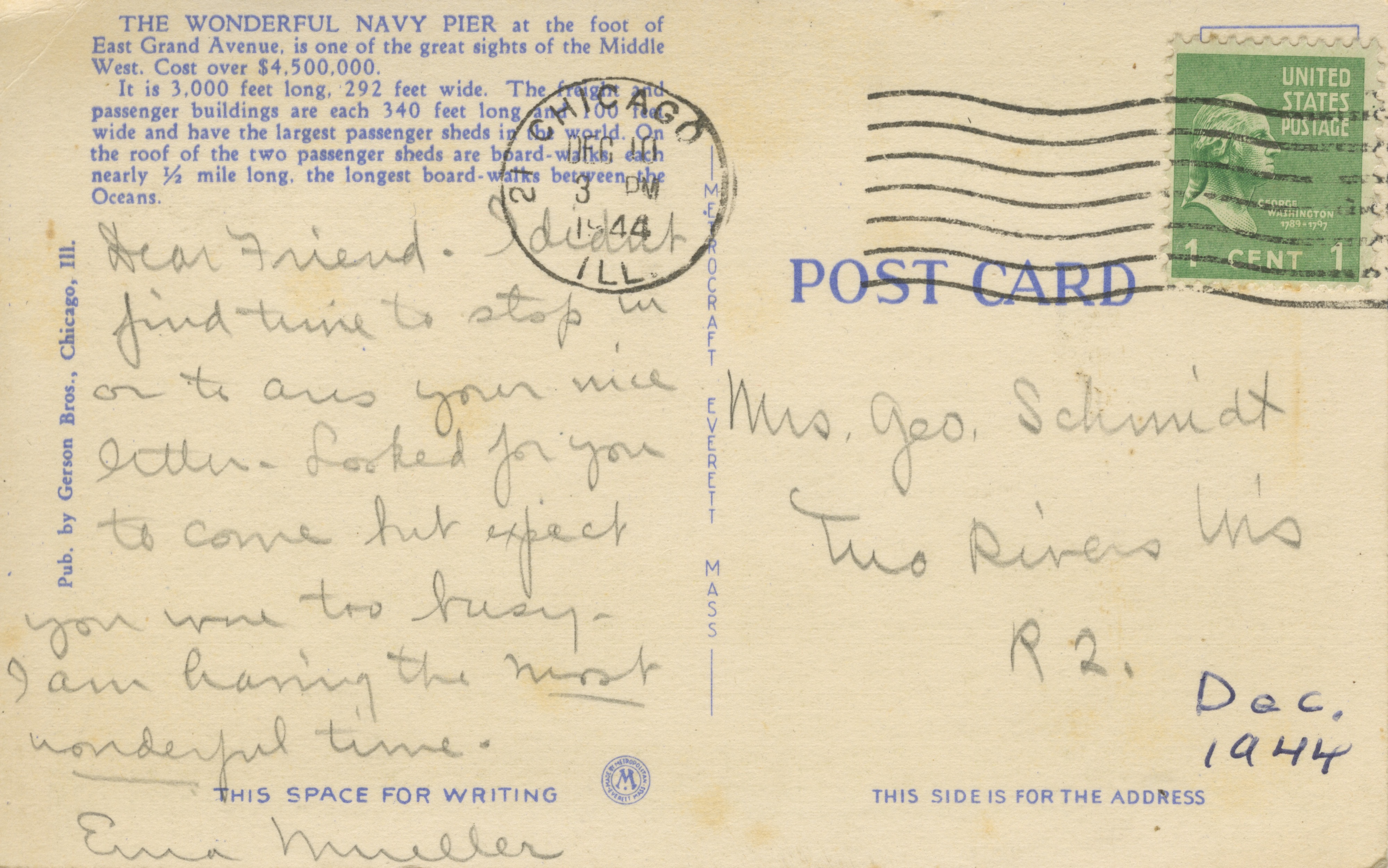 Tags: 1928, 1933, 1940, 1942, 1943, 1944, 1945, 1948, 1949, 1950, 1951, 1952, 1953, 1954, 1955, 1956, 1957, 1958, navy pier, postcard, american falls, key west, gladys simonek, badlands, north dakota, rapid city, south dakota, mount rushmore, oakdale park, salina, fort smith, mount vista, van buren, castle of rock, field museum, hancock, portage lake, hotel arthur, minnesota, rochester, bahia honda bridge, mercy hospital, st edwards, chimney rock, laramie, the hiker, sturgeon bay, michigan, saul ste marie, soo locks, nebraska, u.s. army, san rafael, mount rainier, cascade mountains, secretariat building, united nations, the ward hotel, door county, new york, fort ord, soldiers club, memorial bell tower, valley forge, washington memorial chapel, great smoky mountains, south haven, u.s. coast guard, newfound gap, state capitol, state teachers college, olympia, franconia notch, saint augustine, new hampshire, tacoma, west virginia, white sulphur springs, muntainburg, arkansas, memorial hall, oshkosh high school, colorado, manitou, williams canon, denver, denver public library, civic center, paradise inn, washington, maura manning, oshkosh public museum, radford hall, paradise valley, mississippi river, north platte, michigan avenue, mirror lake, william mueller, chicago, oshkosh, fox river, mayo clinic, riverside, pocahontas, california, wyoming, wisconsin dells, british columbia, louis meyer, grant park, stanley field hall, vancouver, florida, wrigley building, chloupek, george schmidt, george schmidt sr, goat island, lillian chloupek, luna island, lillian cootway, niagra falls