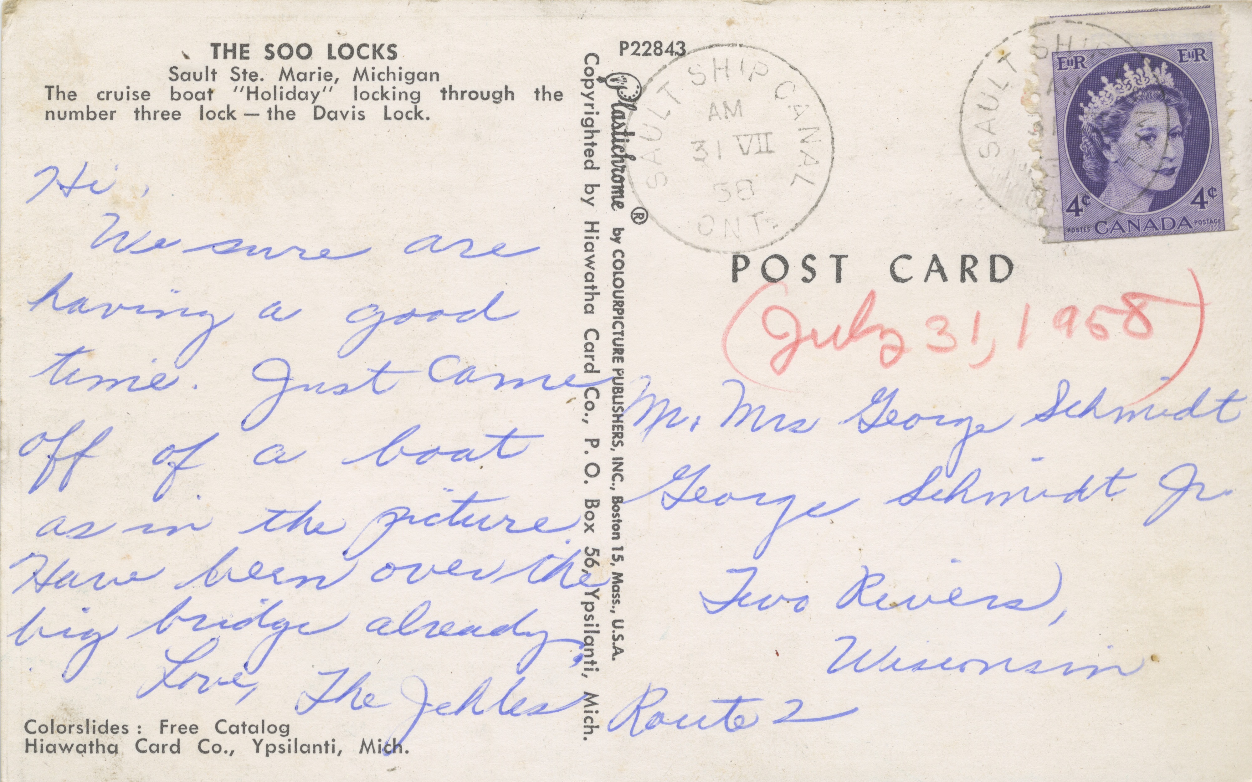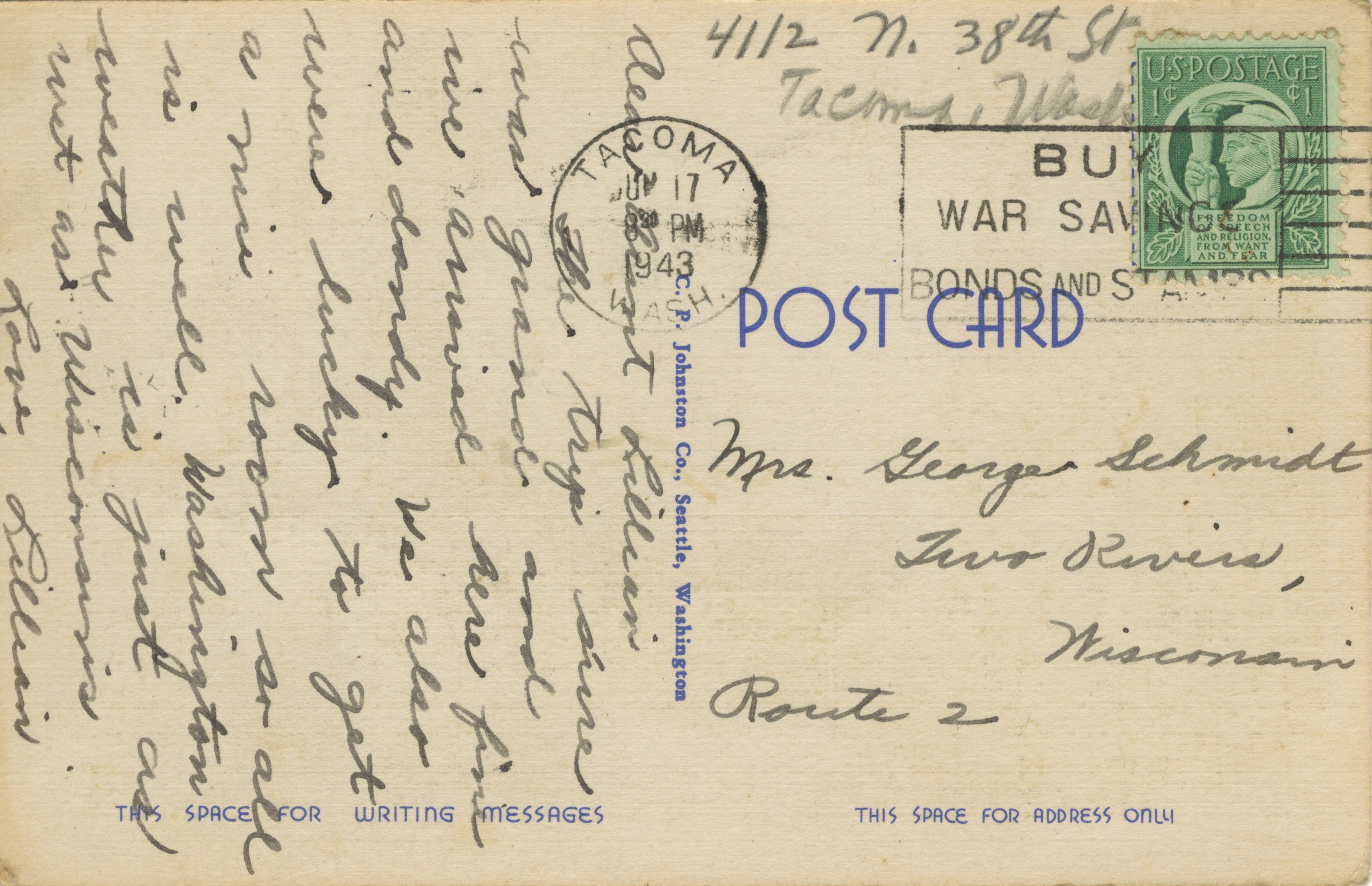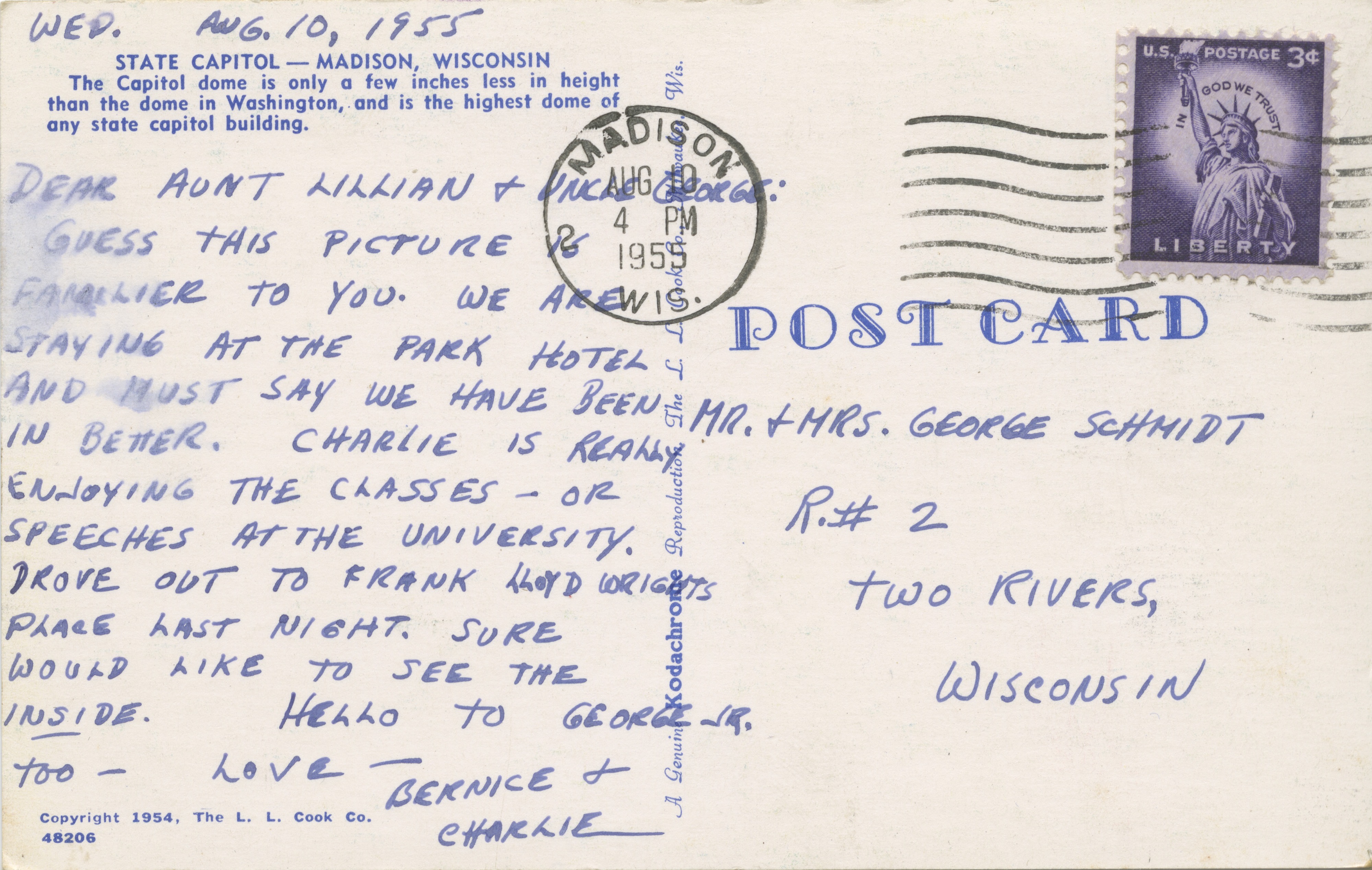 Tags: 1928, 1933, 1940, 1942, 1943, 1944, 1945, 1948, 1949, 1950, 1951, 1952, 1953, 1954, 1955, 1956, 1957, 1958, navy pier, postcard, american falls, key west, gladys simonek, badlands, north dakota, rapid city, south dakota, mount rushmore, oakdale park, salina, fort smith, mount vista, van buren, castle of rock, field museum, hancock, portage lake, hotel arthur, minnesota, rochester, bahia honda bridge, mercy hospital, st edwards, chimney rock, laramie, the hiker, sturgeon bay, michigan, saul ste marie, soo locks, nebraska, u.s. army, san rafael, mount rainier, cascade mountains, secretariat building, united nations, the ward hotel, door county, new york, fort ord, soldiers club, memorial bell tower, valley forge, washington memorial chapel, great smoky mountains, south haven, u.s. coast guard, newfound gap, state capitol, state teachers college, olympia, franconia notch, saint augustine, new hampshire, tacoma, west virginia, white sulphur springs, muntainburg, arkansas, memorial hall, oshkosh high school, colorado, manitou, williams canon, denver, denver public library, civic center, paradise inn, washington, maura manning, oshkosh public museum, radford hall, paradise valley, mississippi river, north platte, michigan avenue, mirror lake, william mueller, chicago, oshkosh, fox river, mayo clinic, riverside, pocahontas, california, wyoming, wisconsin dells, british columbia, louis meyer, grant park, stanley field hall, vancouver, florida, wrigley building, chloupek, george schmidt, george schmidt sr, goat island, lillian chloupek, luna island, lillian cootway, niagra falls