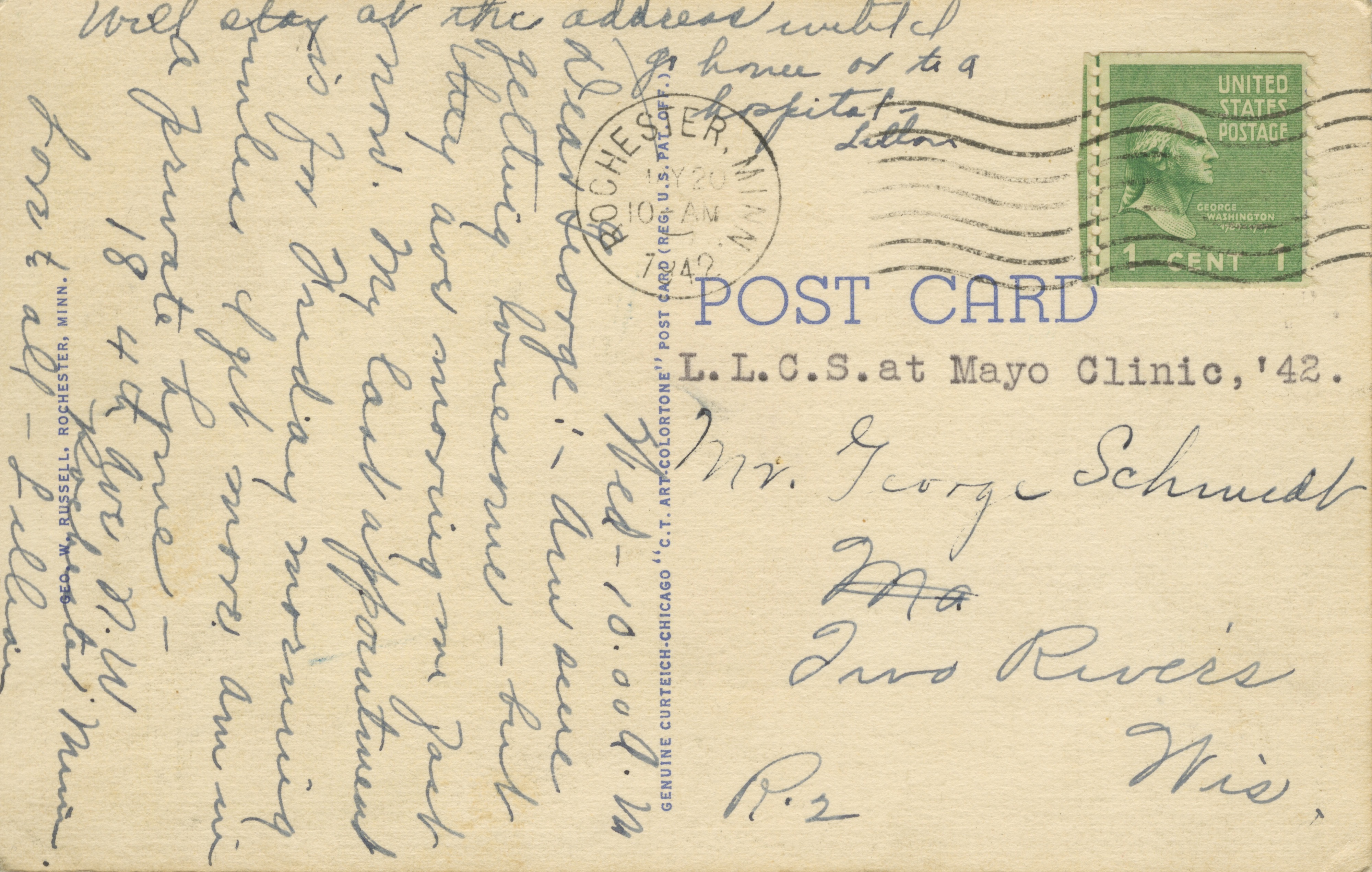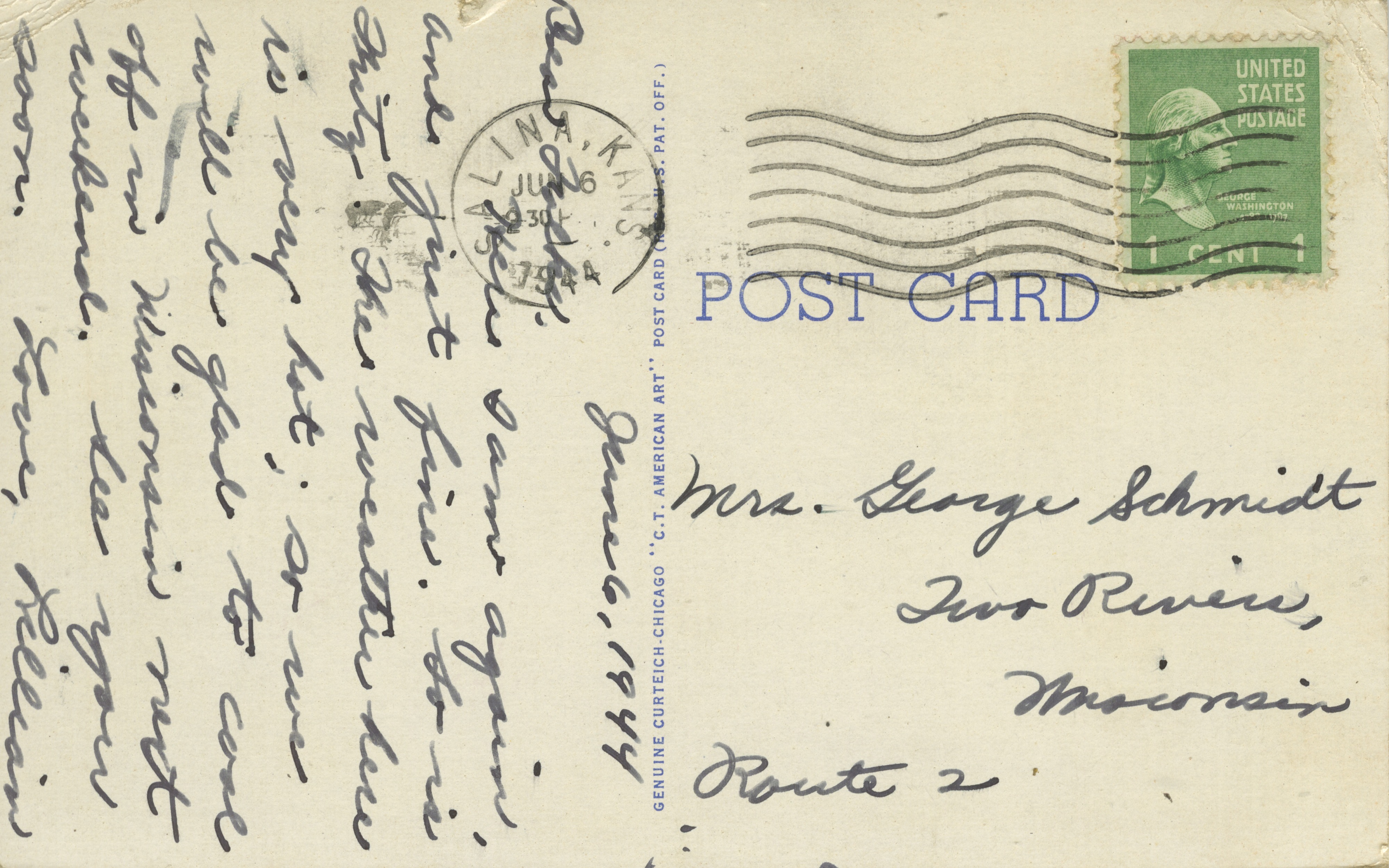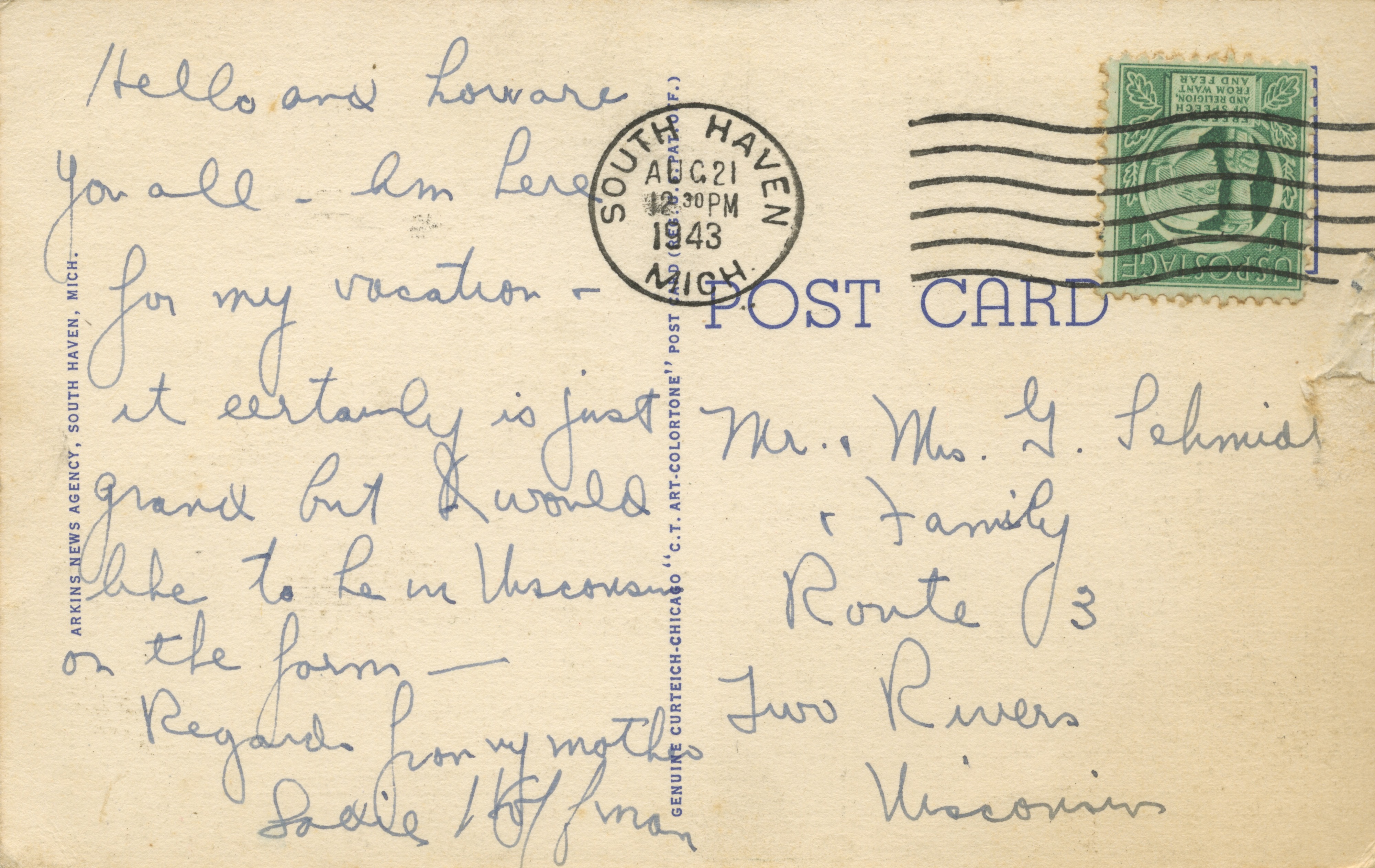 This is a portion of a large photo, postcard, and correspondence collection from the Schmidt and Chloupek families of Mishicot, Wisconsin. The majority of the correspondence in this set is addressed to George Schmidt Sr. (1887 – 1975) and Lillian Chloupek Schmidt (1888 – 1960). View George’s obituary here, and Lillian’s obituary here.