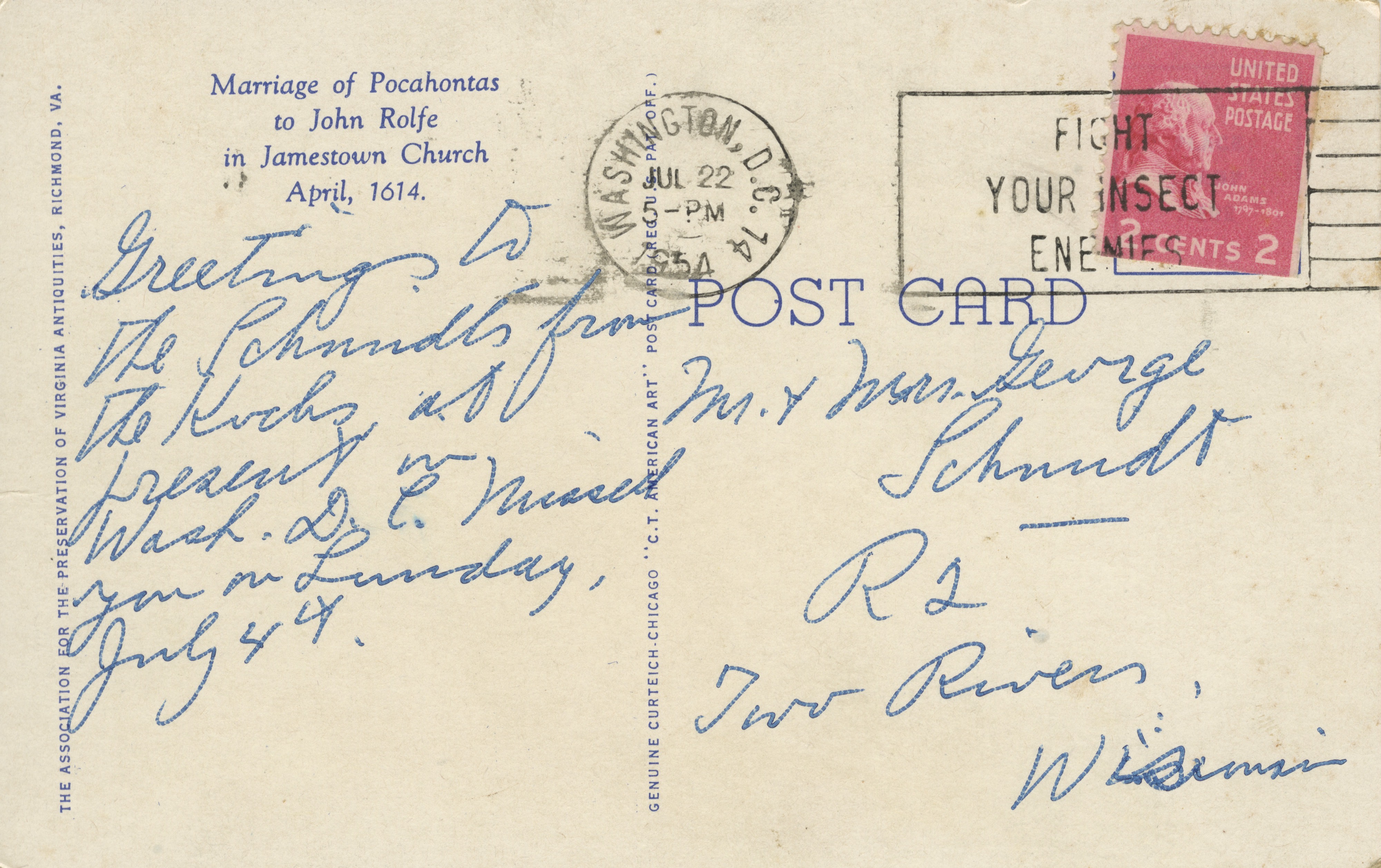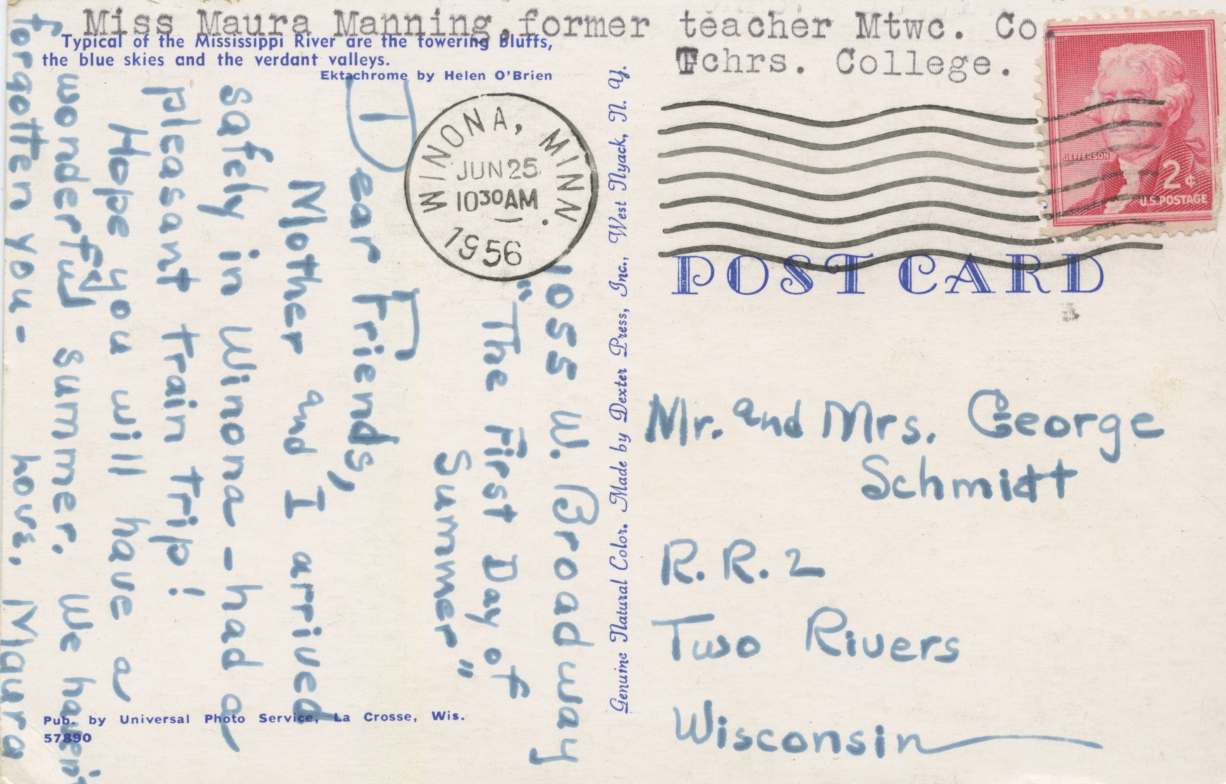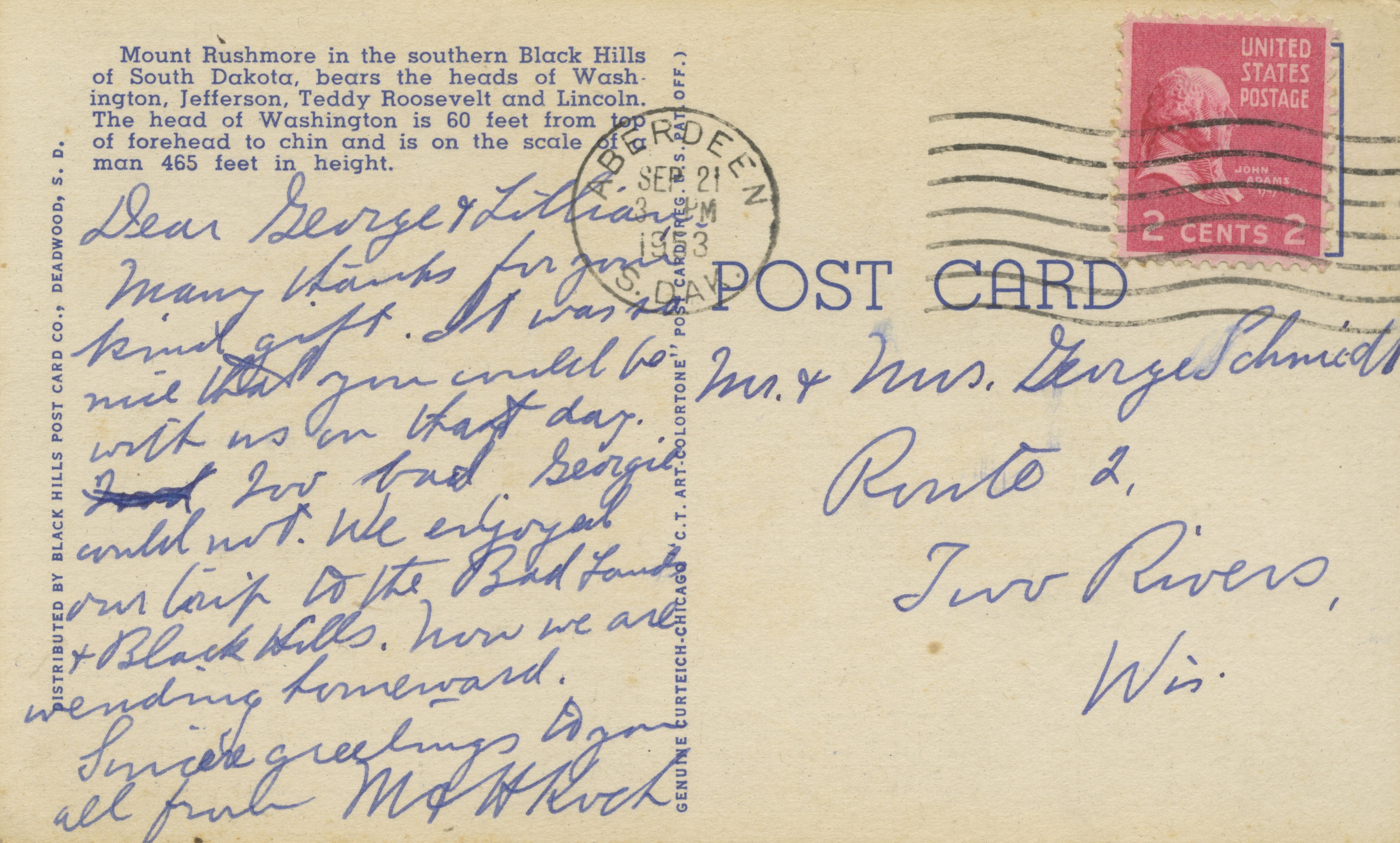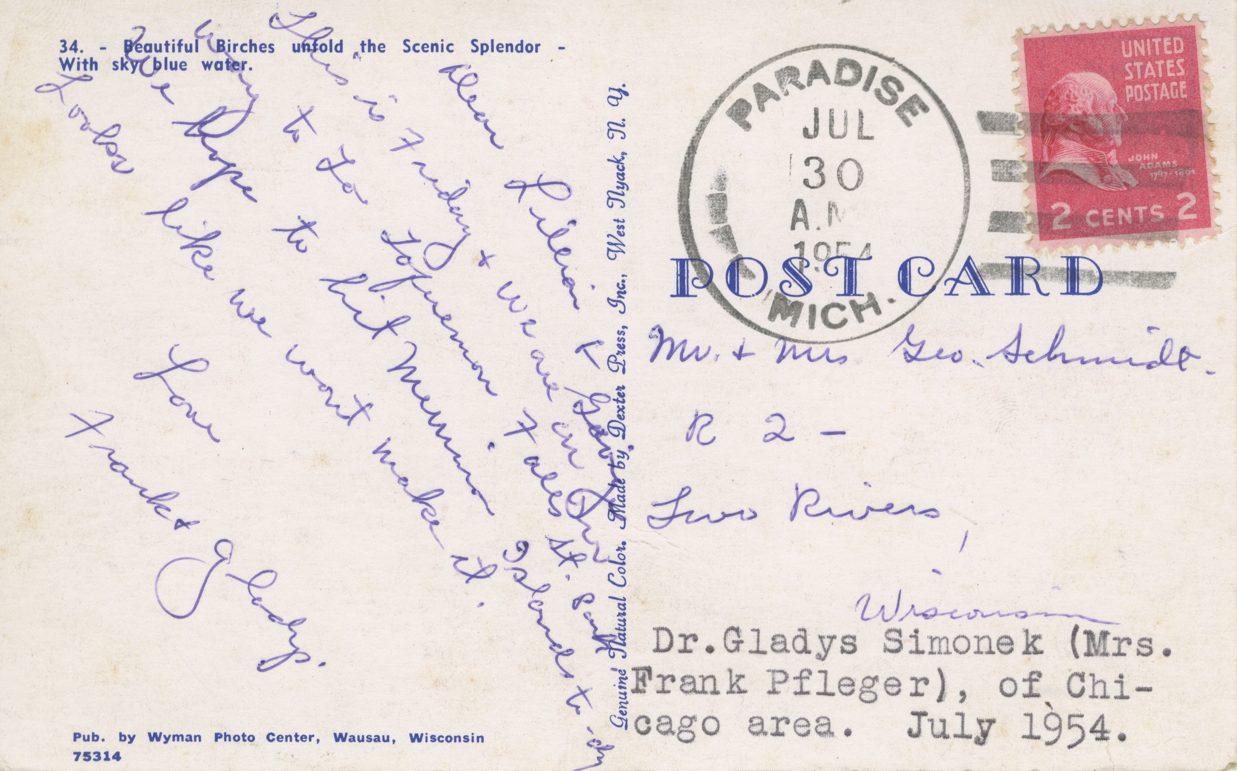 This is a portion of a large photo, postcard, and correspondence collection from the Schmidt and Chloupek families of Mishicot, Wisconsin. The majority of the correspondence in this set is addressed to George Schmidt Sr. (1887 – 1975) and Lillian Chloupek Schmidt (1888 – 1960). View George’s obituary here, and Lillian’s obituary here.