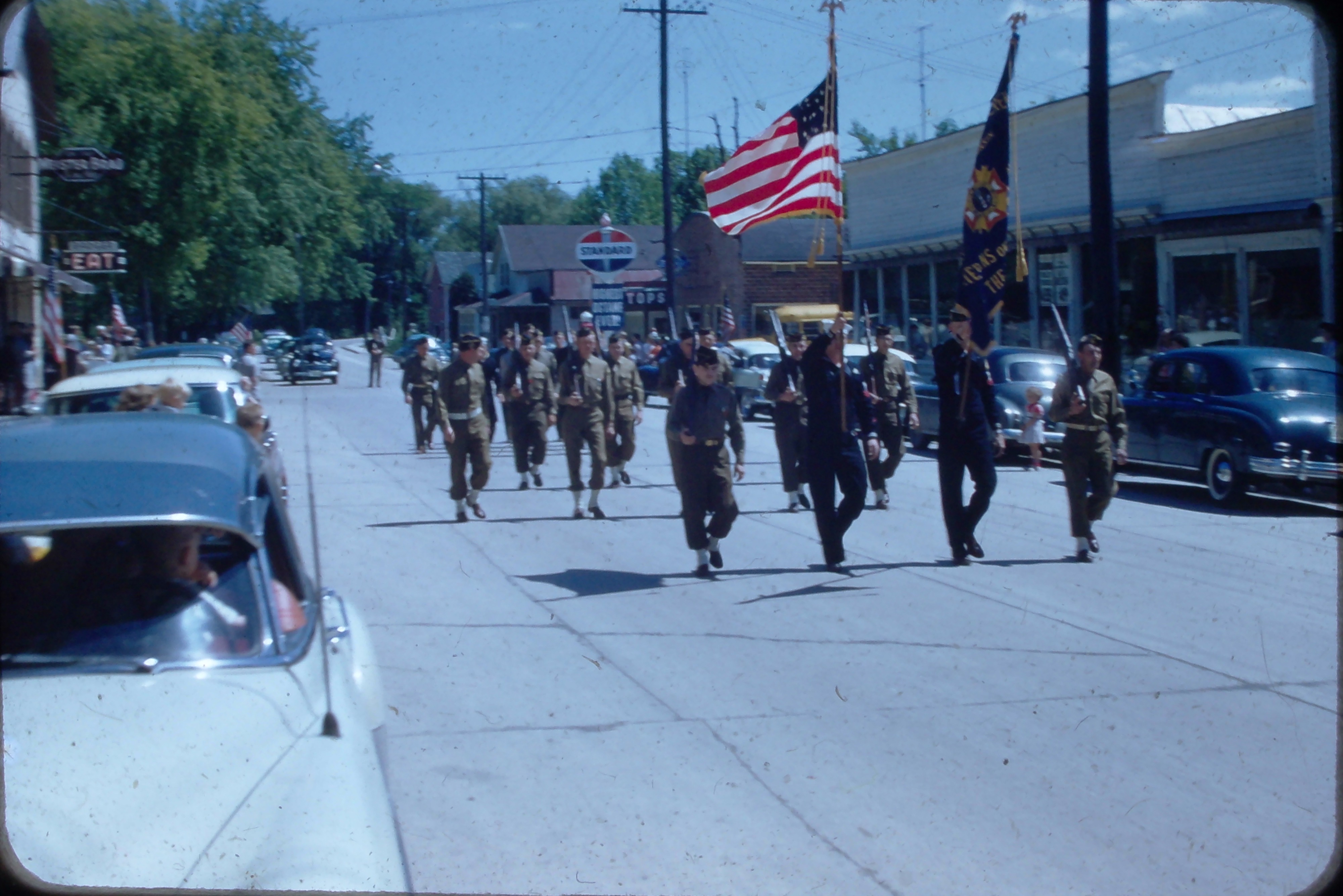 A photo of the 1955 Mishicot Memorial Day parade by Roy Jindra. The photo was captured looking southeast on Main Street in front of the Badger Bowl, 451 E. Main Street.